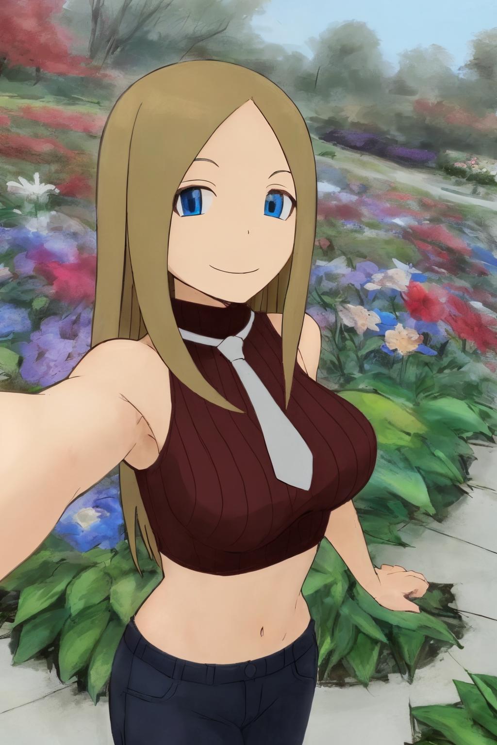 Full Outfit : bare shoulders, belt, blue eyes, bracelet, blonde hair, crop top, long hair, midriff, necktie, pants, sleeveless turtleneck