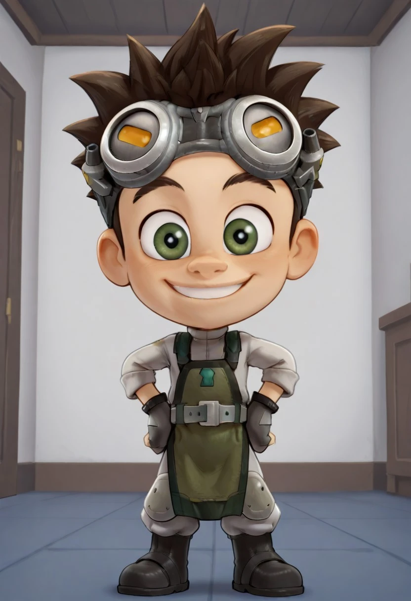 black fingerless gloves, green apron, grey belt, light grey jumpsuit, light grey lederhosen, knee padding, black boots, googles, goggles on head