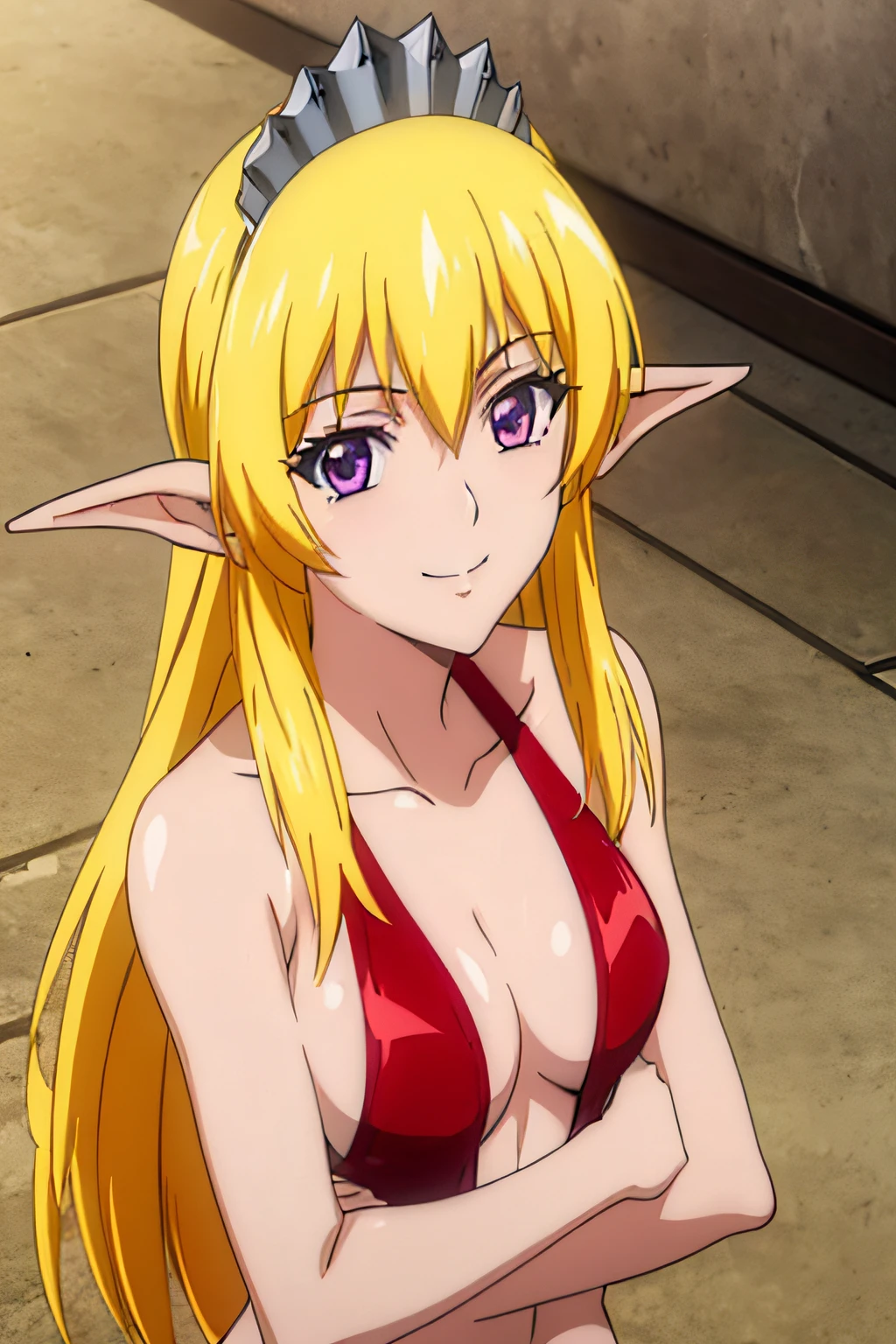 NinaAslato, 1girl, elf, pointy ears, blonde hair, long hair, purple eyes, jewelry, tiara,