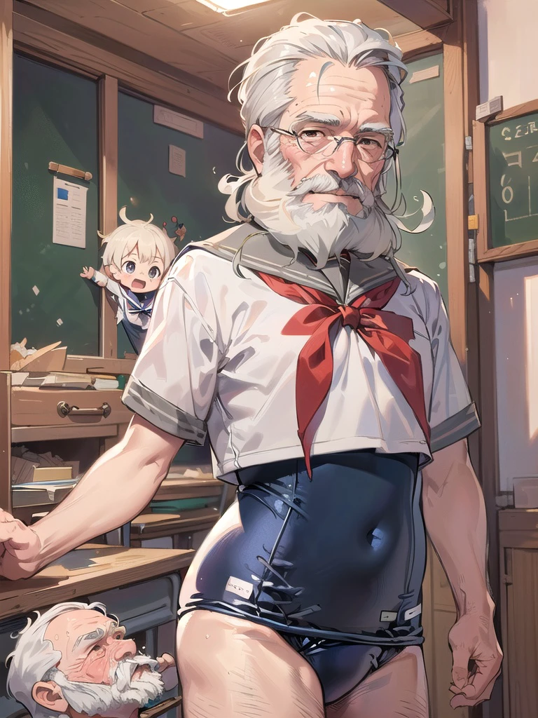 生成的图像描绘了一个穿着水手服的人在校服泳装上面。