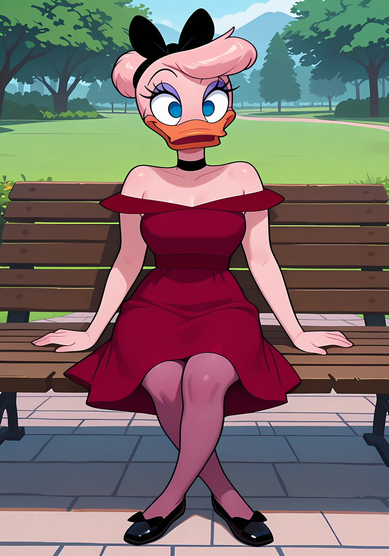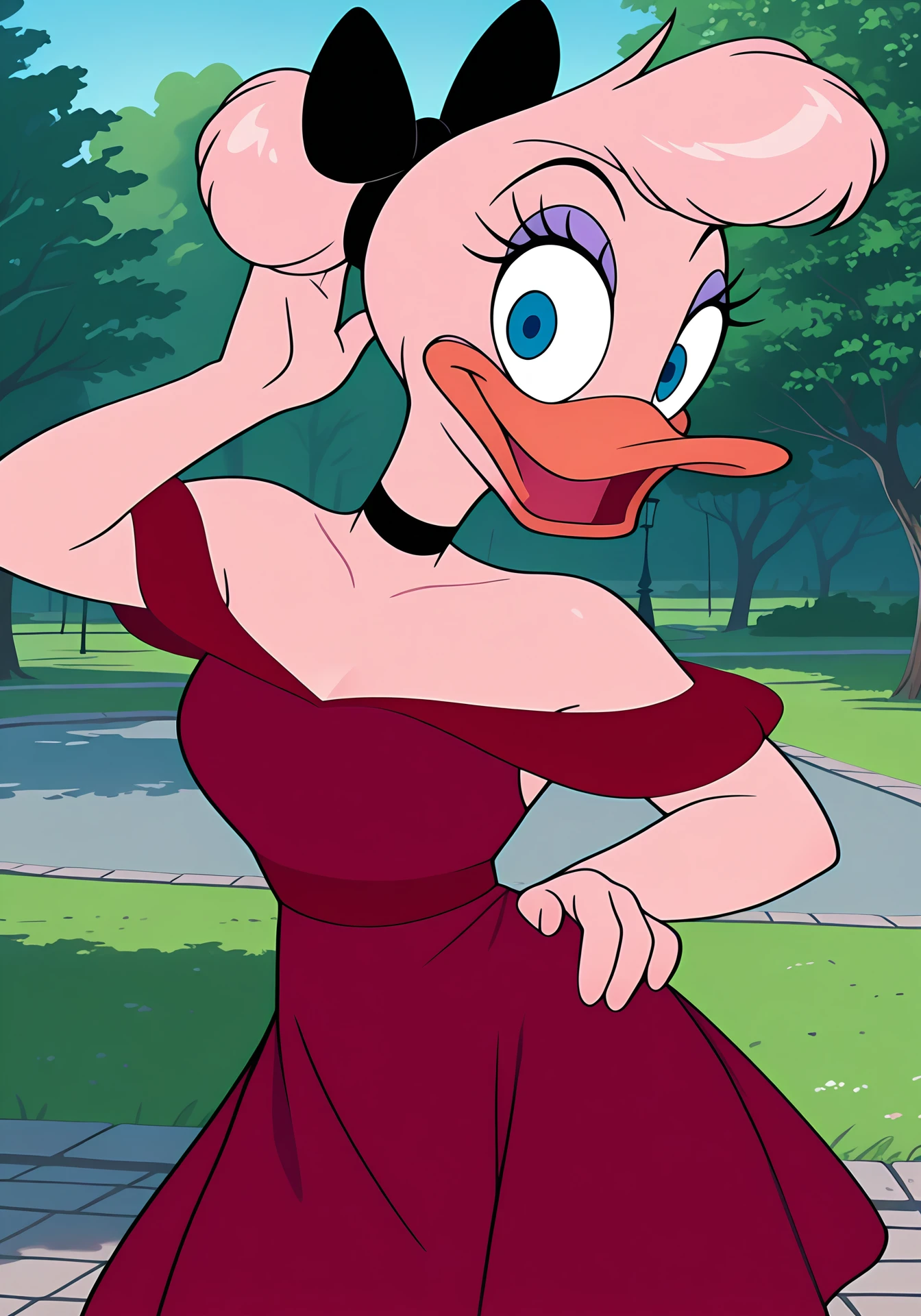 Not a fan of Daisy Duck usually, but I like this design. She doesn't have her ass sticking out in that weird feather skirt. She looks a lot more anthro than usual thanks to her outfits and no duck feet. Probably the only time she's ever had cleavage. For some reason she also has pink skin/feathers.