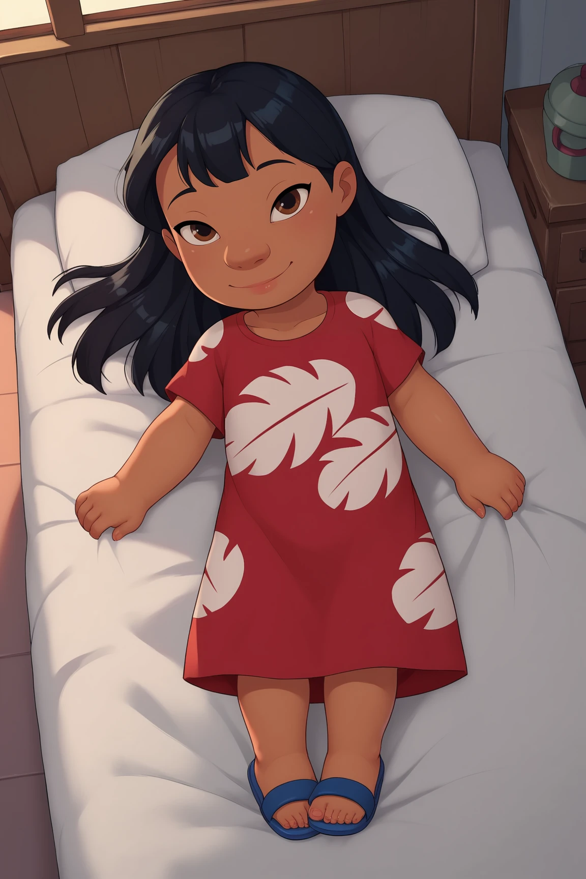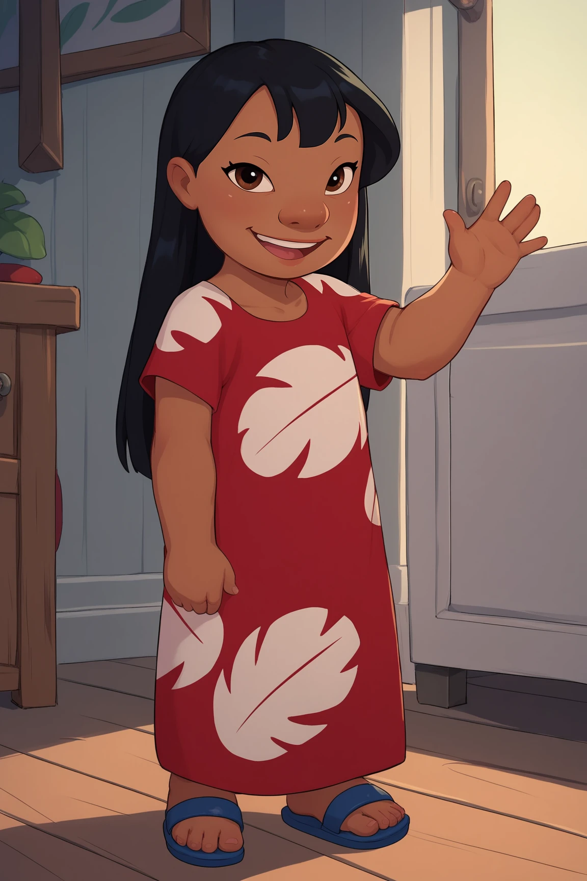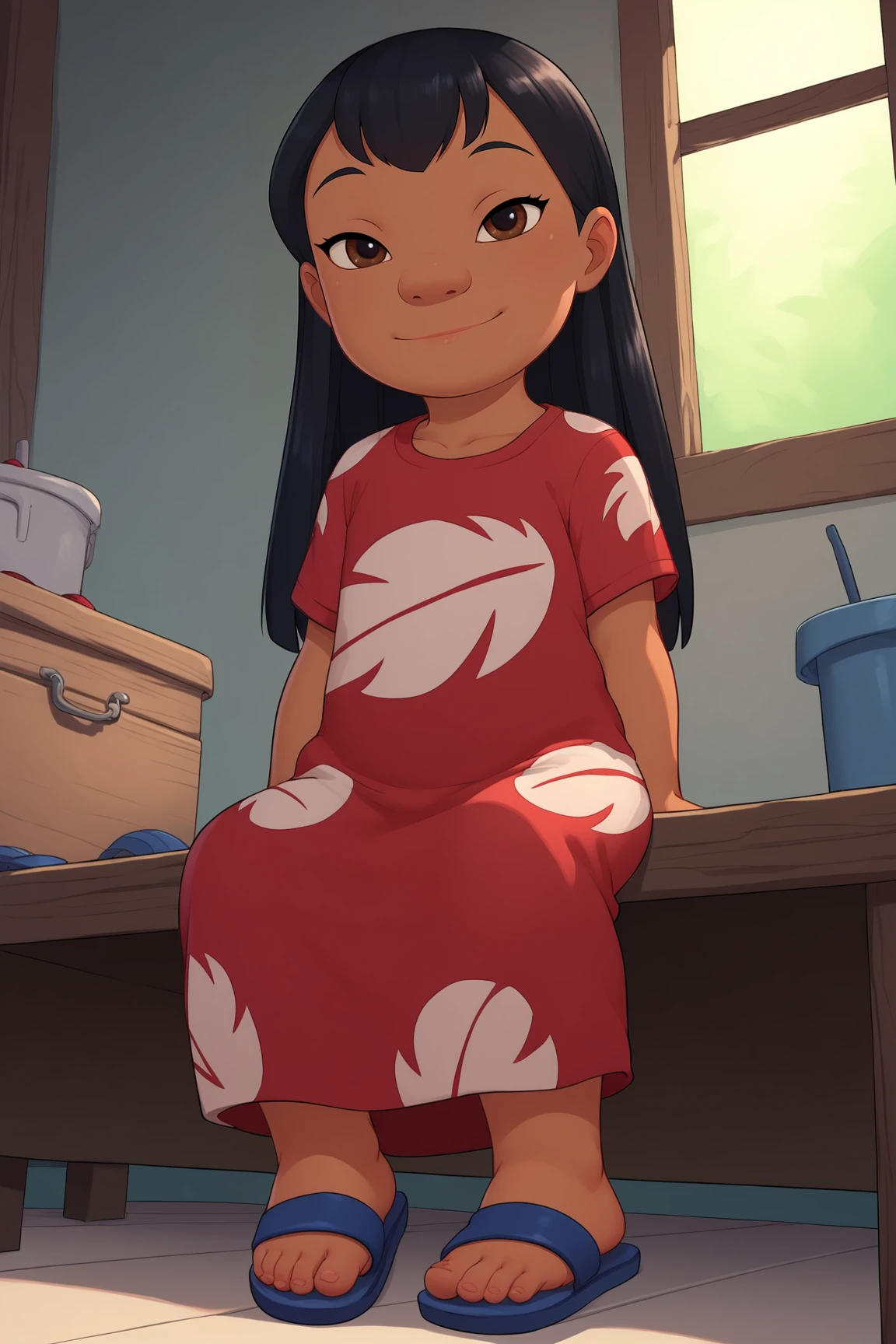 LiloLSXL, child, dark skin, brown eyes, black hair, long hair, bangs, flat chest, red dress, short sleeves, blue sandals