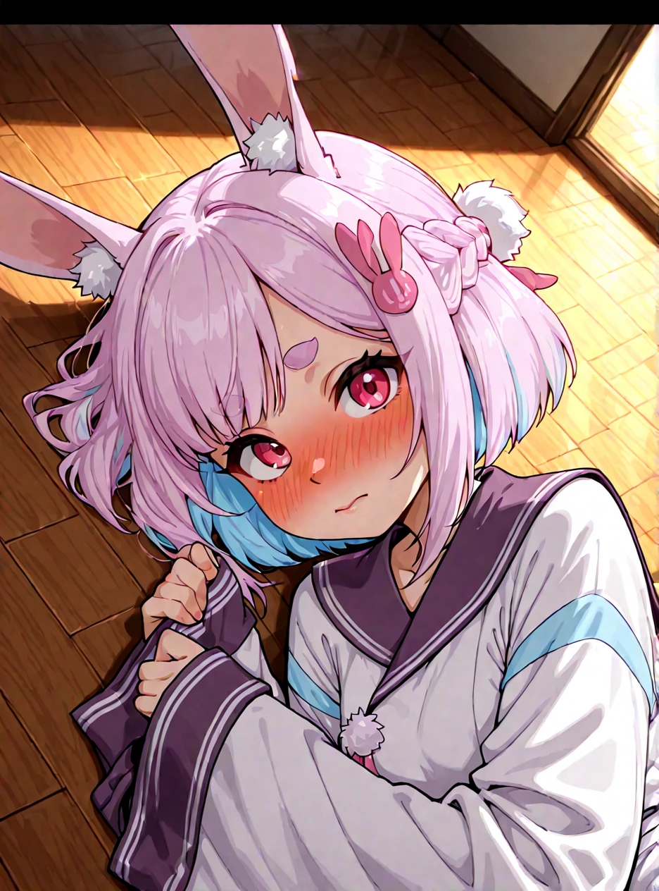 rabbit ears,braid,multicolored hair,short hair,pink eyes,sleeves past wrists,sailor collar,rabbit hair ornament,wide sleeves,purple skirt,white pantyhose