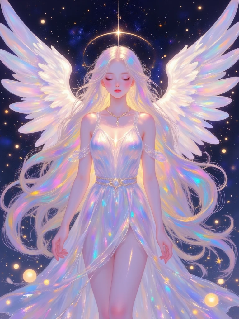 this digital artwork features a futuristic, angelic warrior with a humanoid robotic physique, the character has large, luminous, rainbow-colored wings and wears a sleek, metallic armor with intricate golden accents, the armor covers the chest, shoulders, and arms, with visible joints and mechanical details, the warriors helmet has pointed, golden, wing-like extensions, the background is a dreamy, pastel-colored gradient with floating particles, adding a celestial feel, the characters left arm is extended forward, while the right arm is slightly back, creating a dynamic, forward-moving pose, the overall style is vibrant and highly detailed, with a blend of sci-fi and fantasy elements