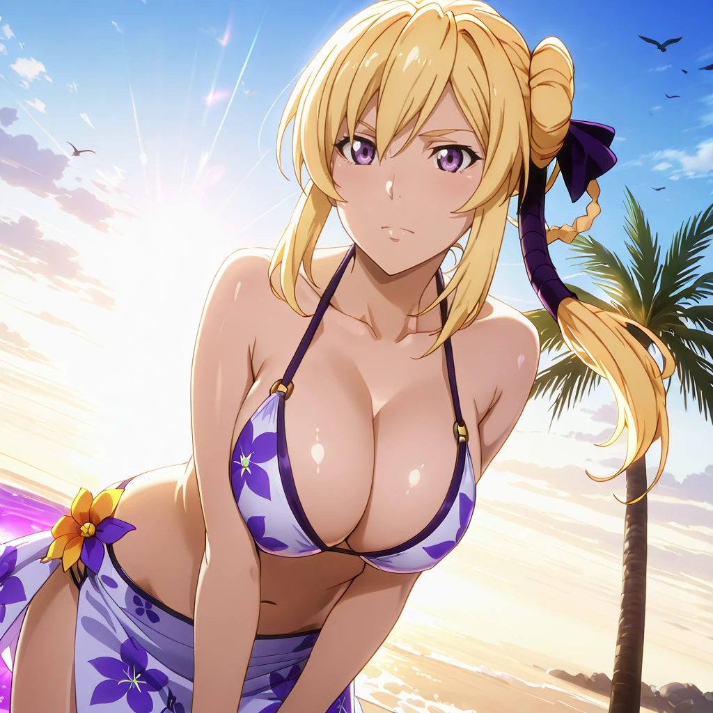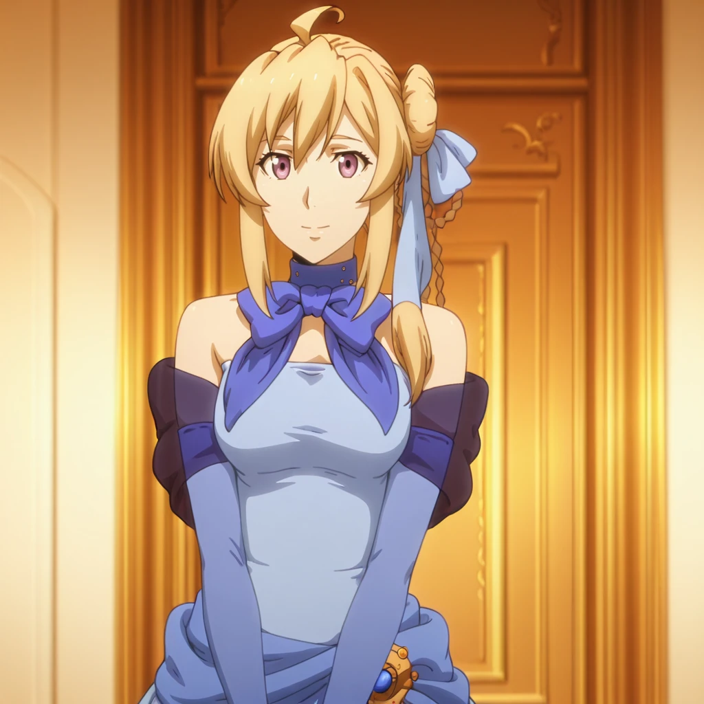 Trigger with blue dress: SilucaBlueDress, 1girl, screencap, blonde hair, dress, elbow gloves, bow, hair ribbon, purple eyes, side ponytail, breasts, long hair, photoshop (medium), cowboy shot