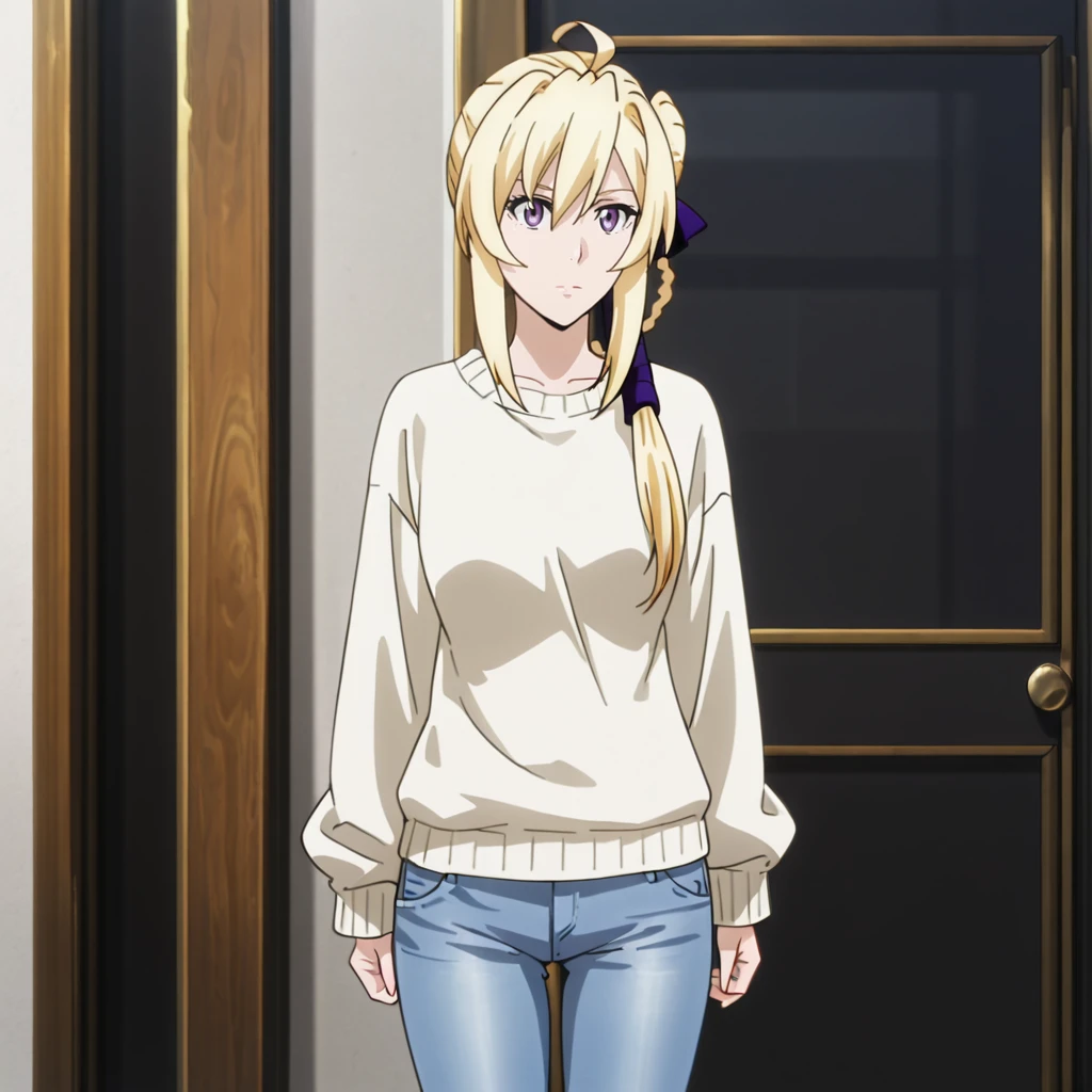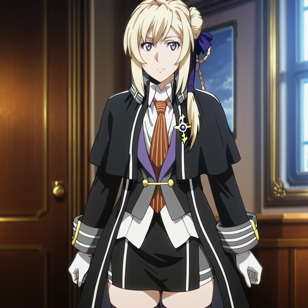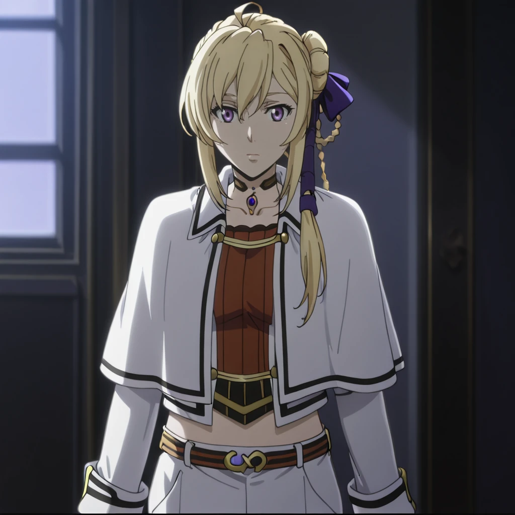 Trigger with white jacket:SilucaWhiteJacket, 1girl, blonde hair, purple eyes, screencap, long hair, braid, purple ribbon, belt, hair ribbon, collarbone, capelet, white pants, long sleeves, shirt, skirt, bow, third-party edit, blue ribbon, cowboy shot