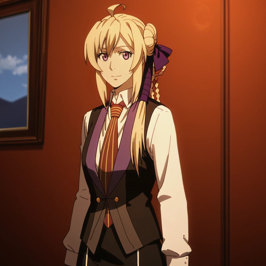 Trigger with tie without coat: SilucaTieWithoutCoat, 1girl, braid, purple eyes, necktie, blonde hair, hair ribbon, long hair, vest, photoshop (medium), cowboy shot