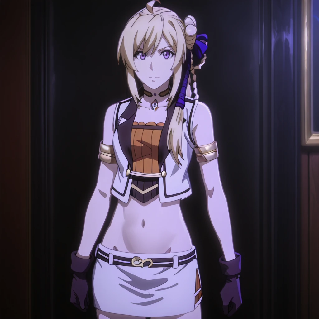 Trigger without jacket: SilucaWithoutJacket, 1girl, white skirt, midriff, screencap, blonde hair, navel, miniskirt, purple eyes, black gloves, choker, long hair, stomach, third-party edit, photoshop (medium), collarbone, groin, hair bun, side ponytail, armlet