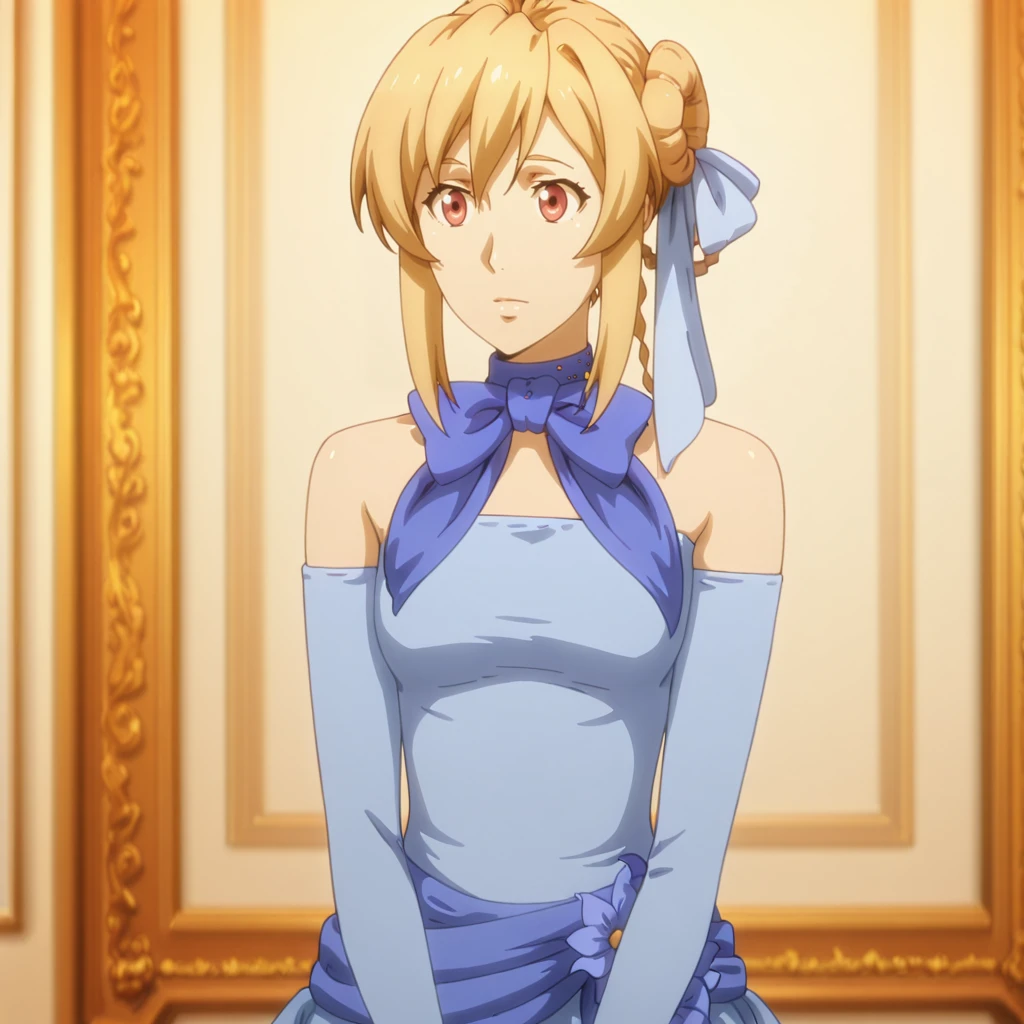 Trigger with dress: SilucaDress, 1girl, blue dress, blonde hair, bare shoulders, hair ribbon, bow, screencap, detached sleeves, flower, hair ornament, red eyes, short hair, photoshop (medium), cowboy shot