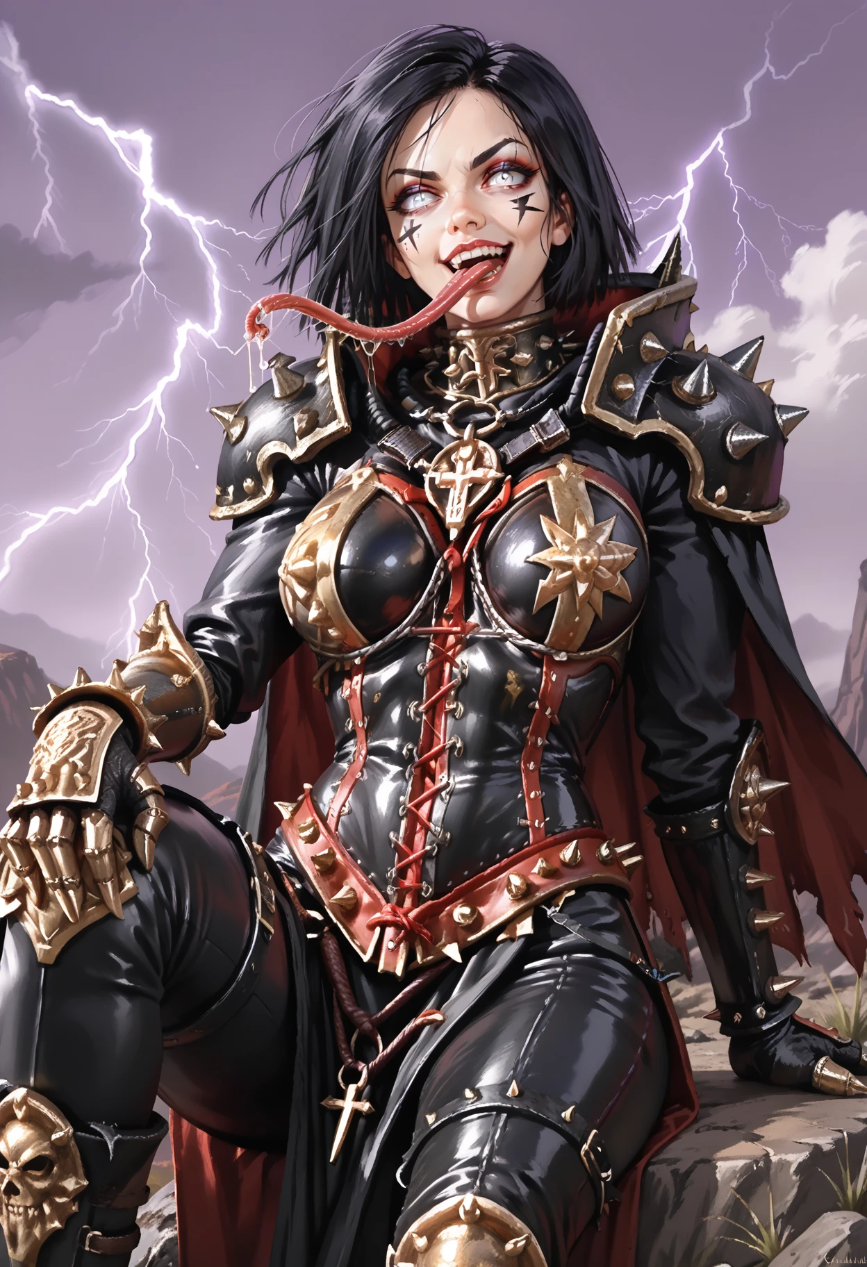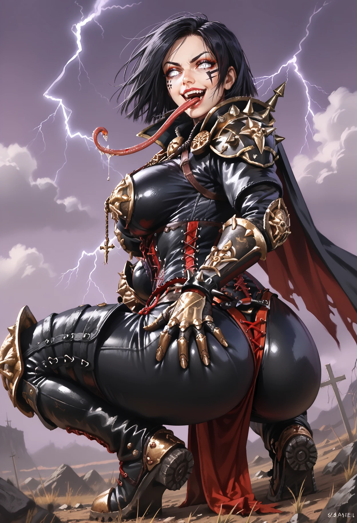 MiriaelSabathiel, 1girl, black hair, short hair, white eyes, no pupils, eyeshadow, large breasts, mature female, Optional