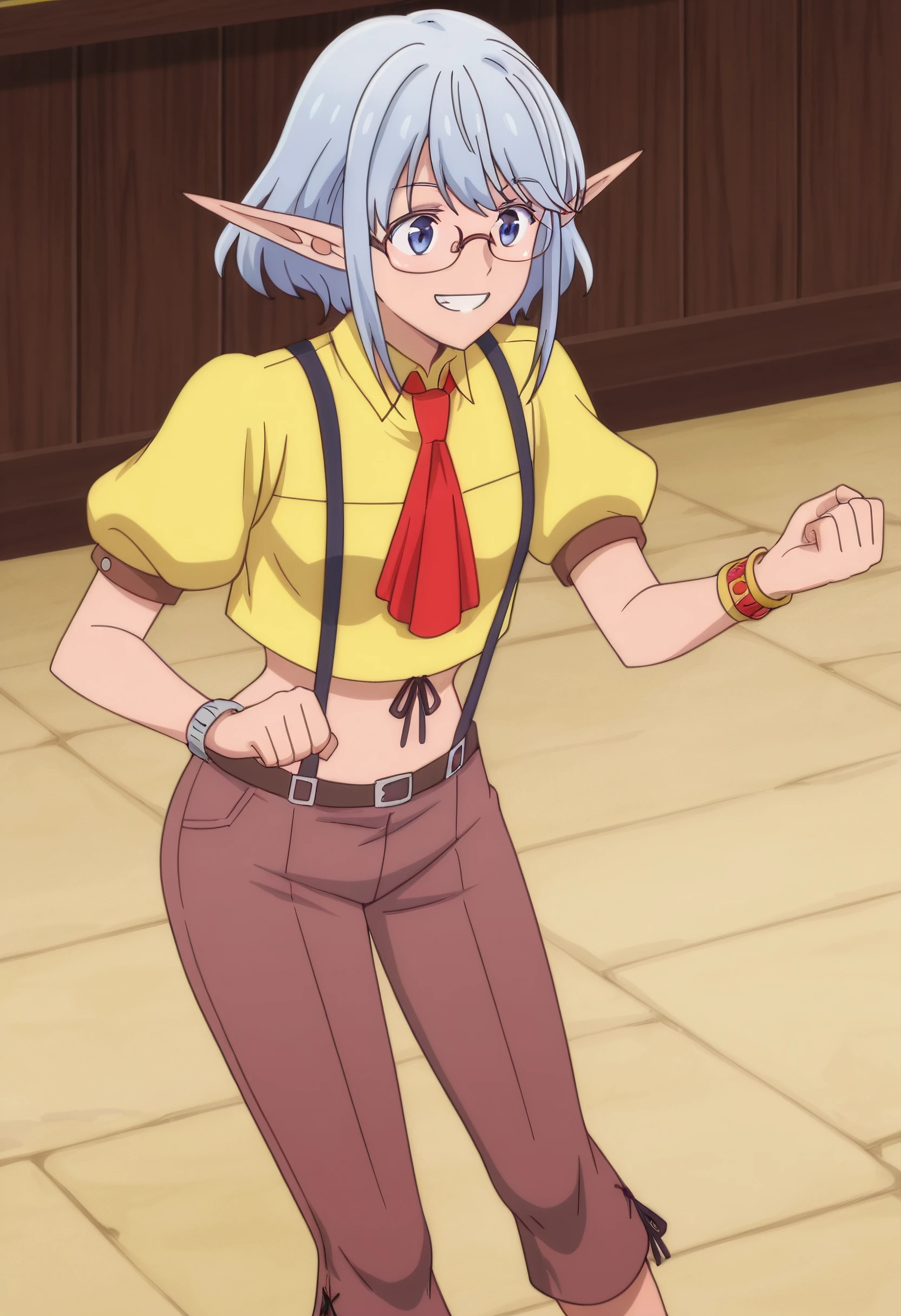 EmleOutfit, shirt, suspenders, short sleeves, puffy sleeves, collared shirt, midriff, crop top, yellow shirt, puffy short sleeves, ascot, pants, red necktie, belt, necktie, bracelet, brown pants, capri pants, shoes, cropped shirt,