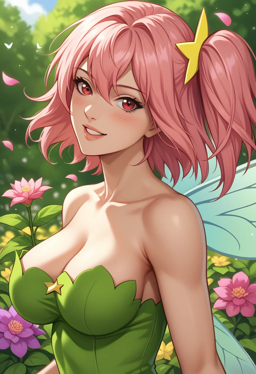 Ipusiron, Pink Hair, Short Hair, Side Ponytail, Star Hair Ornament, Red Eyes, Cleavage, Bare Shoulder Low-Cut Green Dress, Fairy Wings, 4 Fairy Wings,