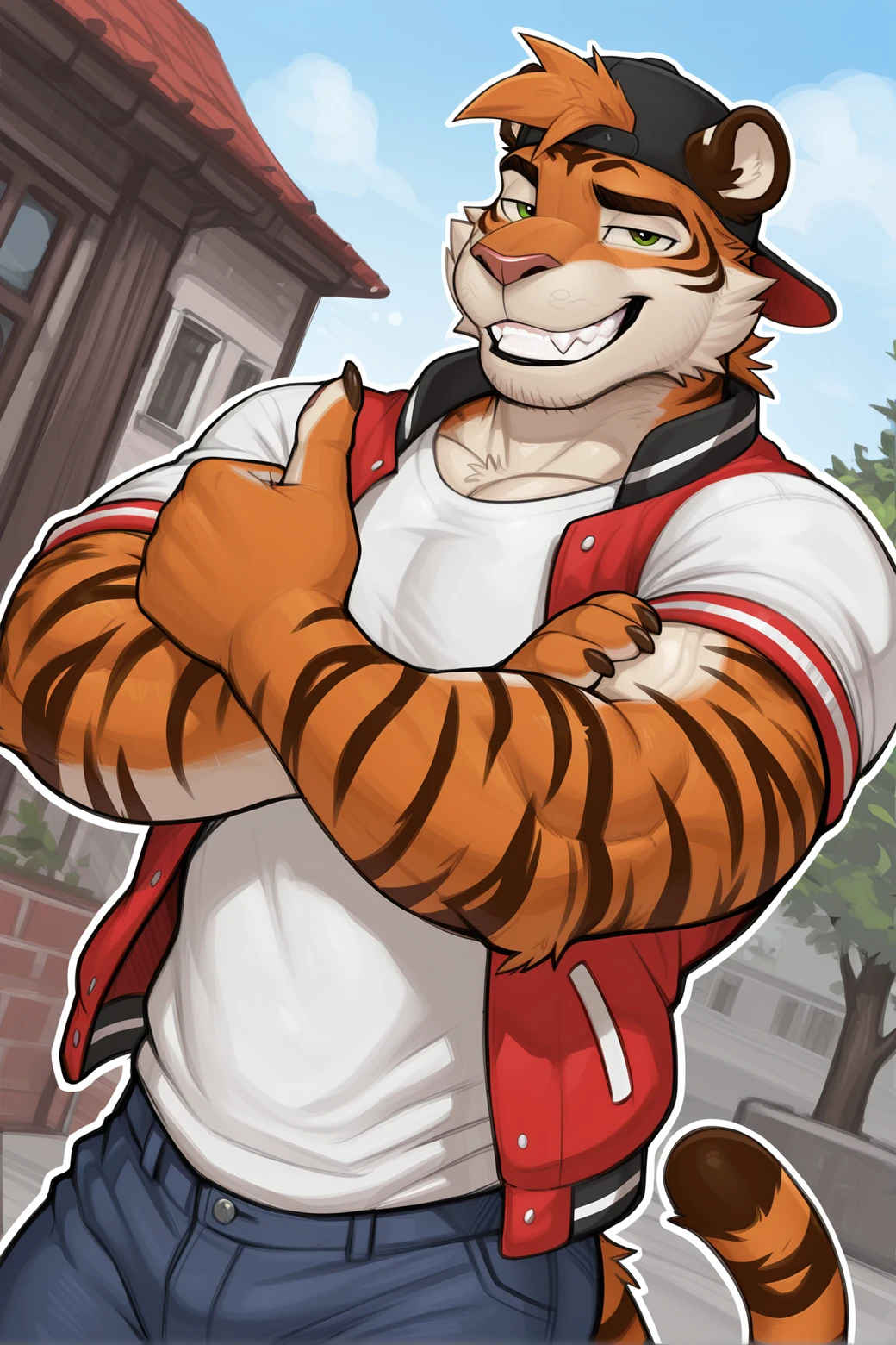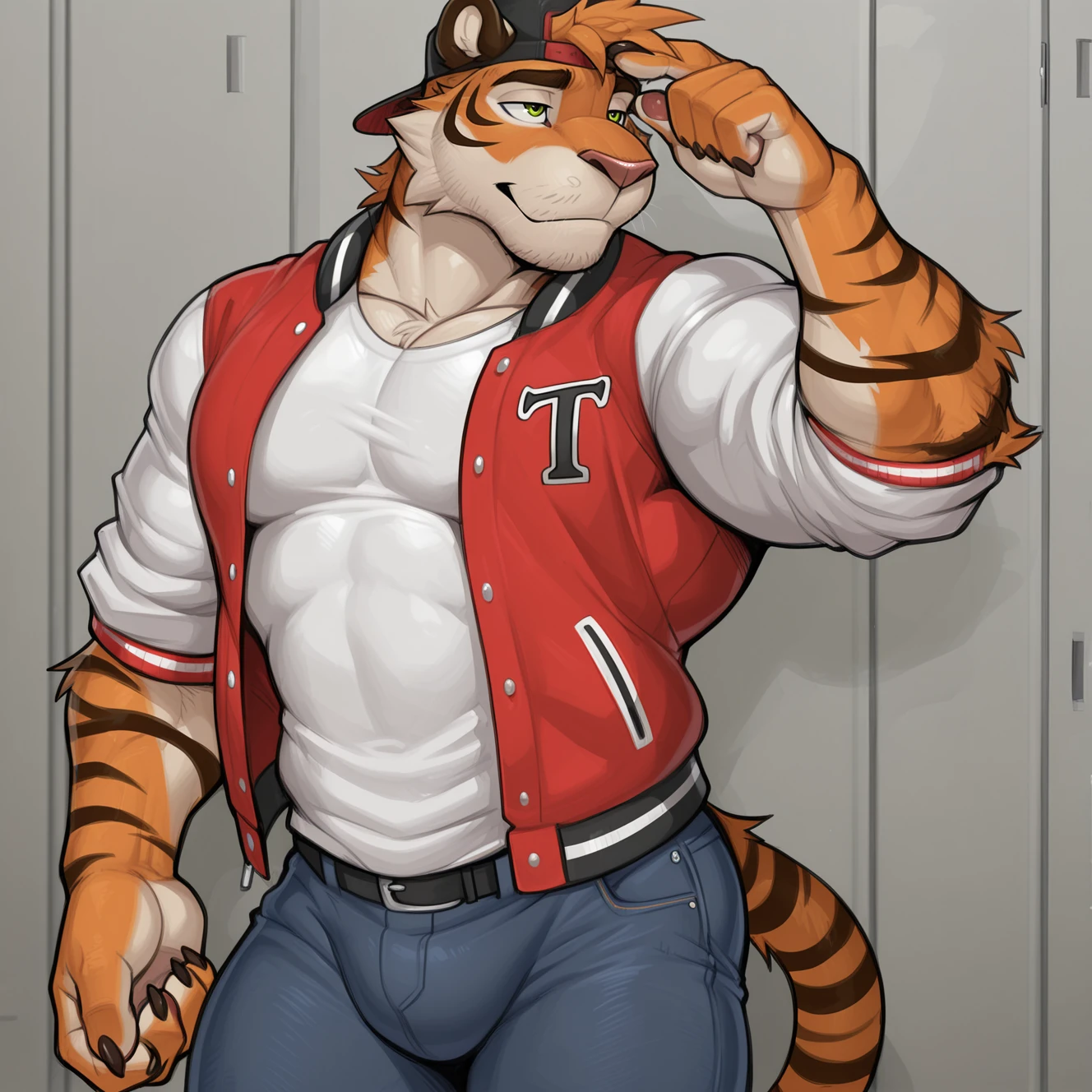 tyl3r_j4ck018, male, solo, green eyes, eyeliner, anthro, tiger, two tone body, white countershading, orange body, striped body, medium hair, swept bangs, muscular male, 5 fingers, finger claws, black lips, feline tail,