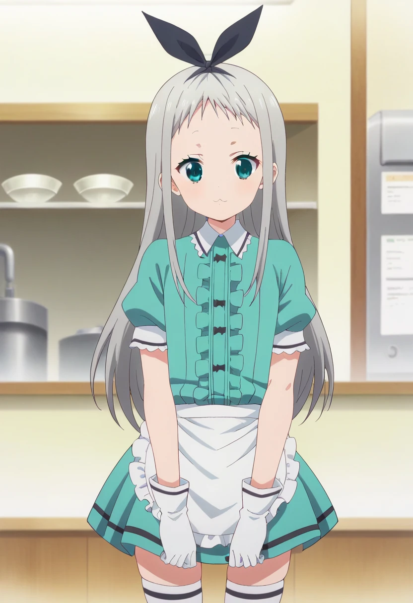 Waitress Outfit - frills, puffy sleeves, white gloves, black footwear, apron, white thighhighs, puffy short sleeves, black hairbow, waist apron, white apron, crossdressing, frilled apron, center frills, waitress,