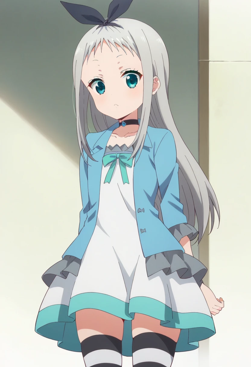 Casual Outfit - white dress, skirt, bow, ribbon, black hairbow, choker, striped, zettai ryouiki, cosplay, otoko no ko, striped thighhighs, blue jacket, open jacket,