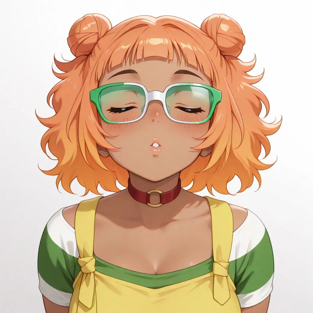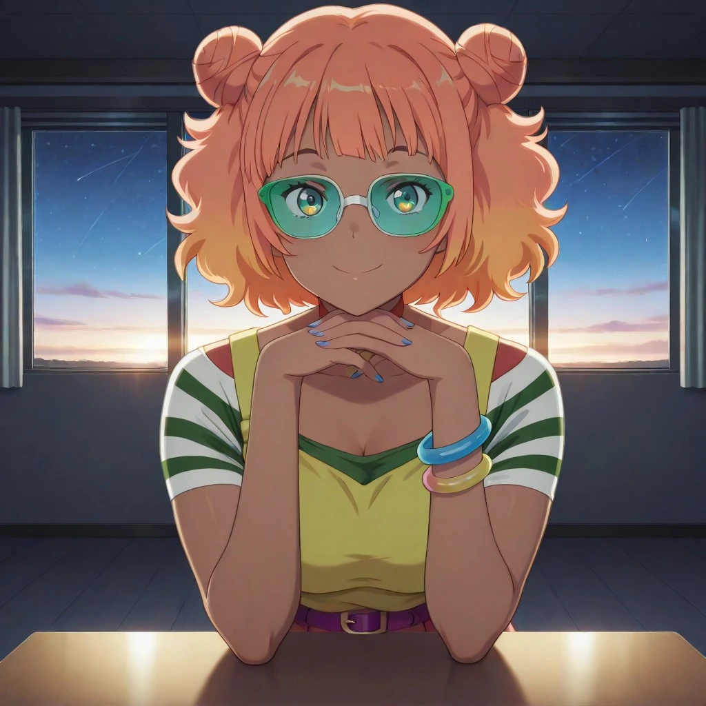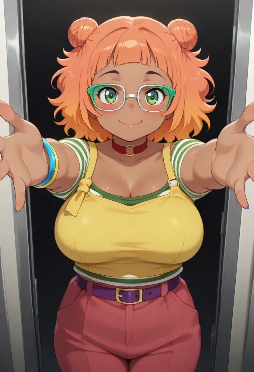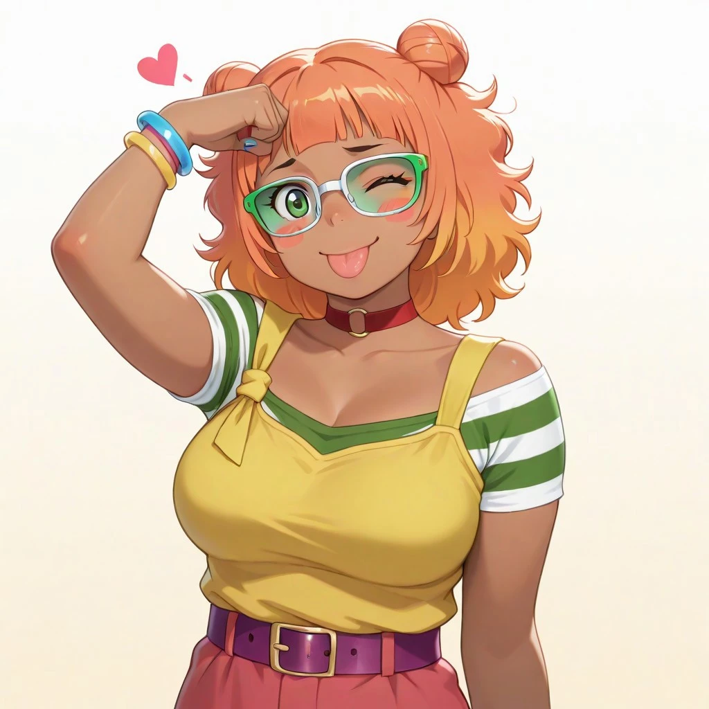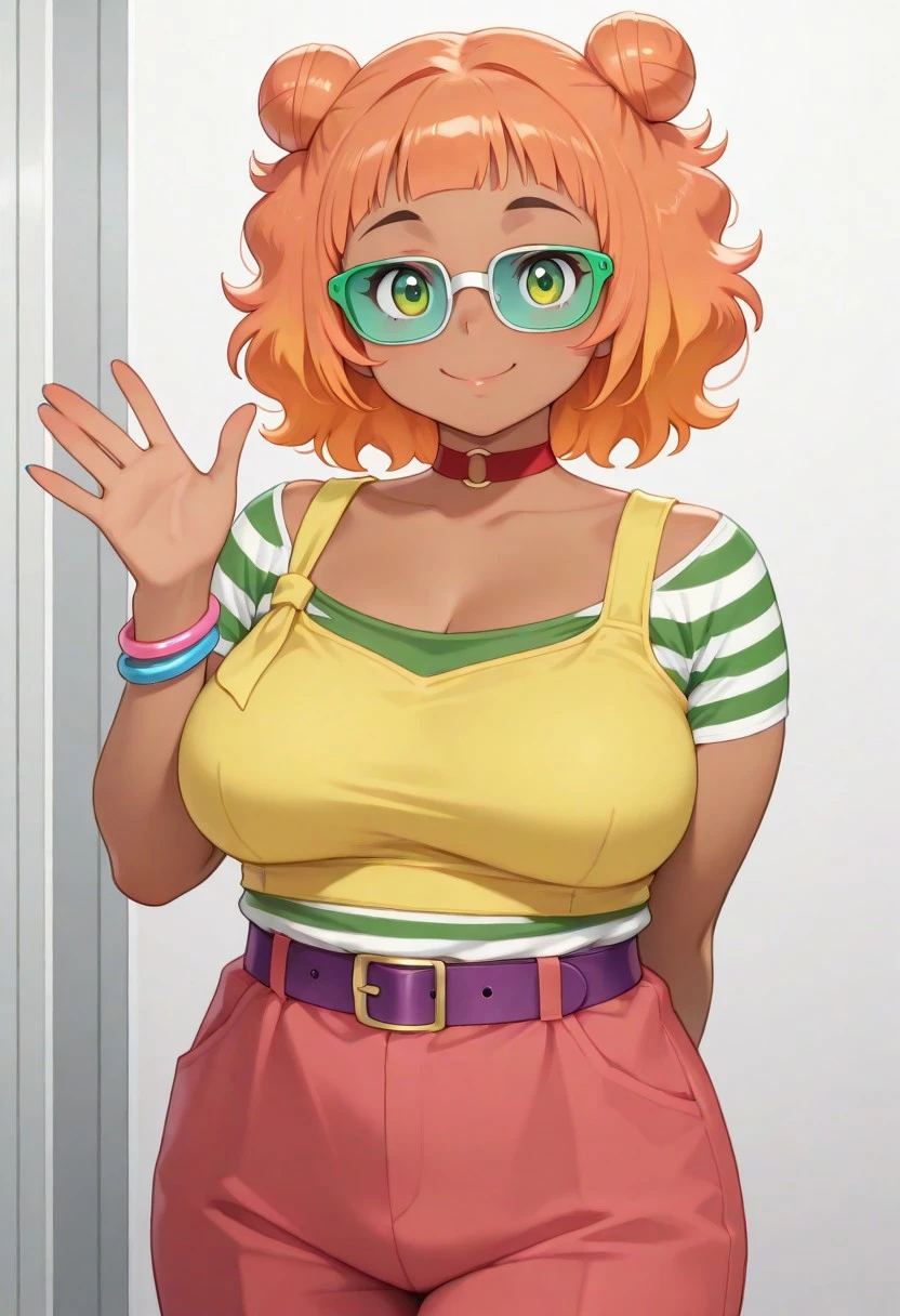Curvy, Short curly orange and yellow gradient messy hair, styled with space buns, dark skin tone, large rectangular-framed green lenses glasses, short-sleeved black and white striped undershirt, Bright yellow top, dark red choker, blue nails, colorful bracelets on right wrist, loose-fitting salmon-colored pants with rolled-up cuffs, purple belt with square buckle, white socks, open-toed sandals with green straps,
