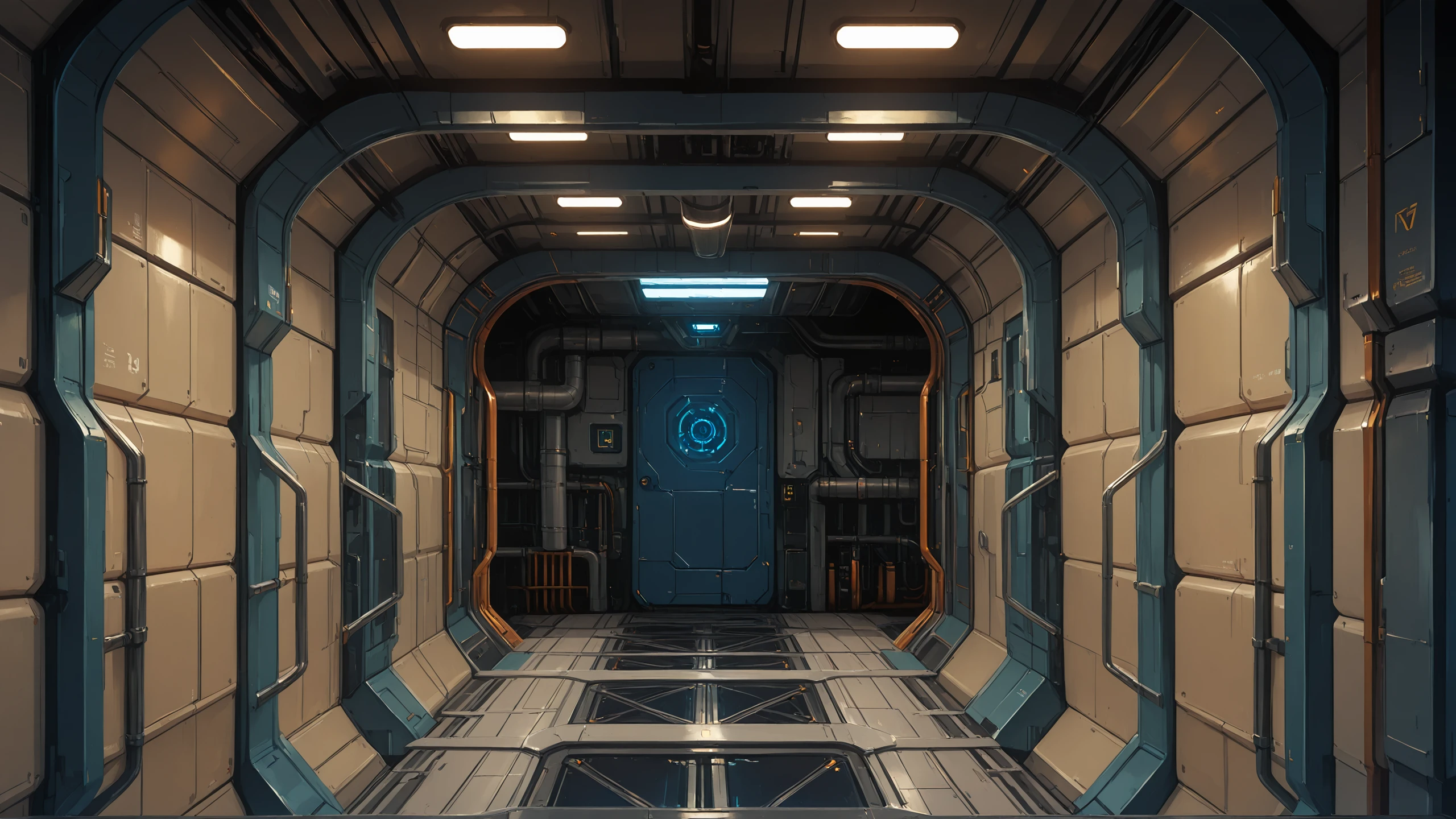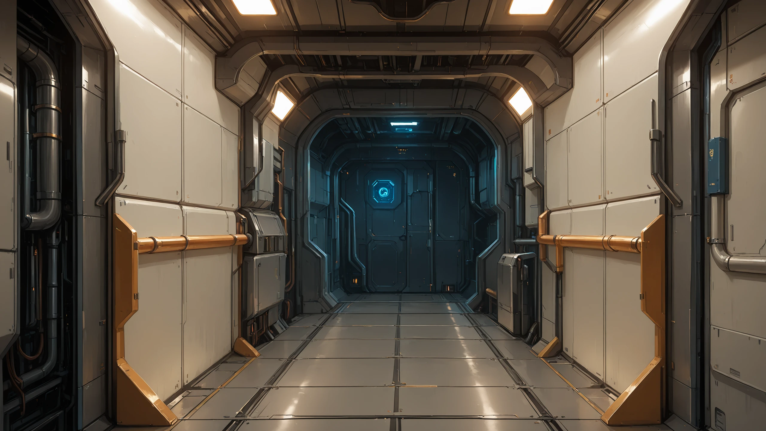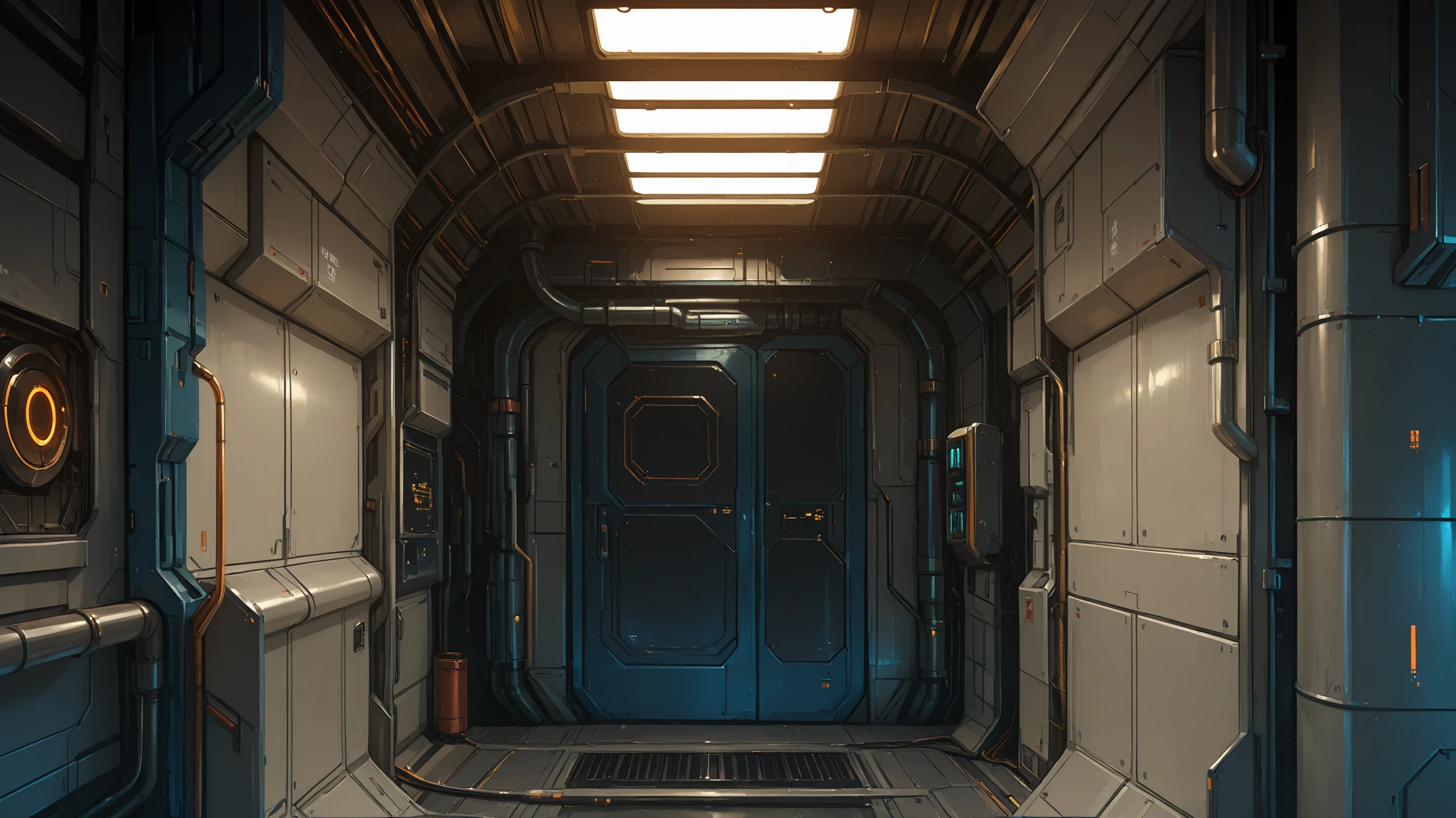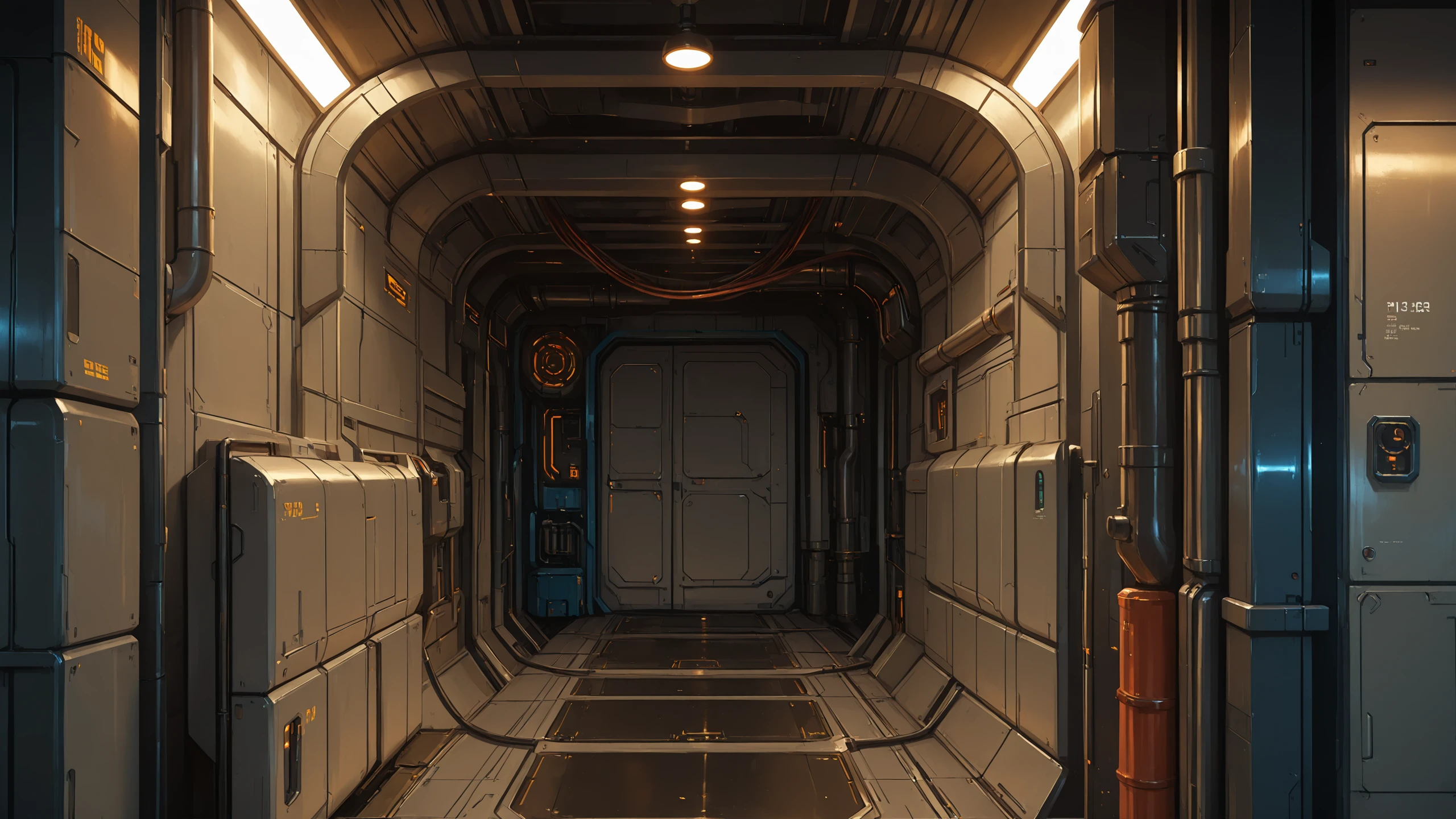 science fiction, no humans, indoors, industrial pipe, cable, ceiling light, door,