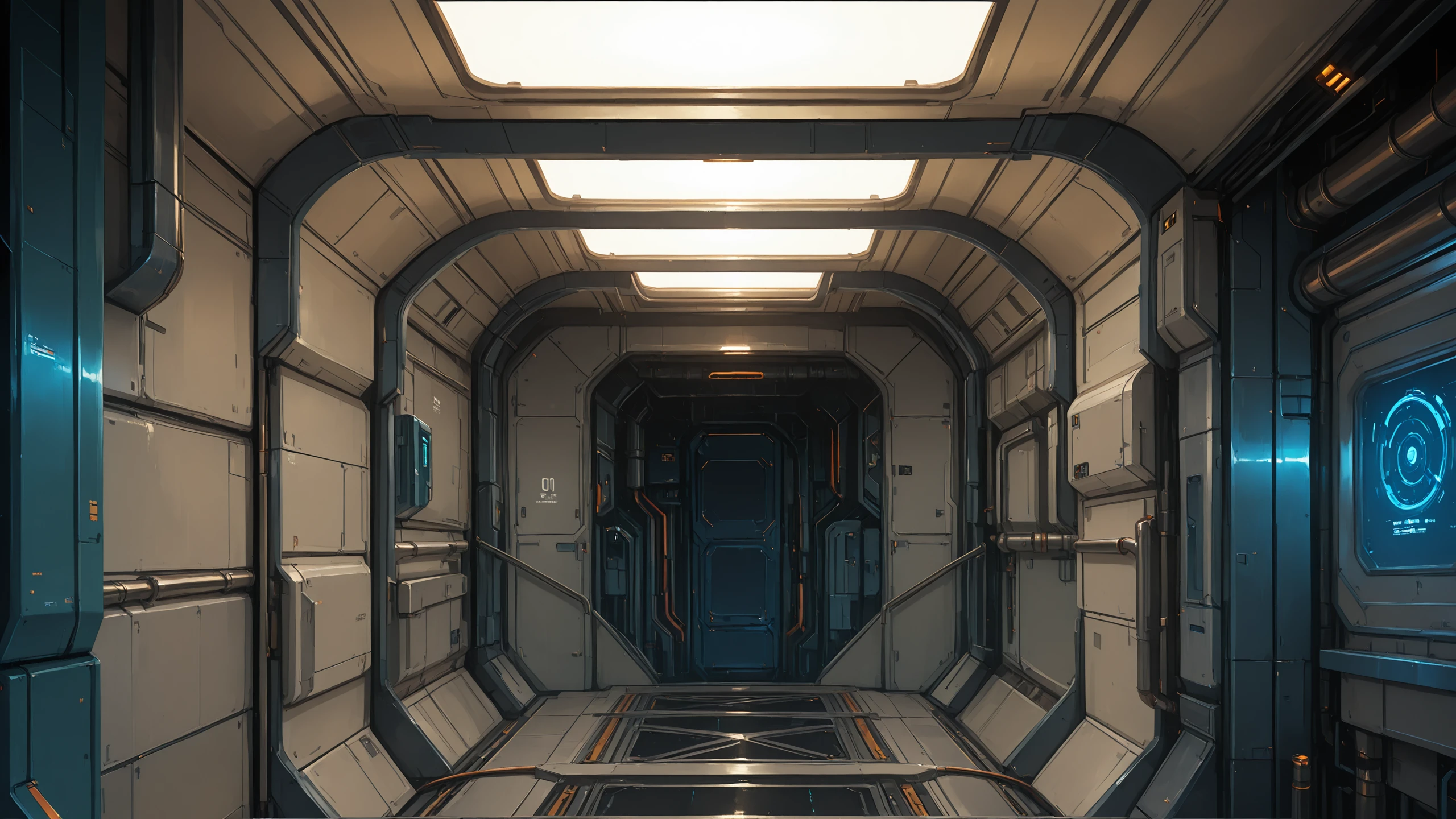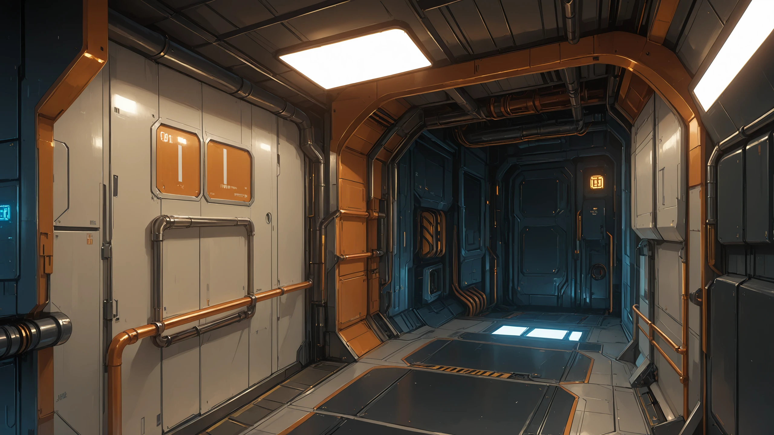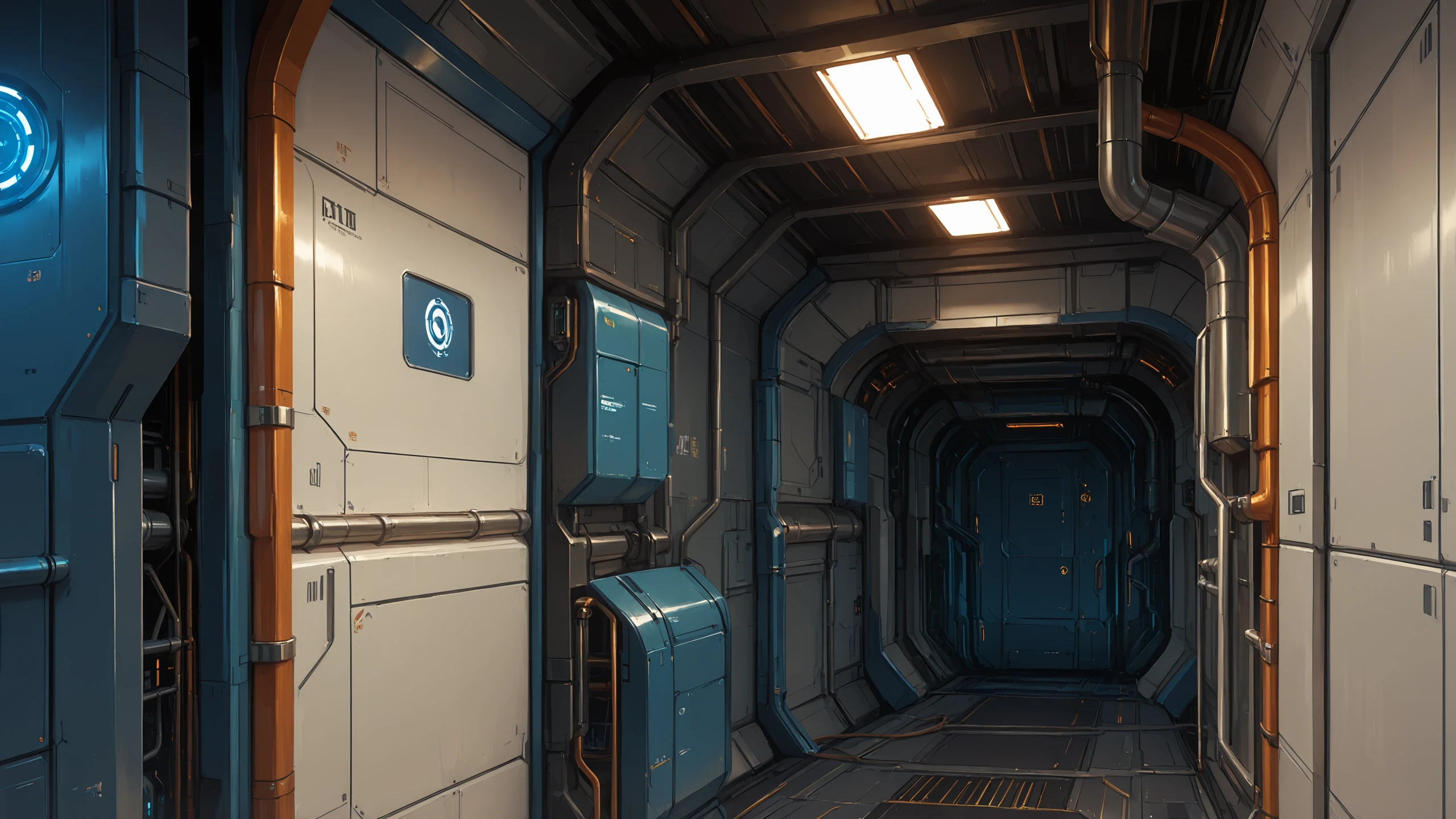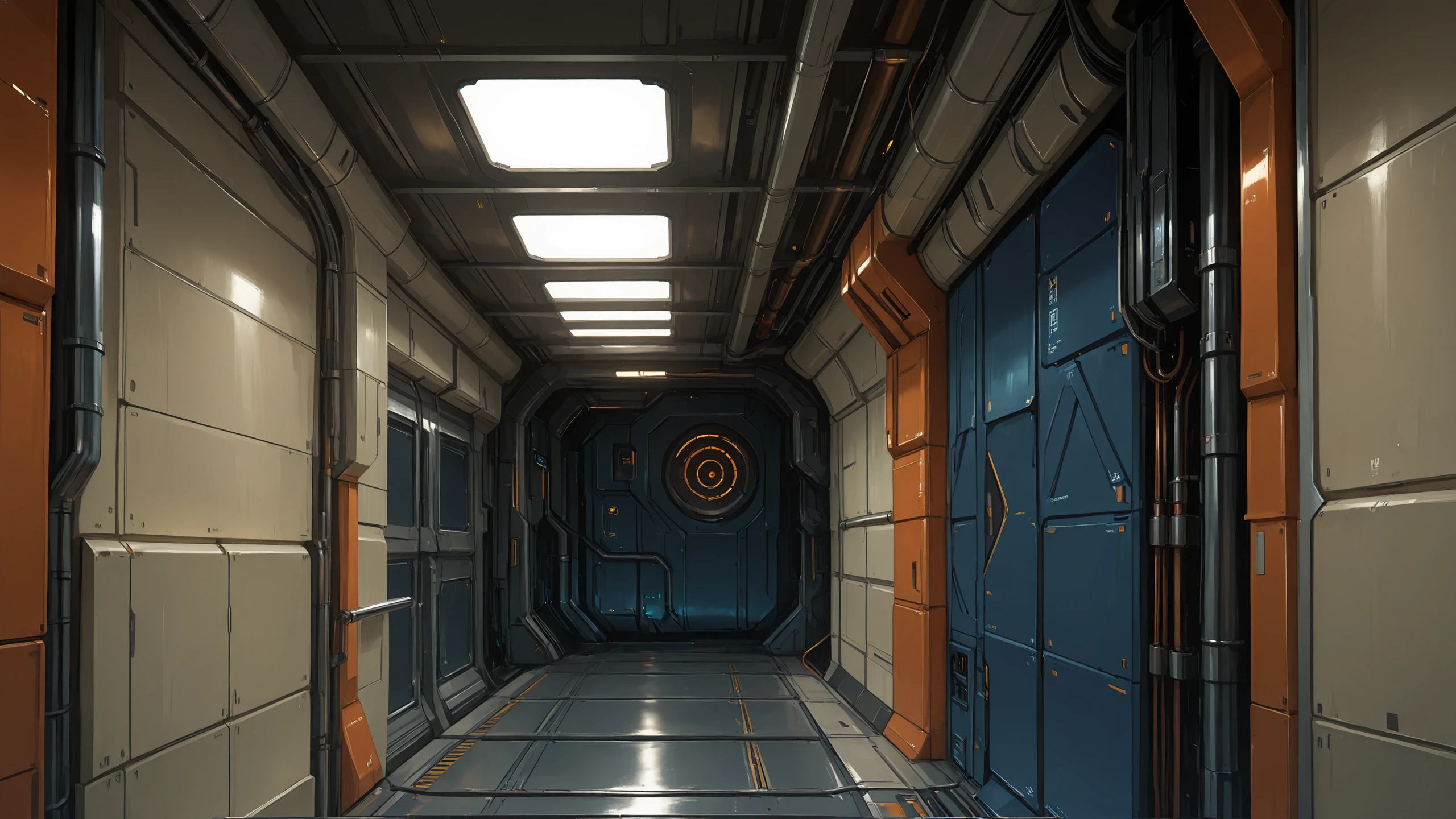 science fiction, no humans, indoors, industrial pipe, cable, ceiling light, door,