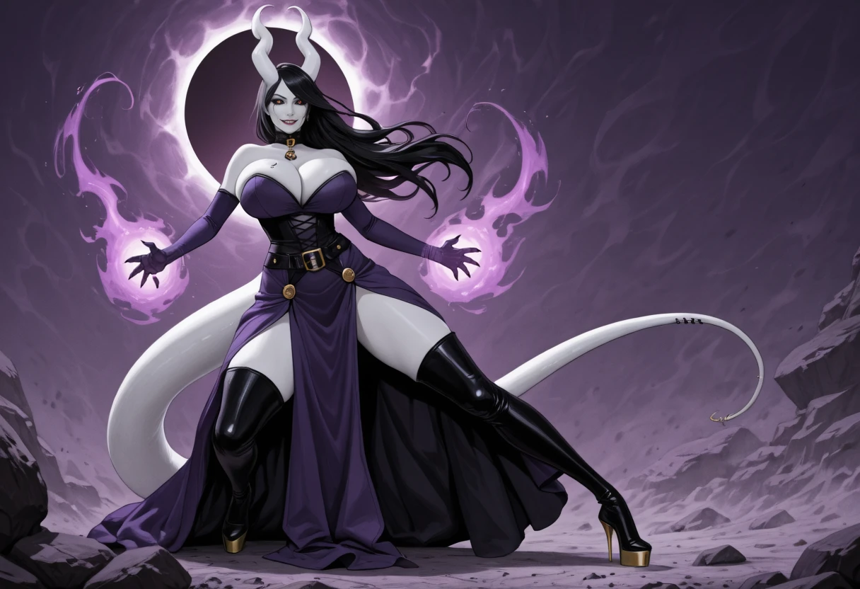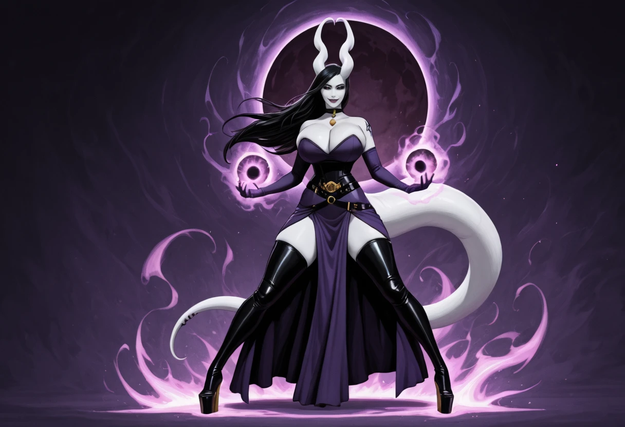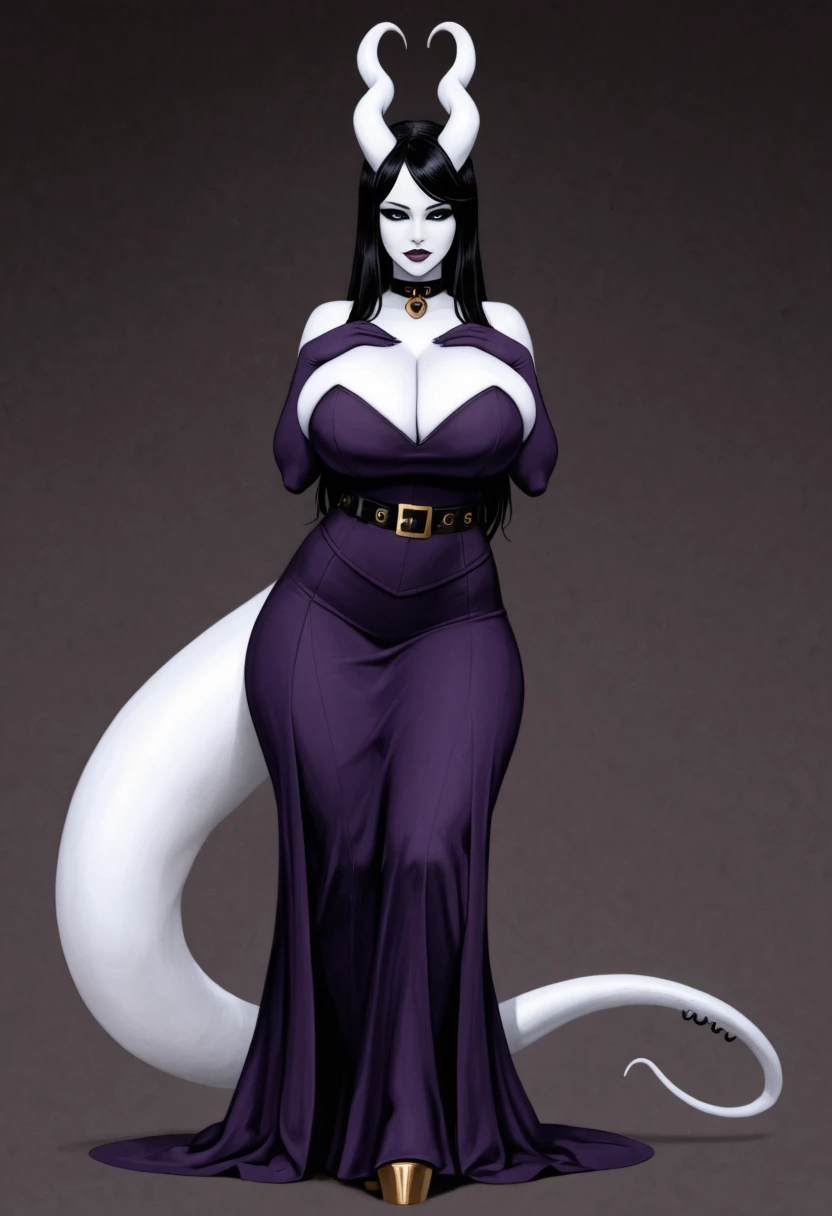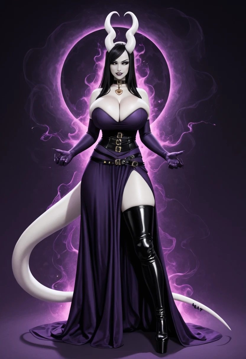 1girl, Bekka, succubus, horns, black sclera, heart horns, unusual skin tone, white skin, grey skin, albino, black hair, tail, thick tail, colored skin, long hair, demon girl, monster girl, claws, huge breasts,