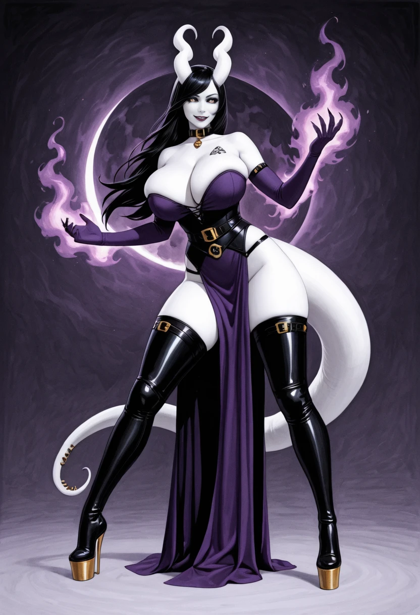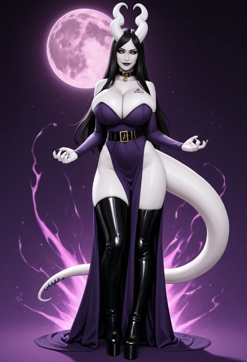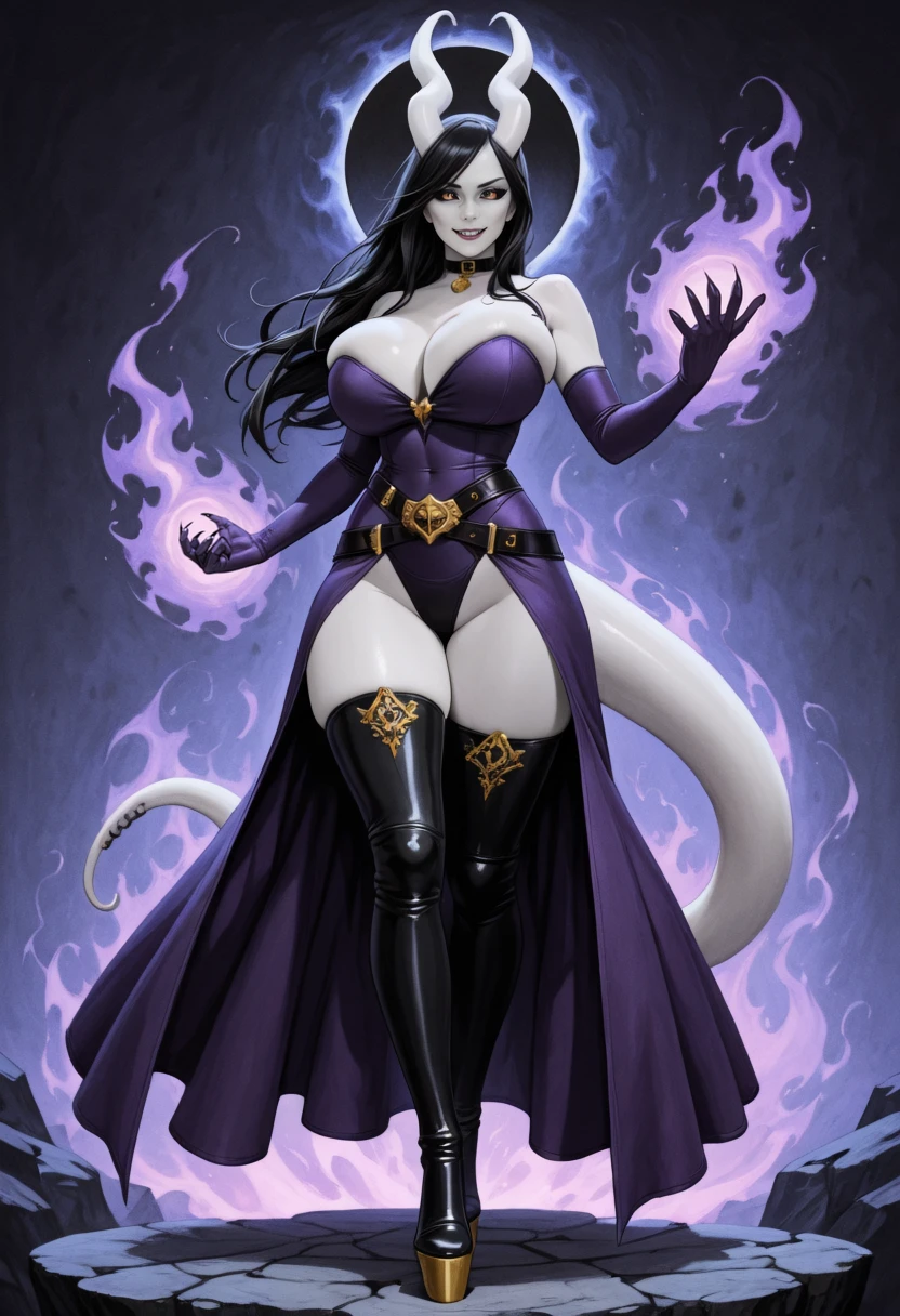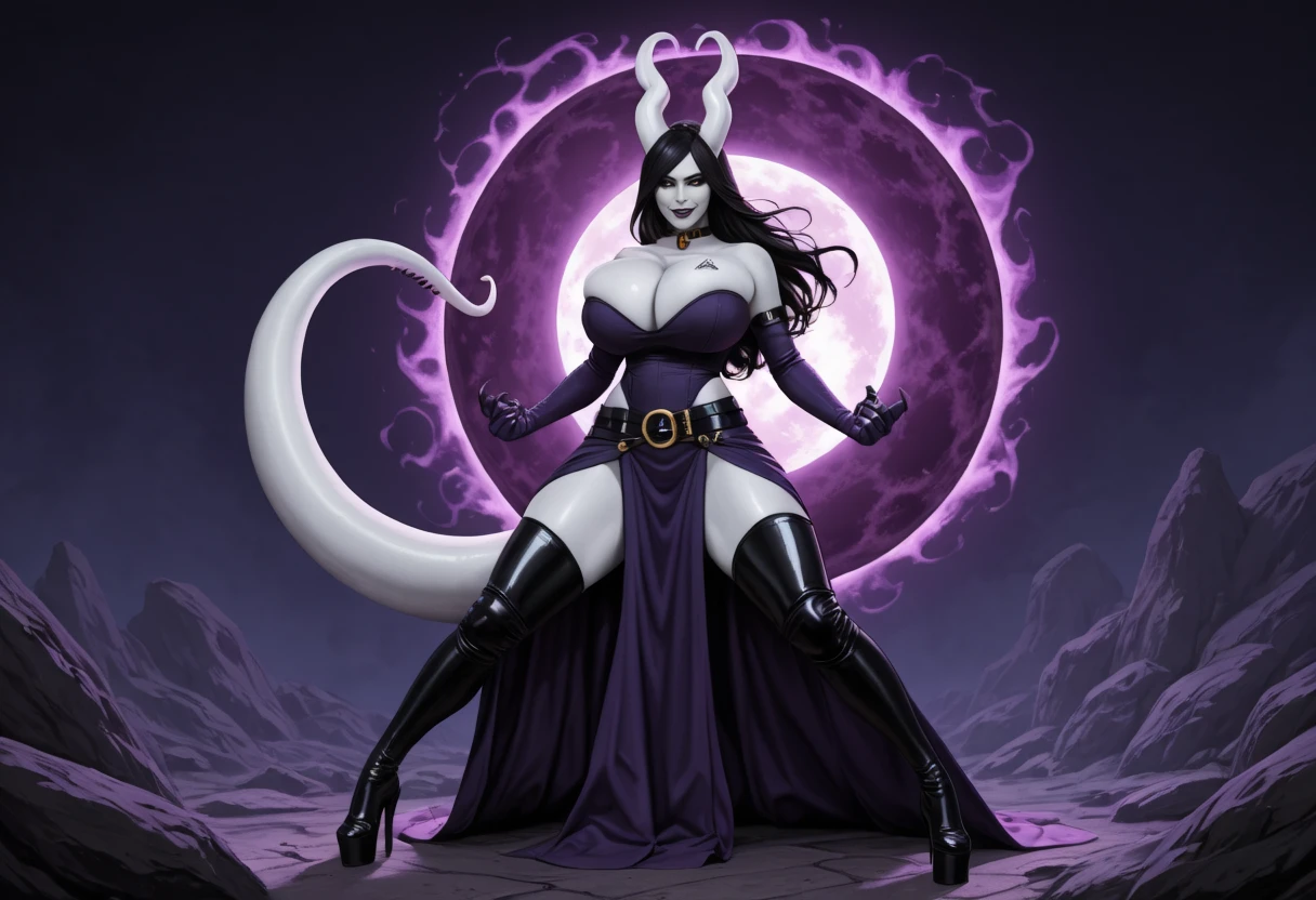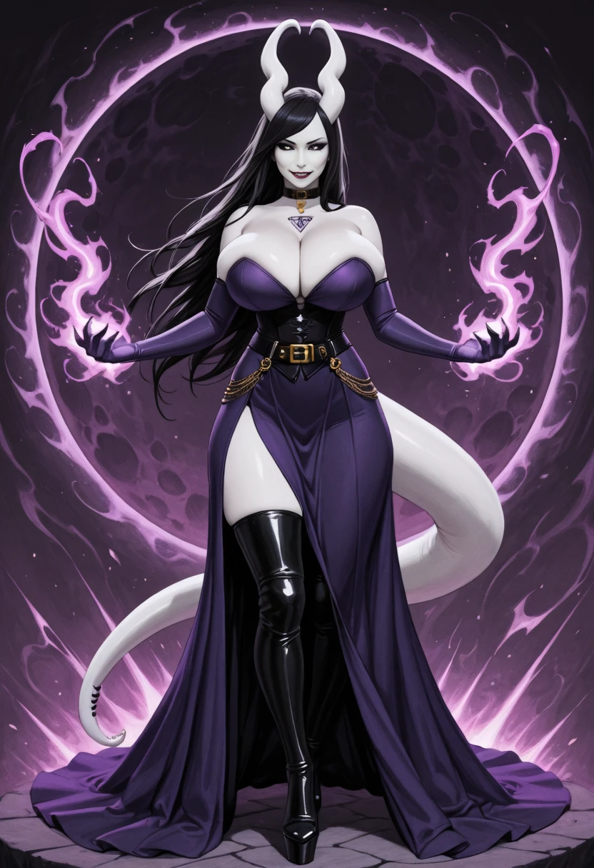1girl, Bekka, succubus, horns, black sclera, heart horns, unusual skin tone, white skin, grey skin, albino, black hair, tail, thick tail, colored skin, long hair, demon girl, monster girl, claws, huge breasts,