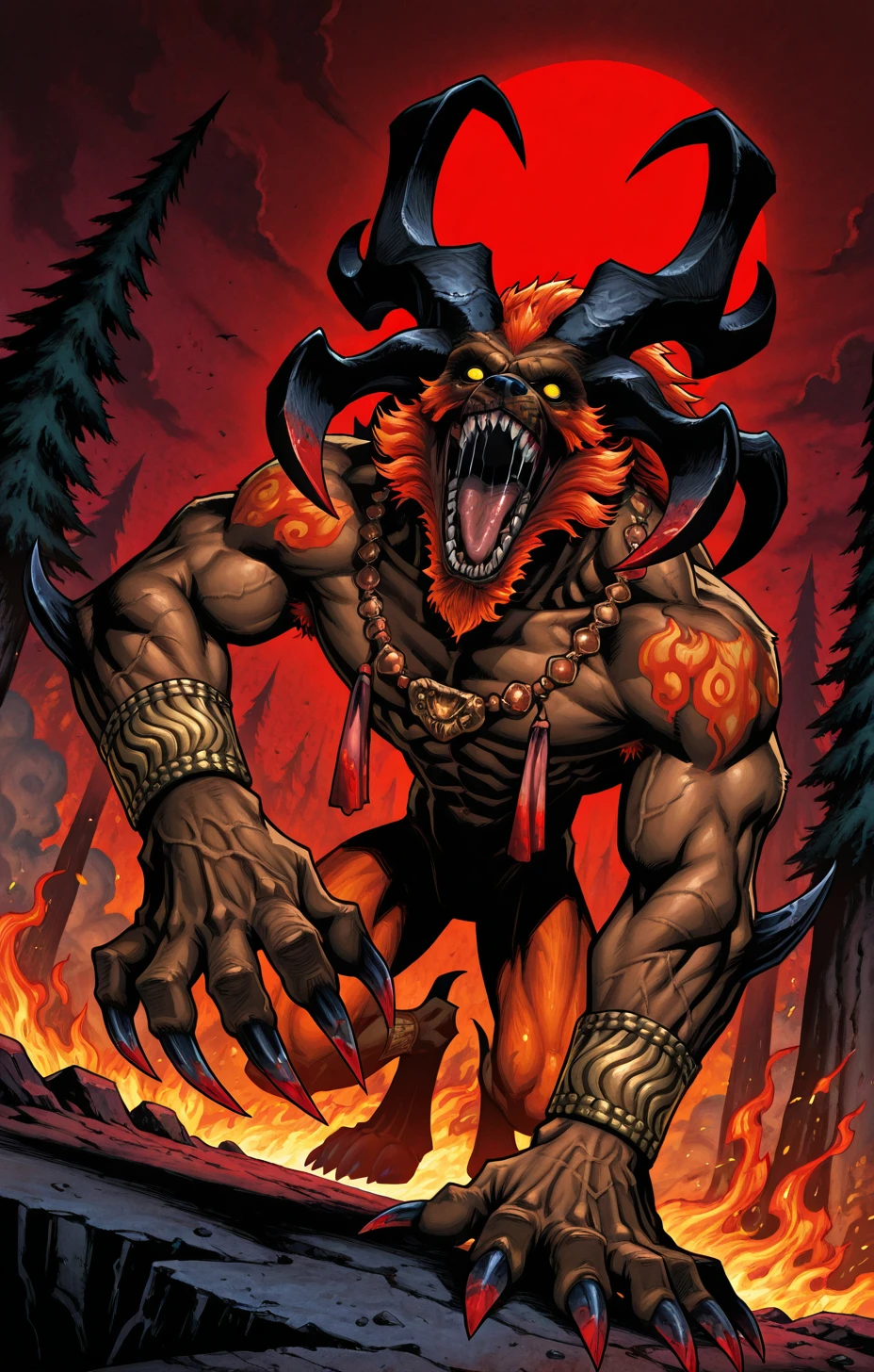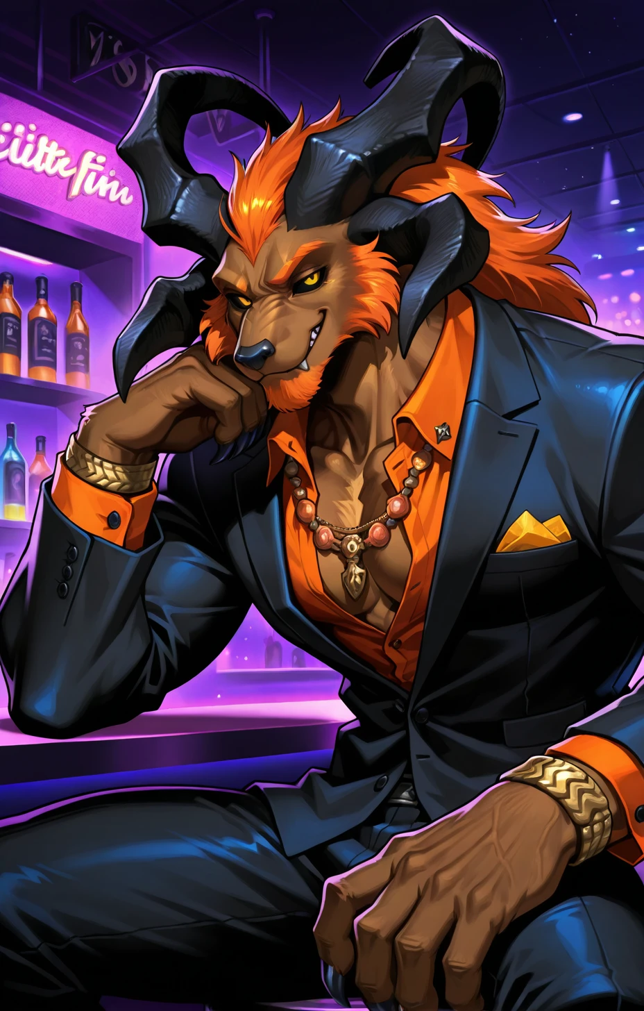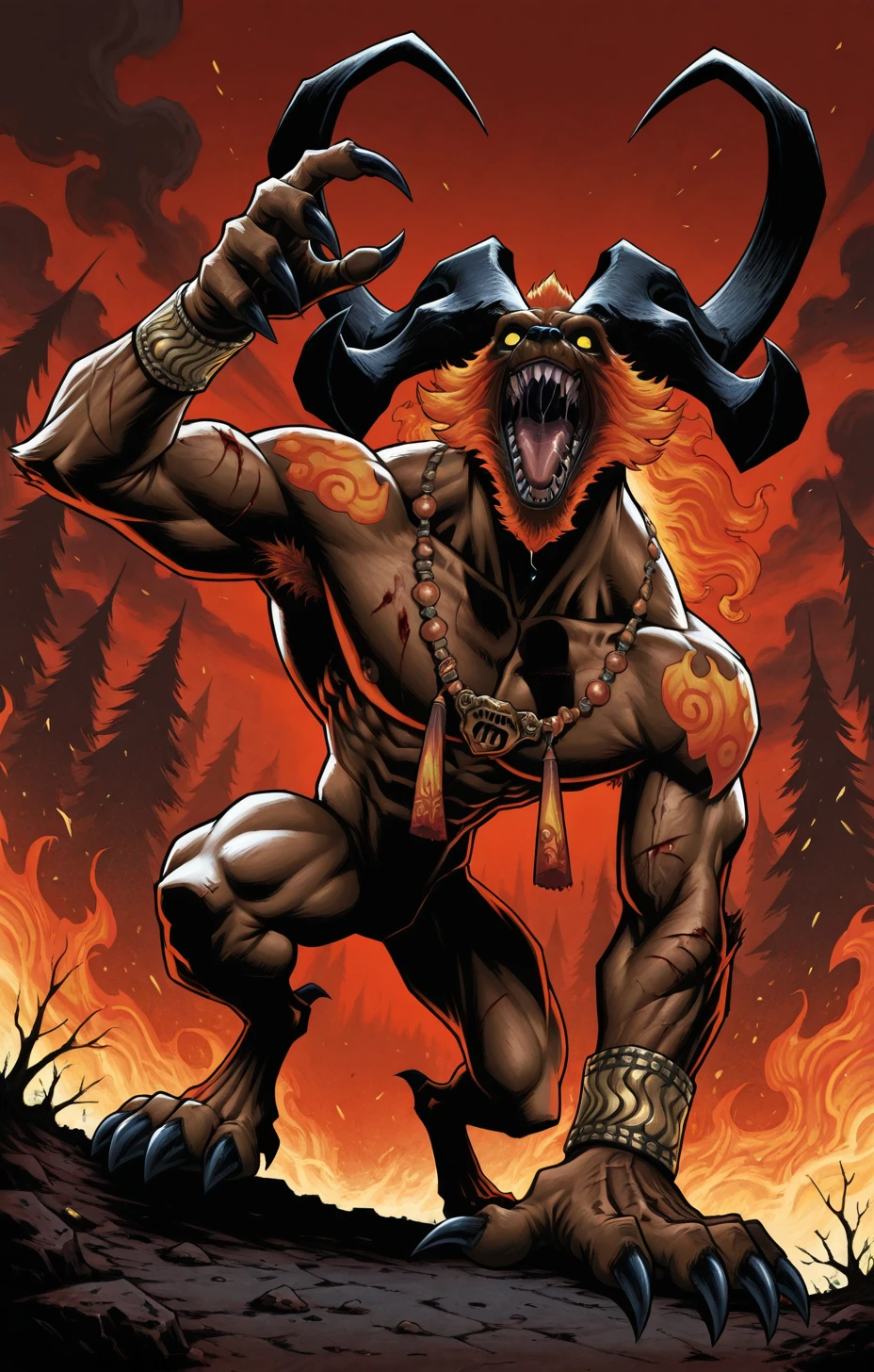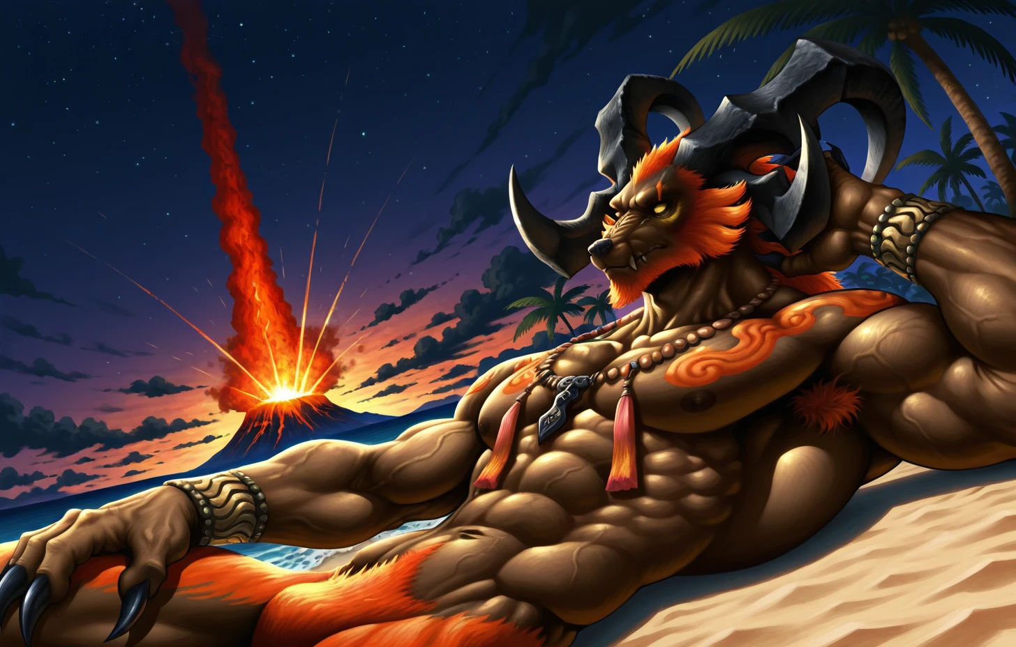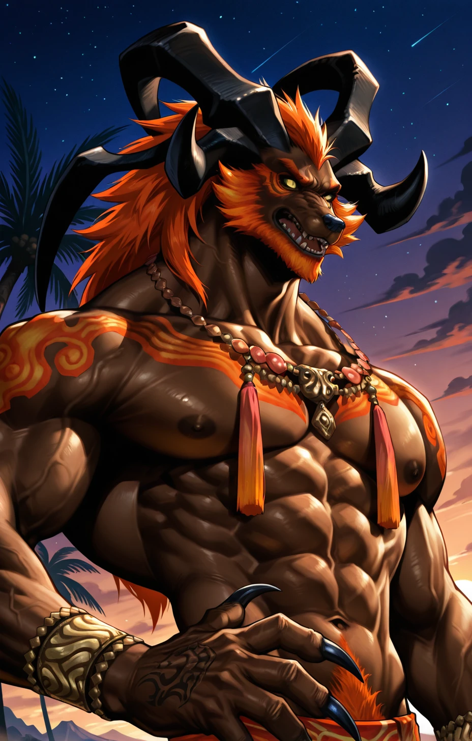 ffx_ifrit, yellow_eyes, dark_skin, ???? muscular male, horns, tattoos, jewelry, necklace, bracelet, sharp_teeth, long_claws claws, digitigrade, toe_clawsNegative prompt: