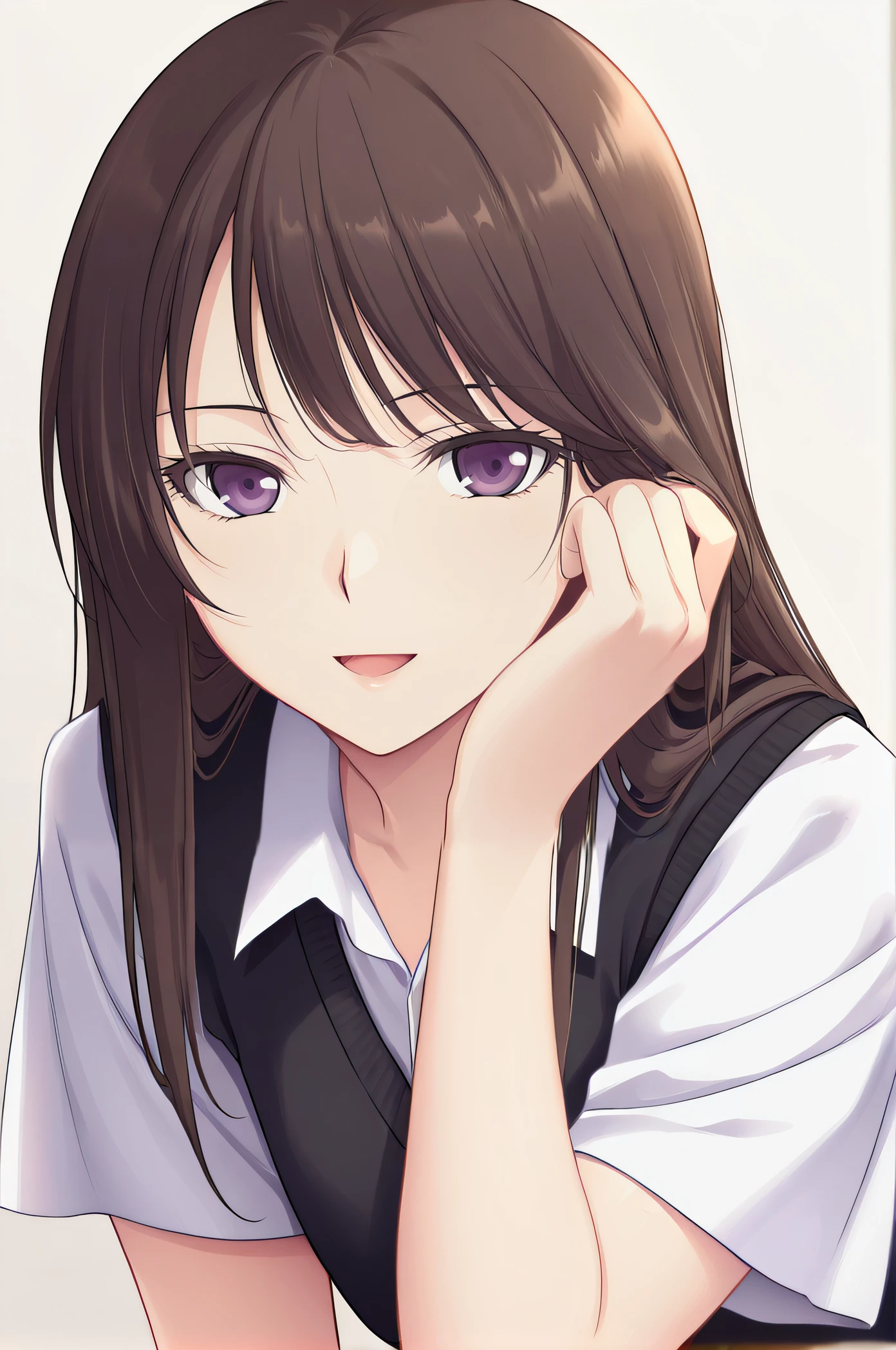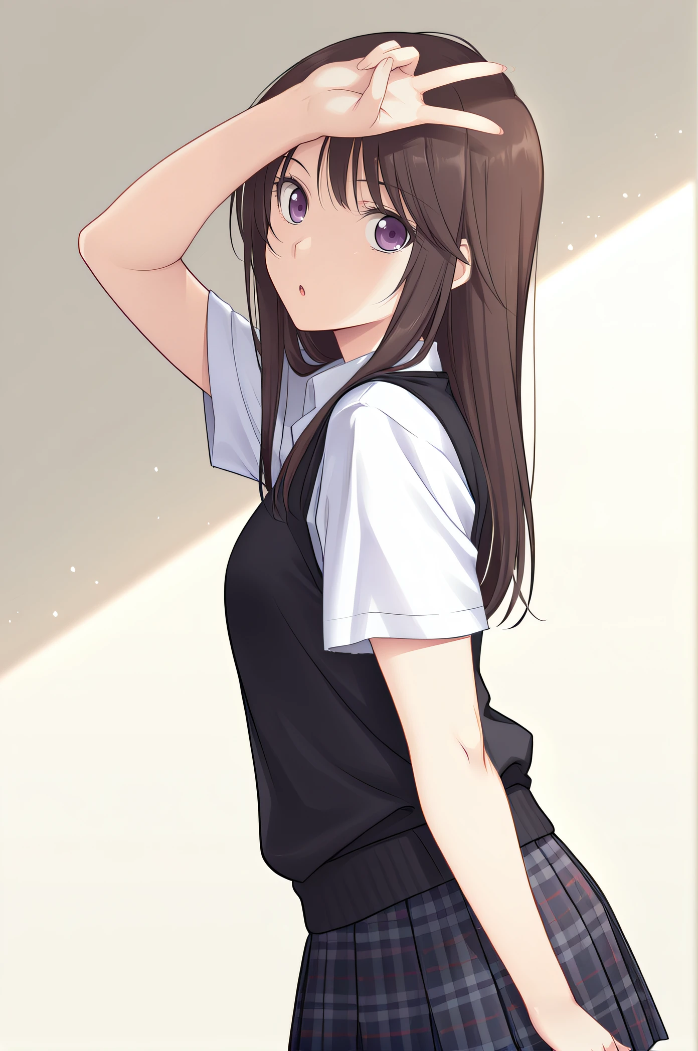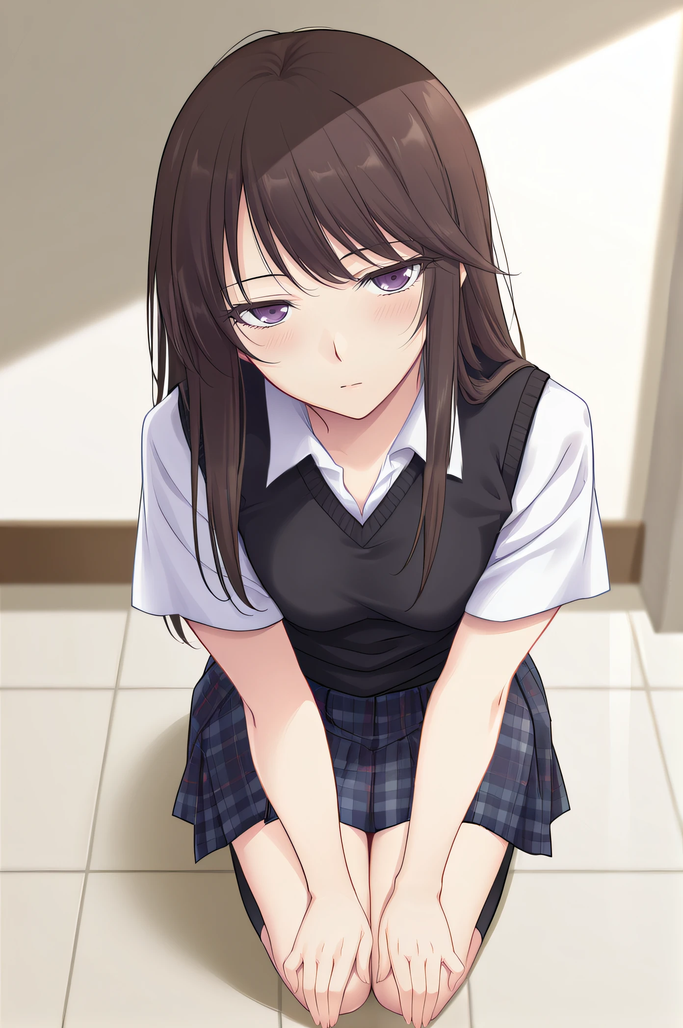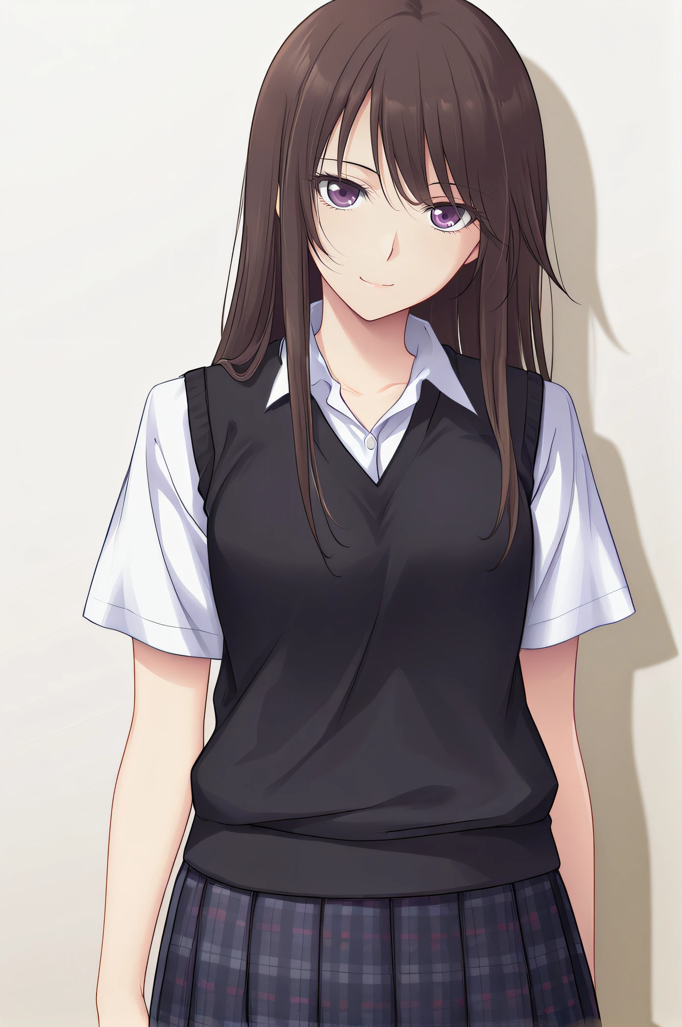 school uniform, white shirt, short sleeves, black sweater vest, plaid skirt, black knee socks