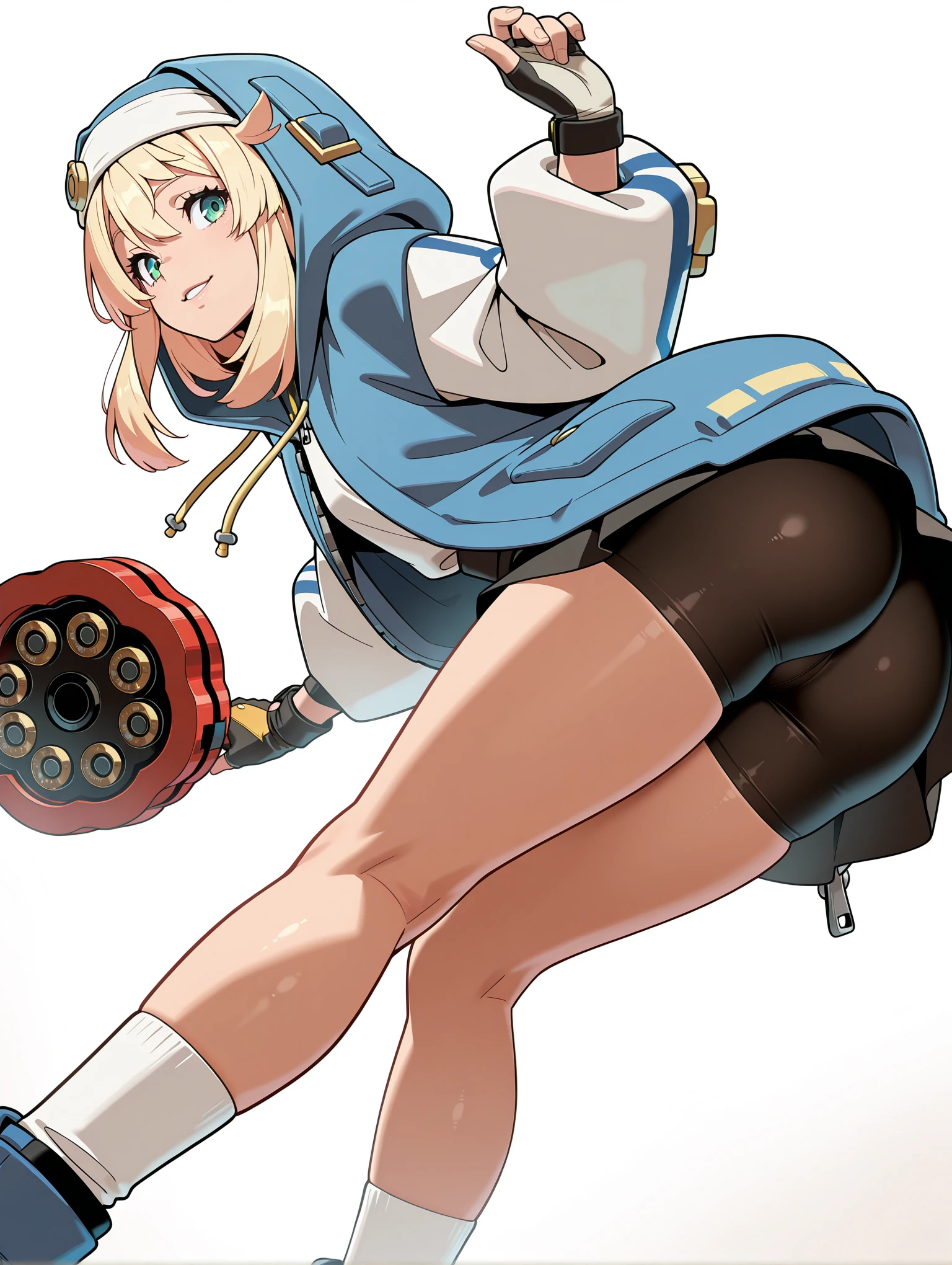 補助ワード ・hooded jacket,white shirt,cross,puffy long sleeves,fingerless gloves,blue jacket,zipper pull tab,black skirt,bike shorts under skirt,white socks,blue footwear,
