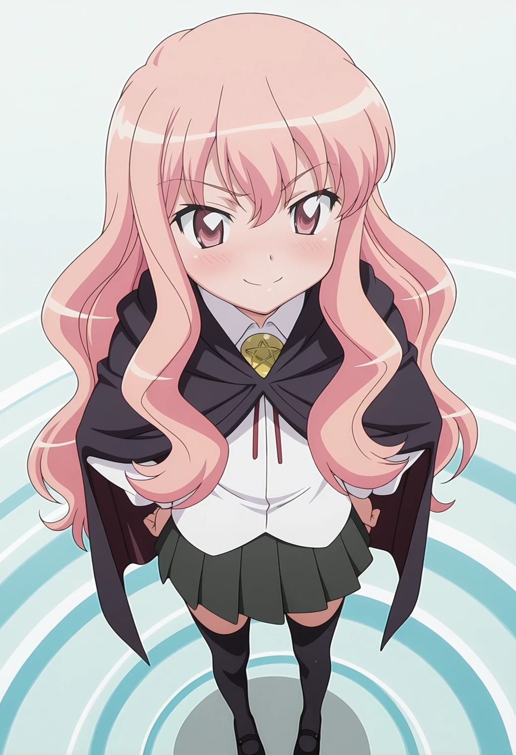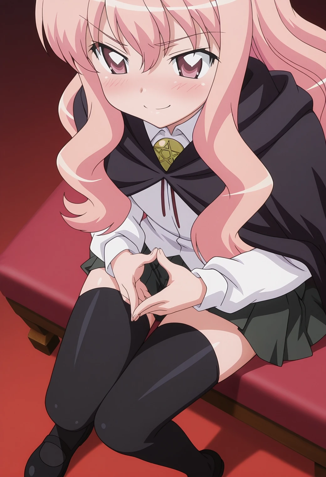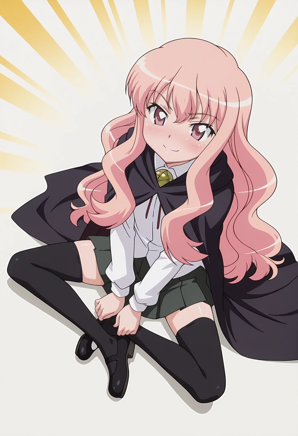 white shirt, long sleeves, pentacle brooch, cape, skirt, thighhighs, mary janes