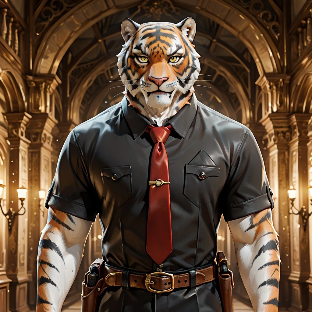 black short sleeve suit shirt, black pants, red tie, brown belt, gold belt buckle, weapon holster