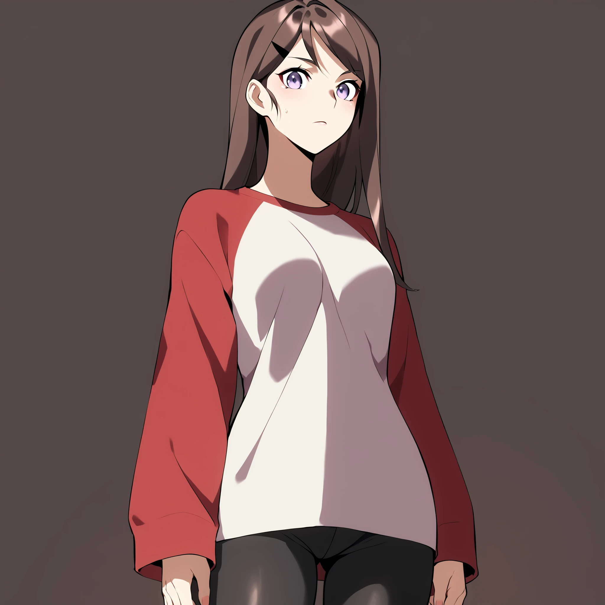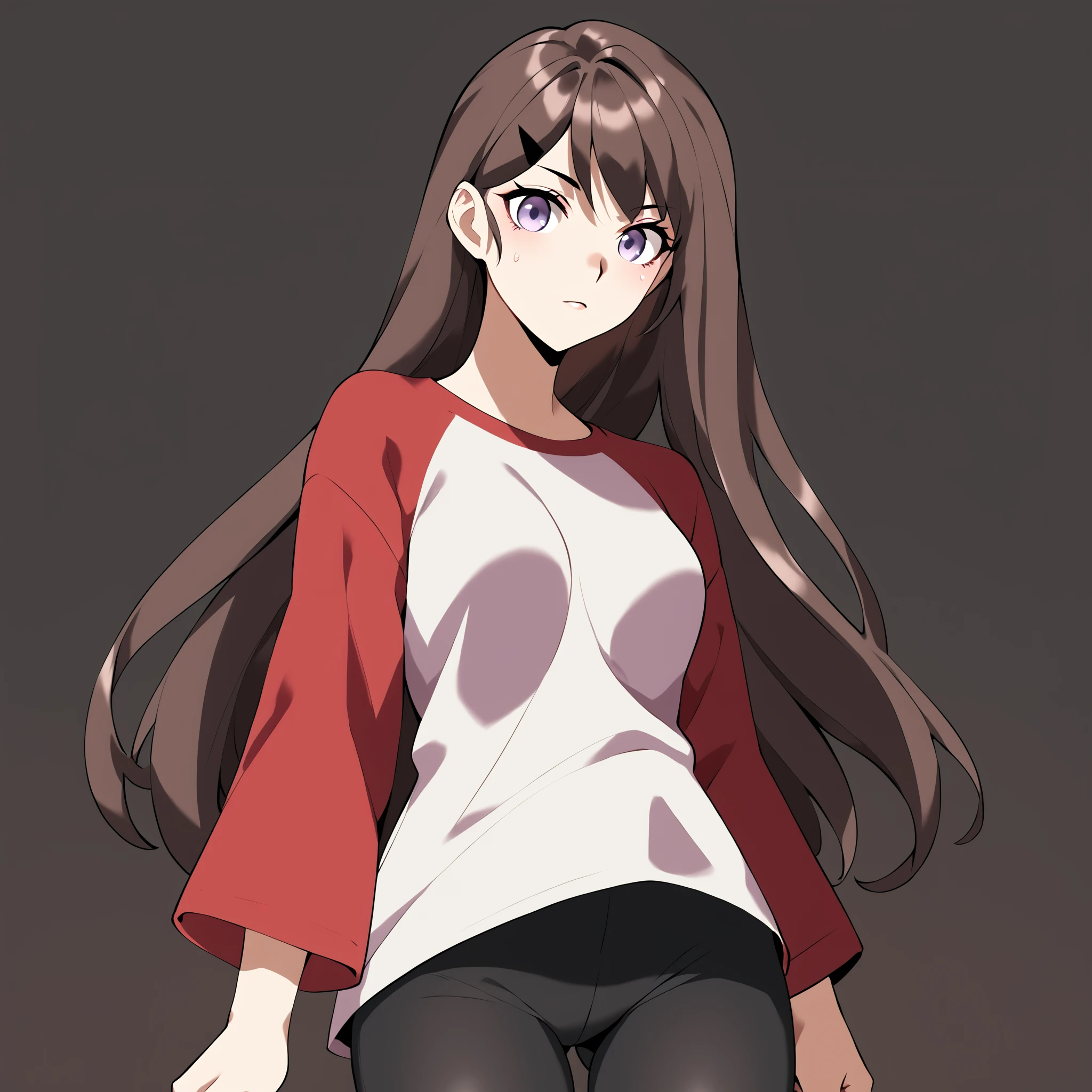 (raglan sleeves, red and white shirt, oversized shirt, large shirt, long short, shirt over thighs, shirt cover thighs:1.2), black yoga pants,