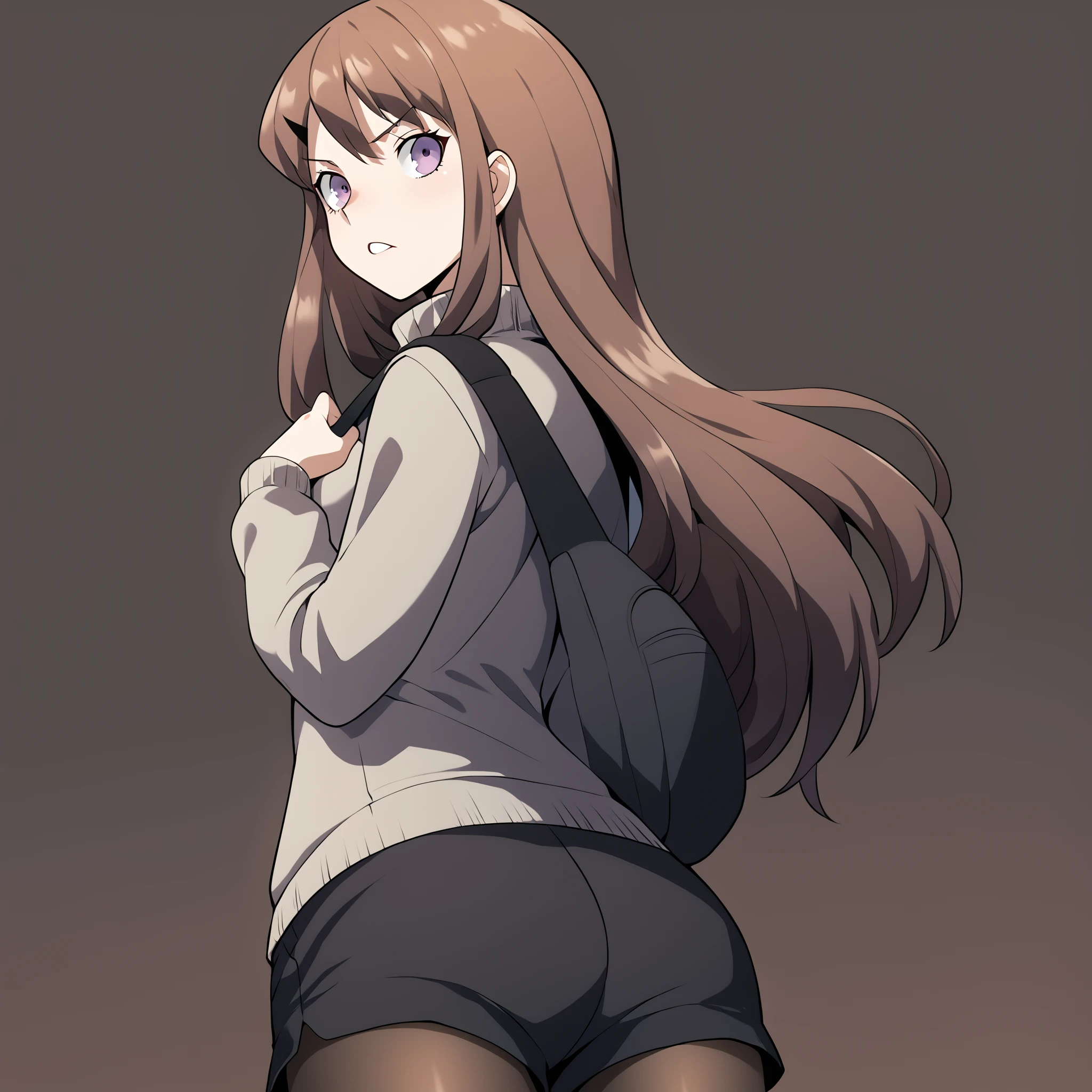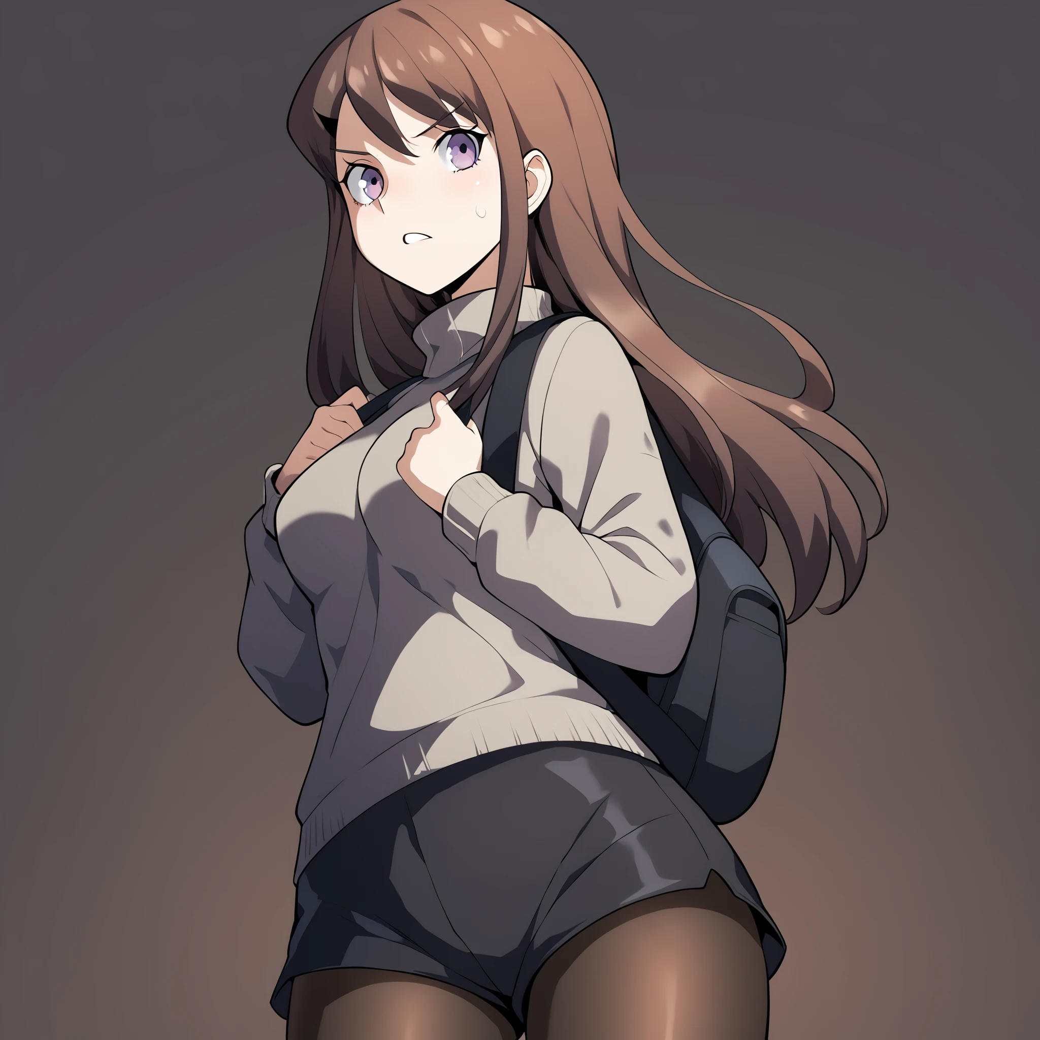 grey sweater, black shorts, pantyhose, bag,