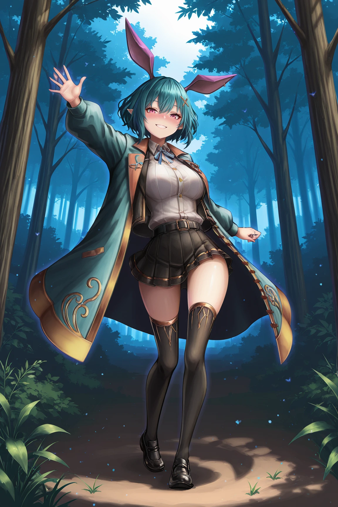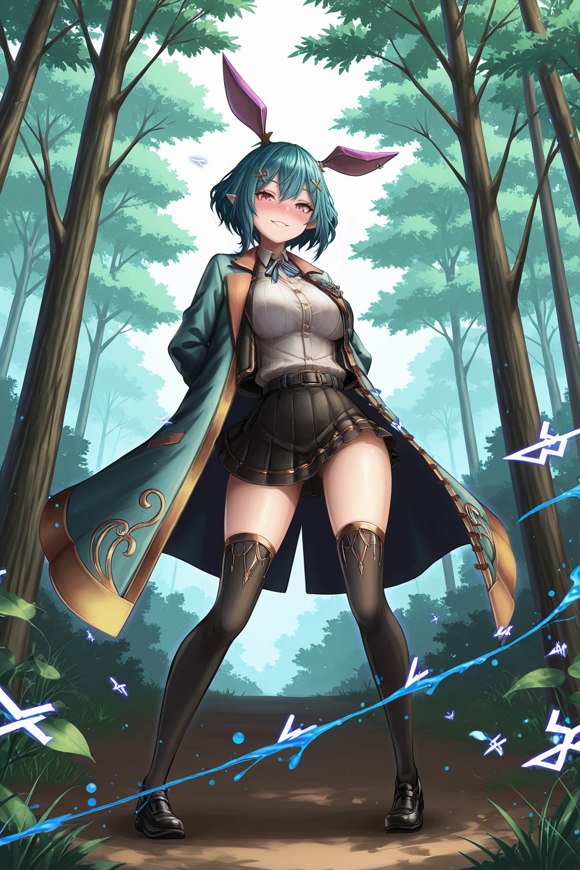 RosettaGSILXL, 1girl, pink eyes, aqua hair, short hair, hair between eyes, x hair ornament, pointed ears, rabbit ears, purple ears, , wide , aqua coat, black jacket, open jacket, white shirt, blue ribbon, black belt, black skirt, pleated skirt, black thighhighs, black shoes