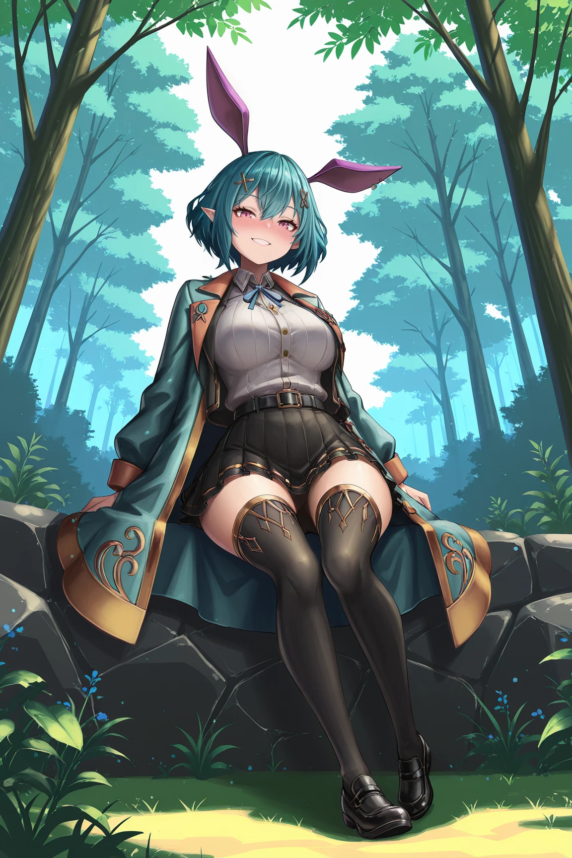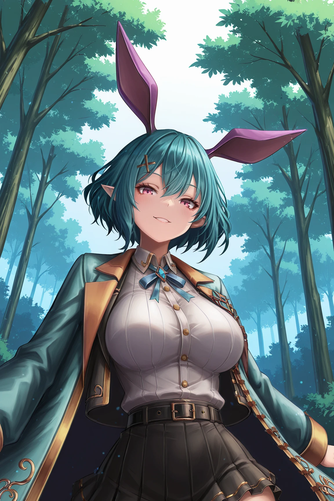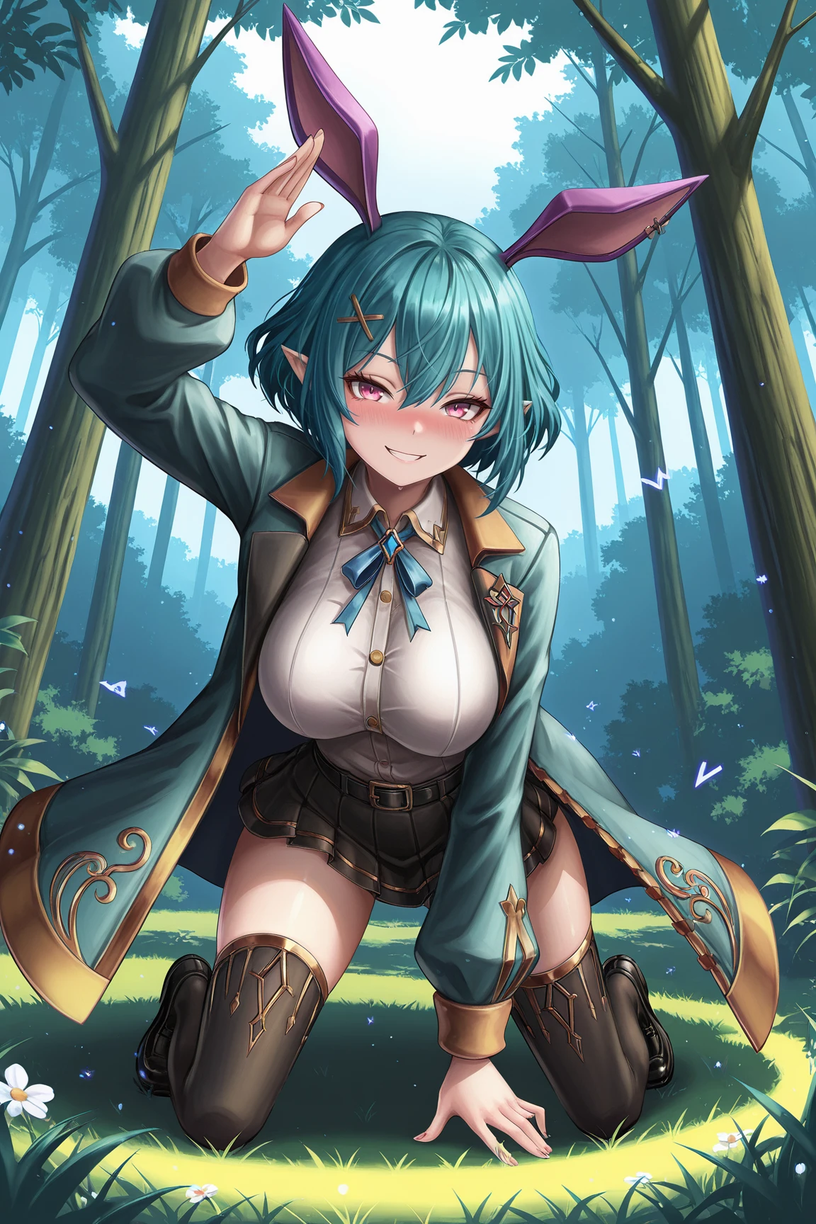 ➜ RosettaGSILXL, 1girl, pink eyes, aqua hair, short hair, hair between eyes, x hair ornament, pointed ears, rabbit ears, purple ears, large breasts, wide hips, aqua coat, black jacket, open jacket, white shirt, blue ribbon, black belt, black skirt, pleated skirt, black thighhighs, black shoes