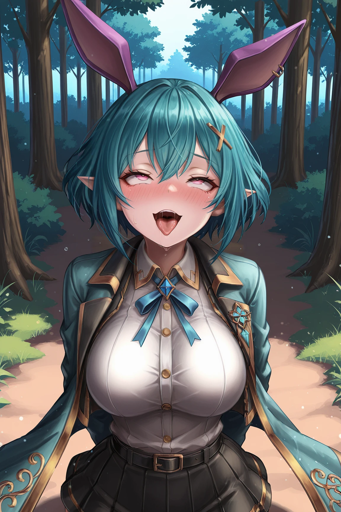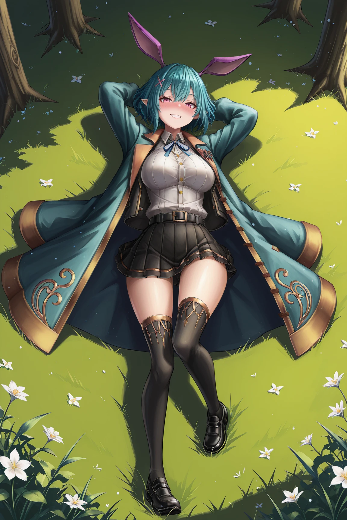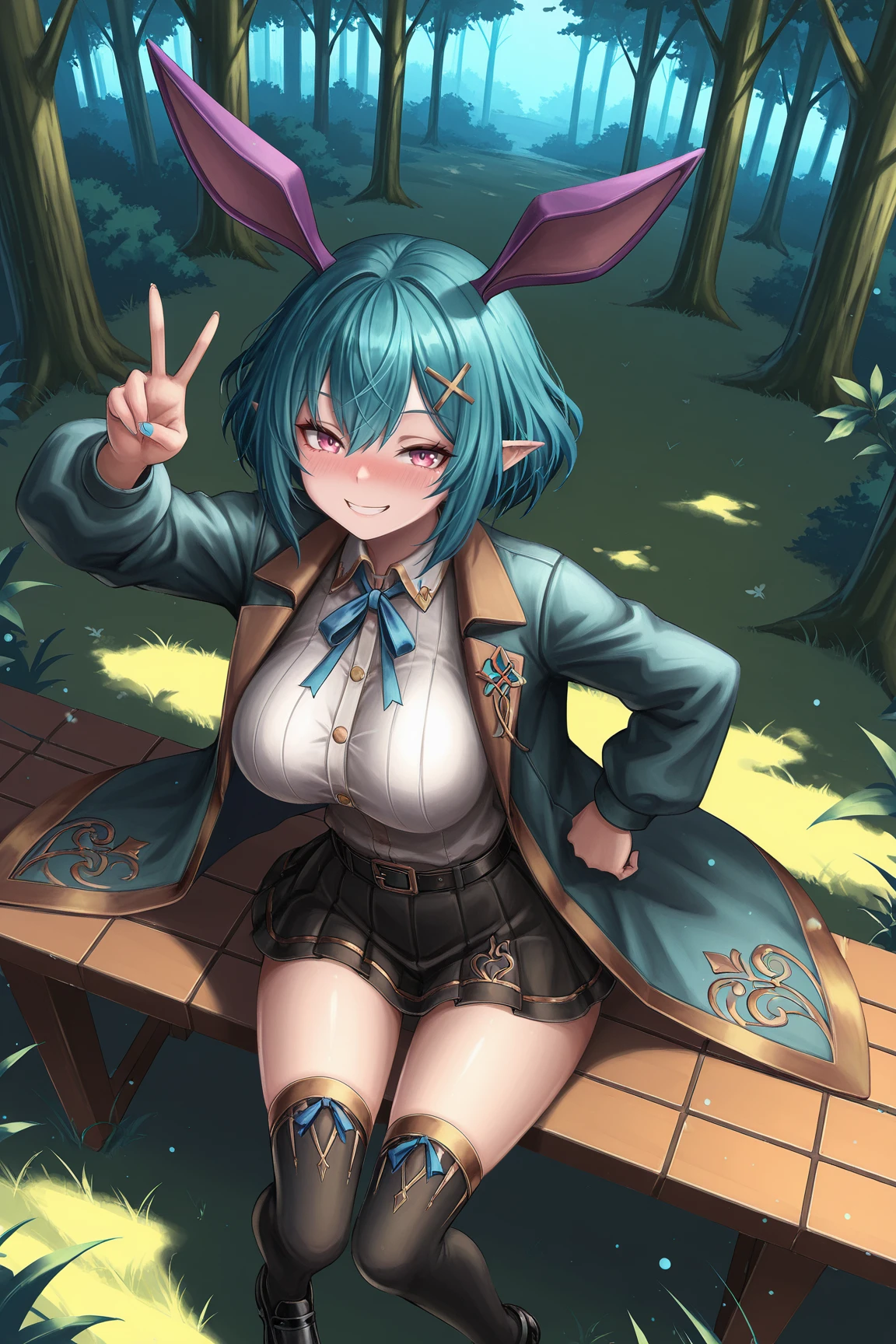 ➜ RosettaGSILXL, 1girl, pink eyes, aqua hair, short hair, hair between eyes, x hair ornament, pointed ears, rabbit ears, purple ears, large breasts, wide hips, aqua coat, black jacket, open jacket, white shirt, blue ribbon, black belt, black skirt, pleated skirt, black thighhighs, black shoes