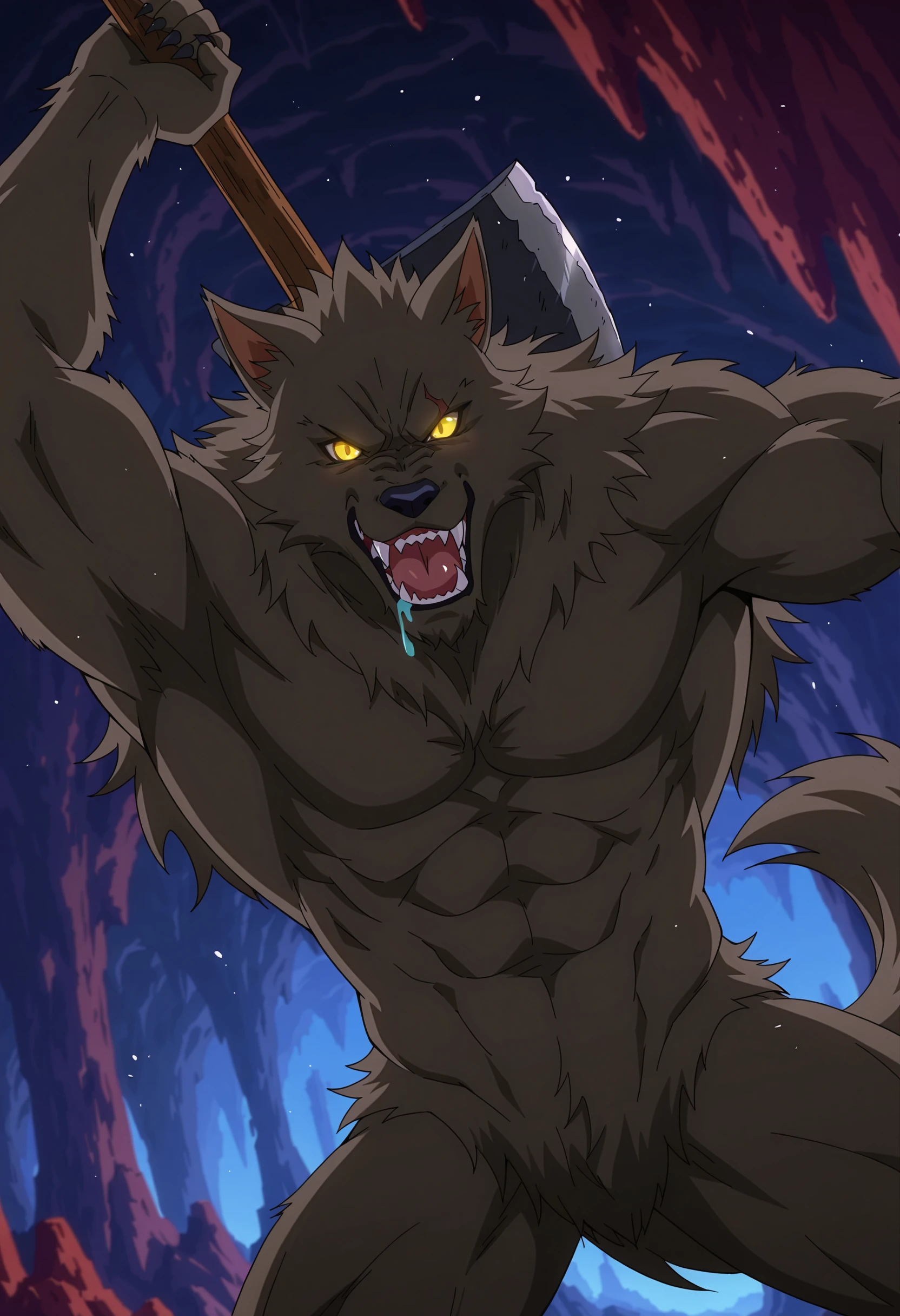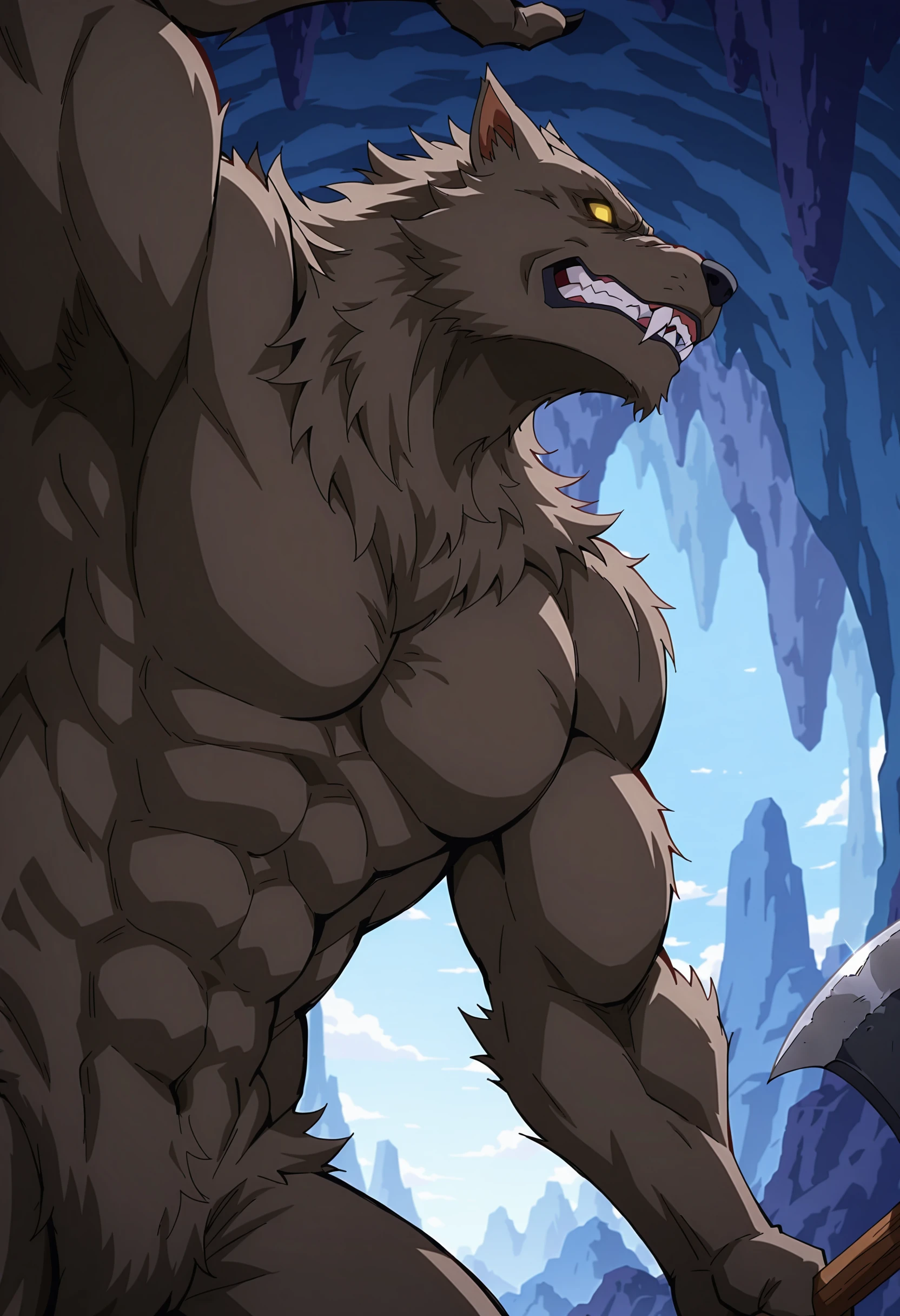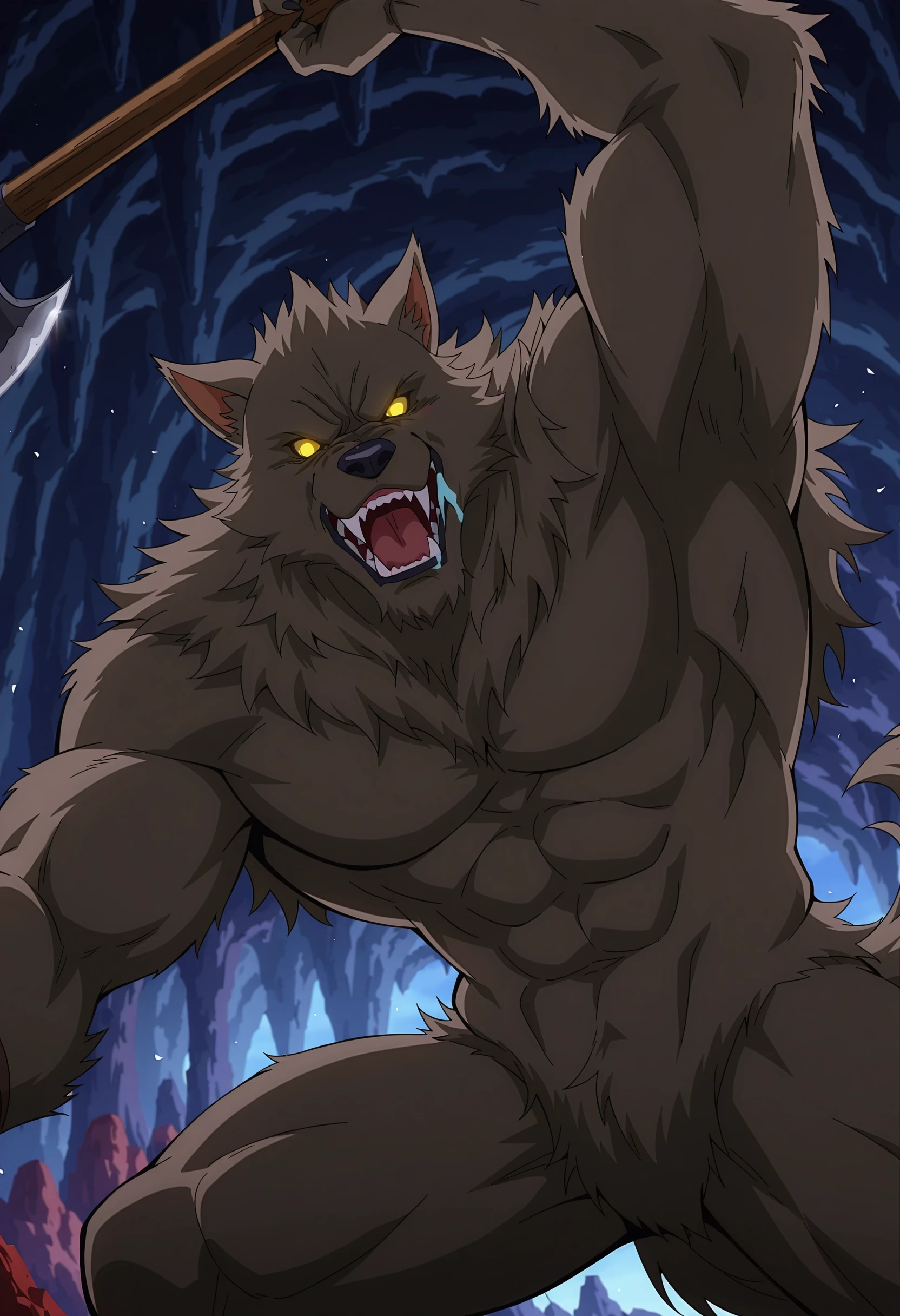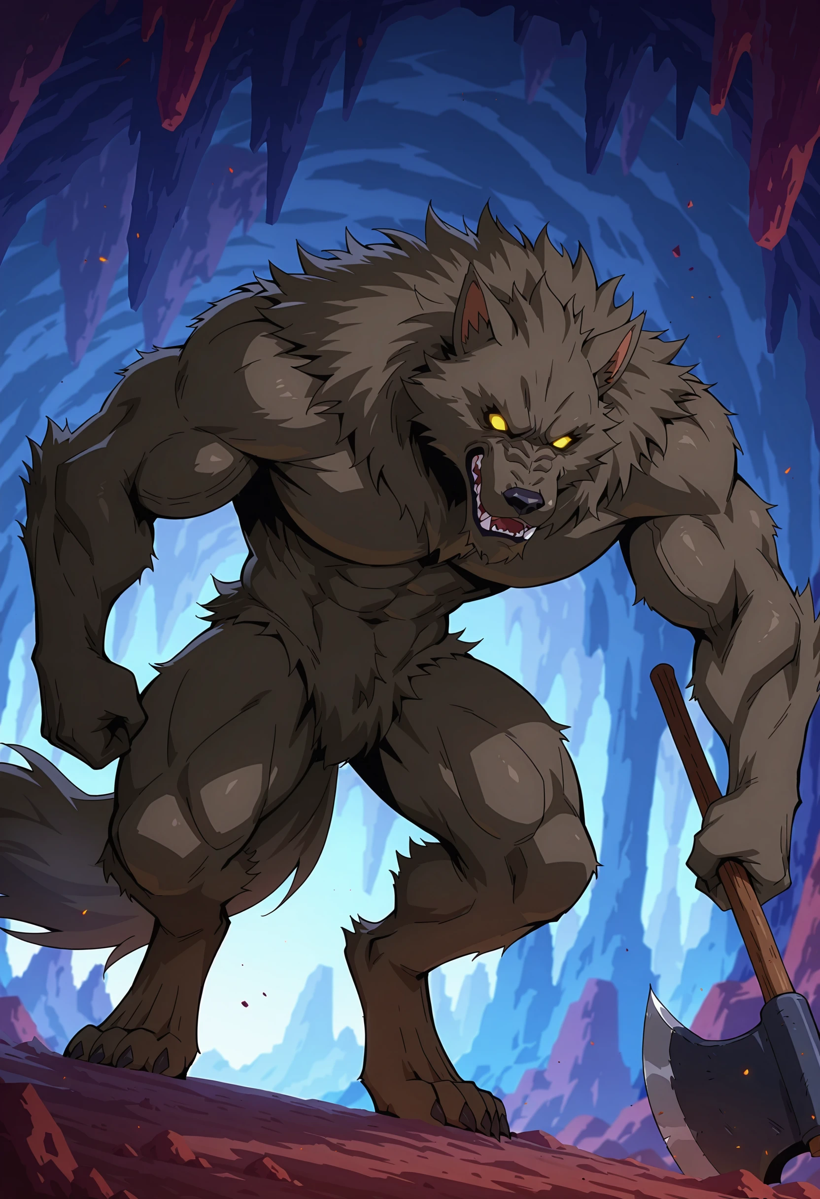 werewolf, brown fur, fangs, animal ears, yellow eyes, no_pupils