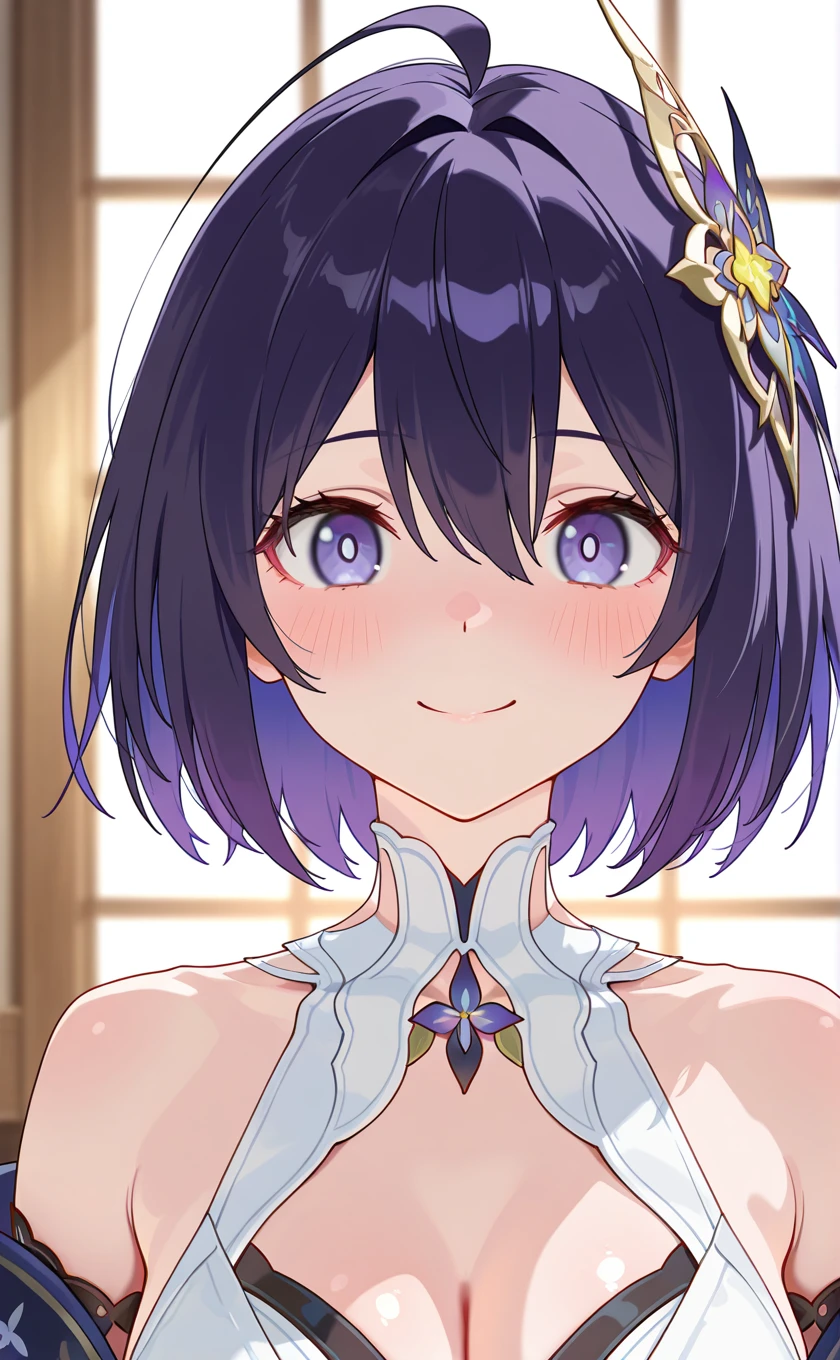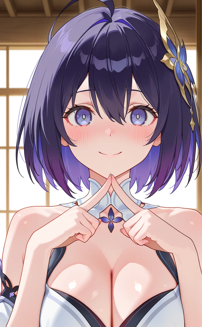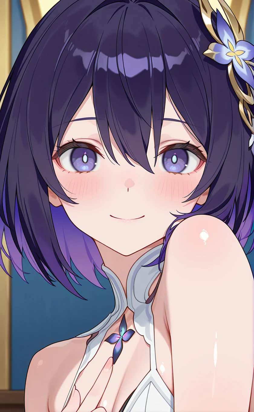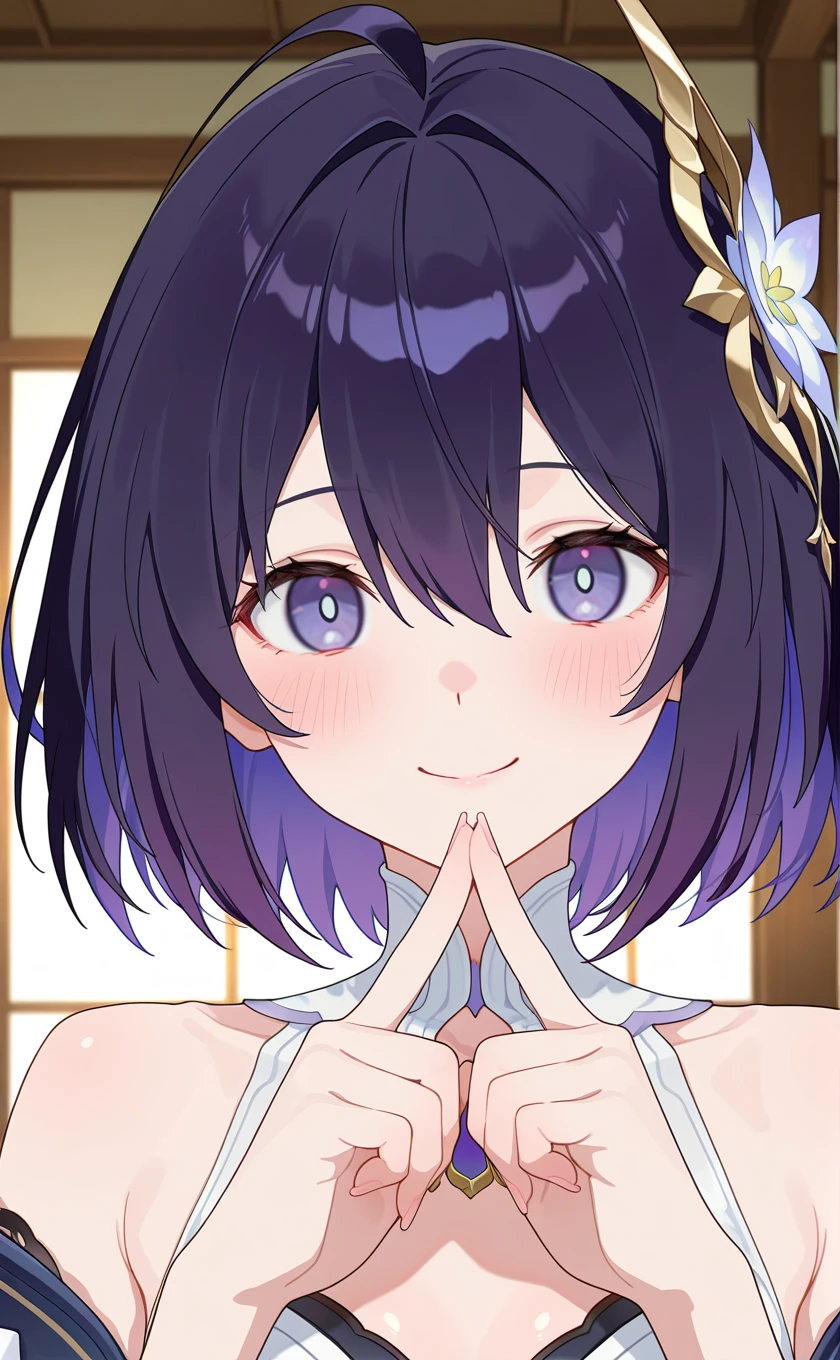 purple hair,hair ornament,hair between eyes,purple eyes