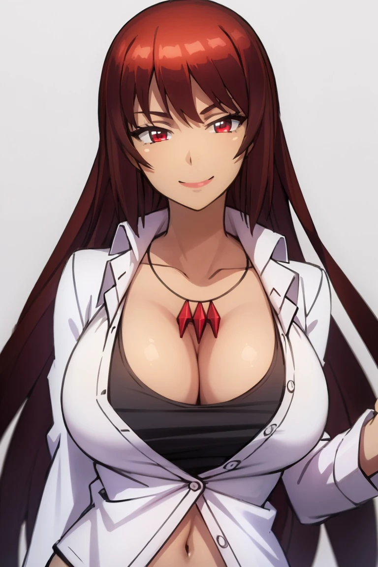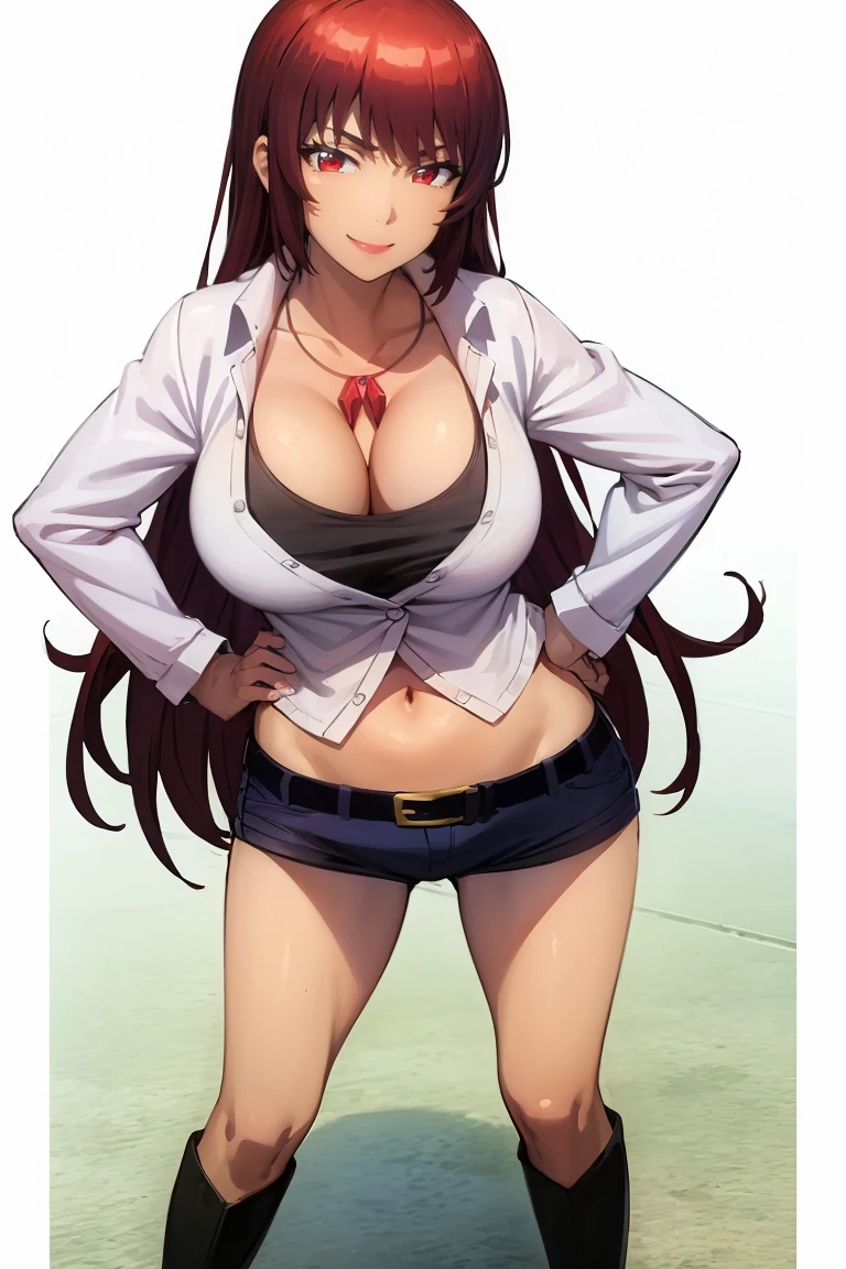 cleavage, necklace, white shirt, belt, short shorts, knee boots, navel, midriff