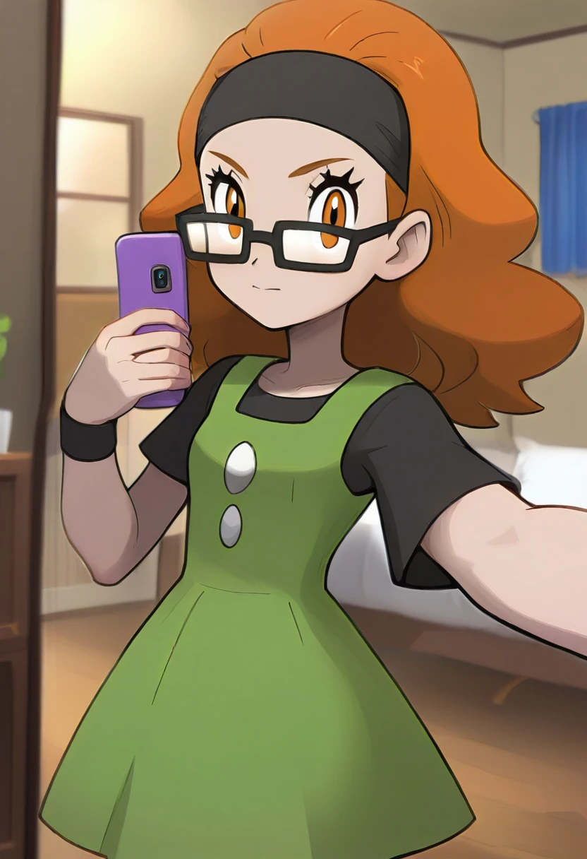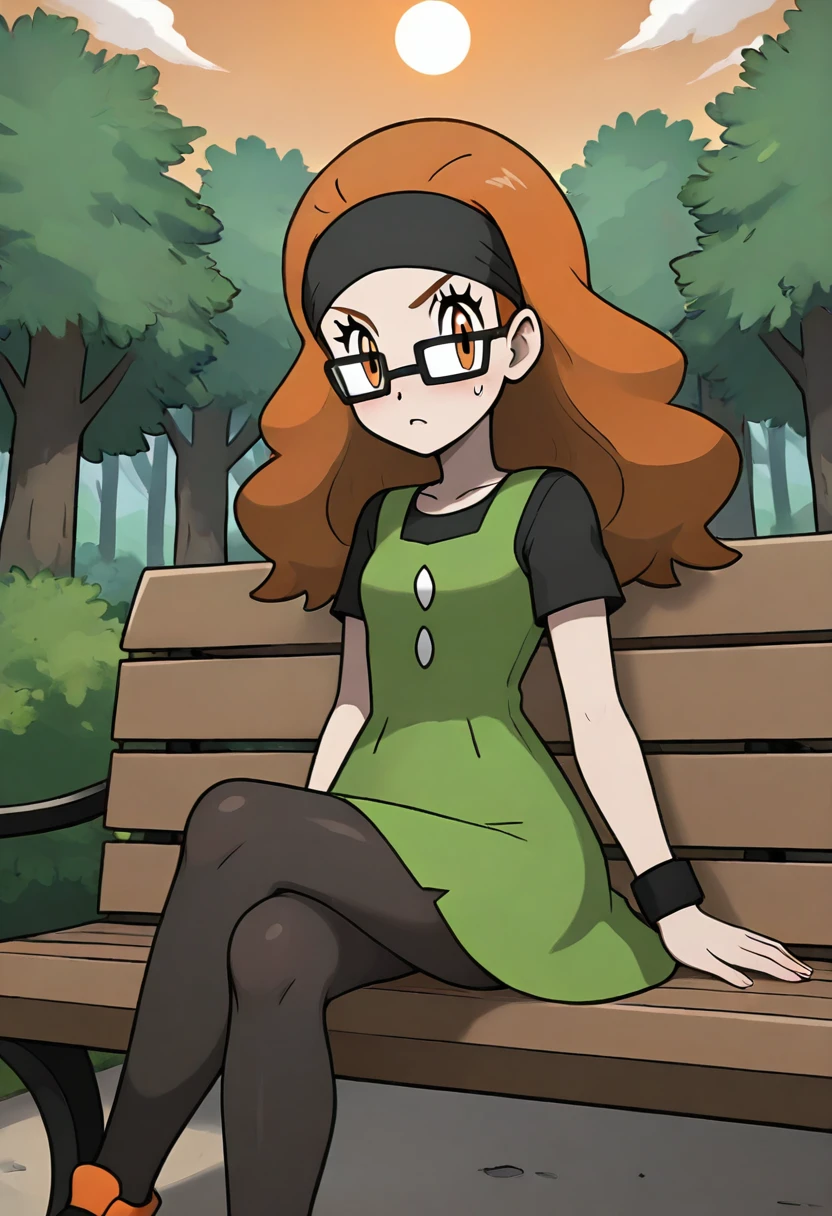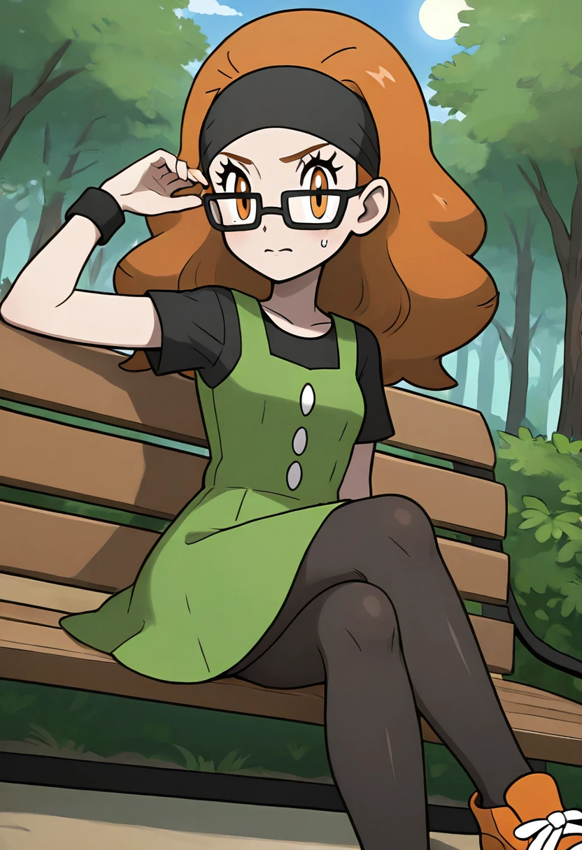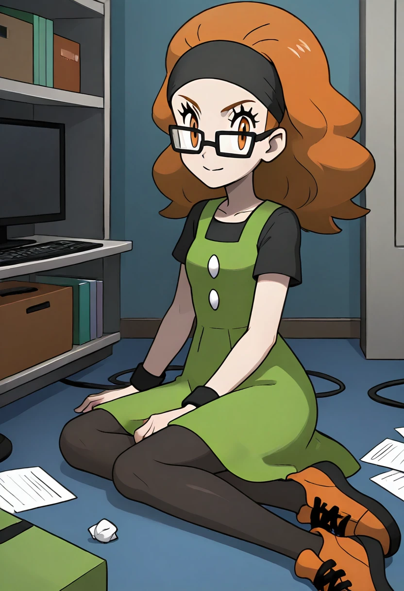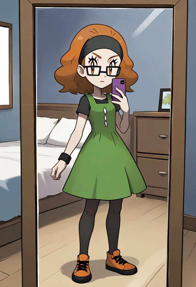 black shirt, short sleeves, sleeveless dress, pinafore dress, green dress, wristband, black pantyhose, orange footwear, sneakers,