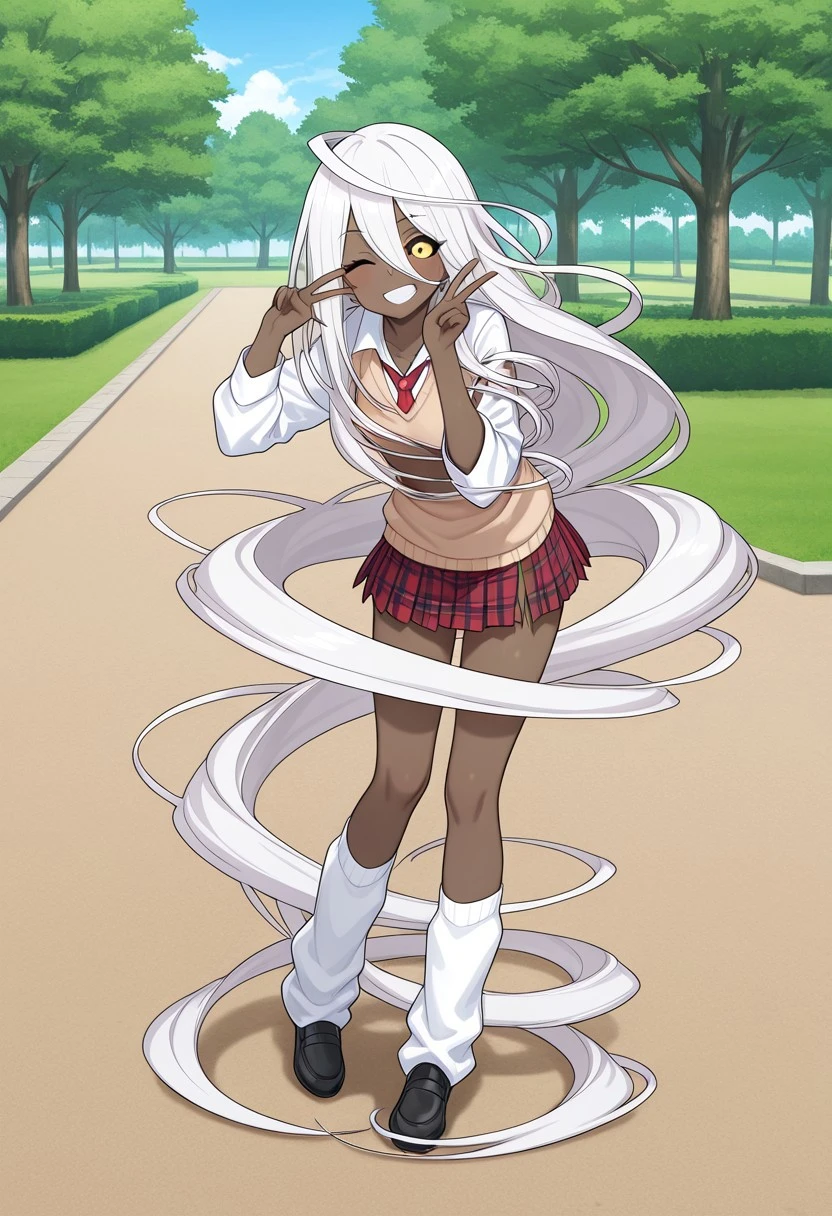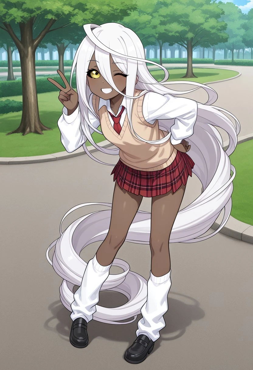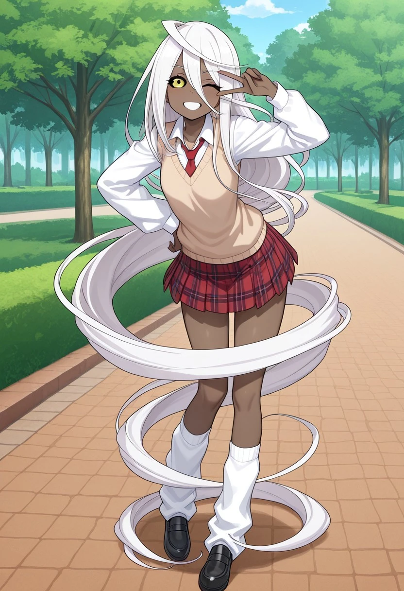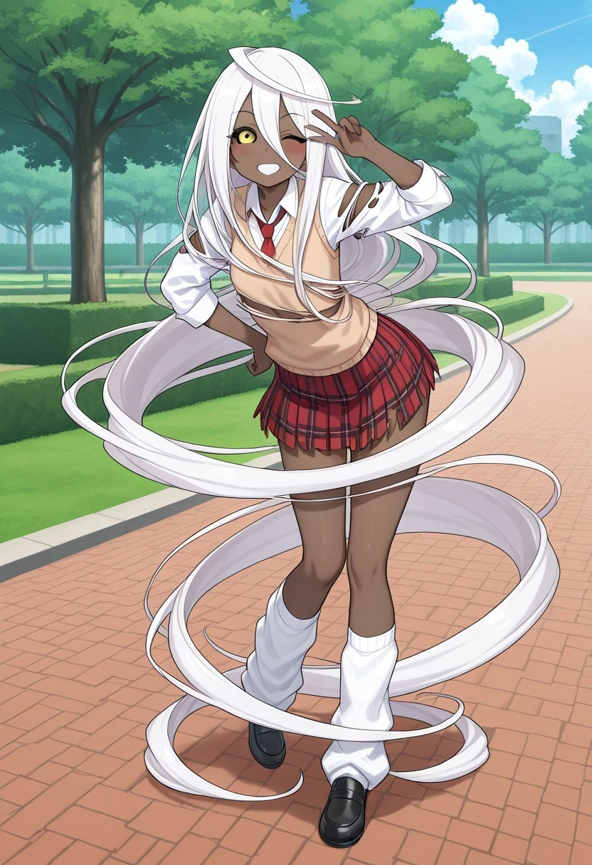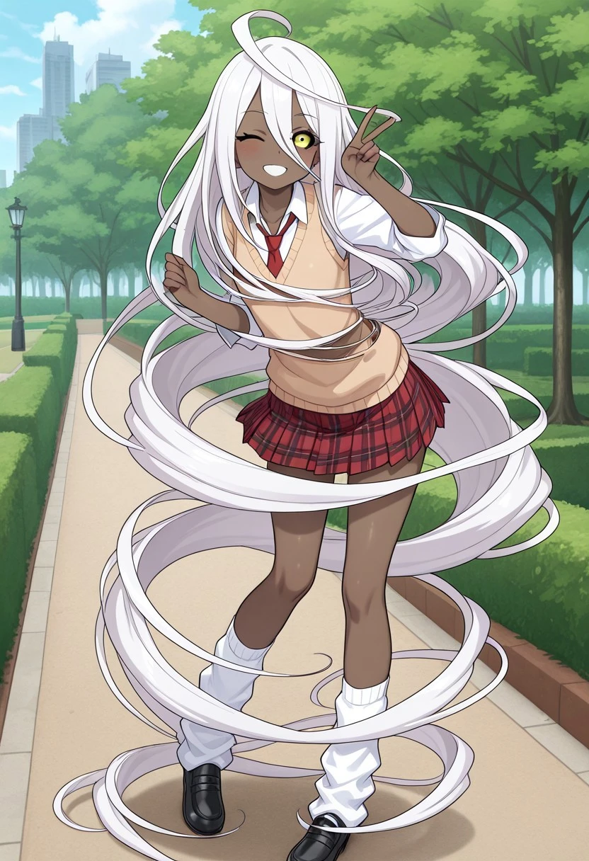 Main tags: mmDoppel, white hair, ahoge, absurdly long hair, dark skin, dark-skinned female, brown skin, yellow eyes, black sclera, monster girl