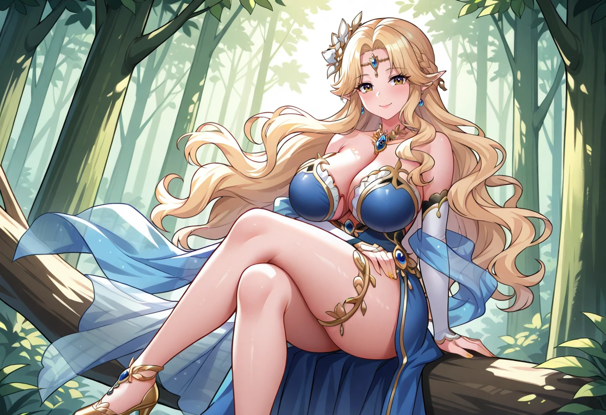 Selentina, pointy ears, 1girl, solo, long hair, blonde hair, parted bangs, braid, wavy hair, hair ornament, hair flower, yellow eyes, large breasts, earrings, yellow nails