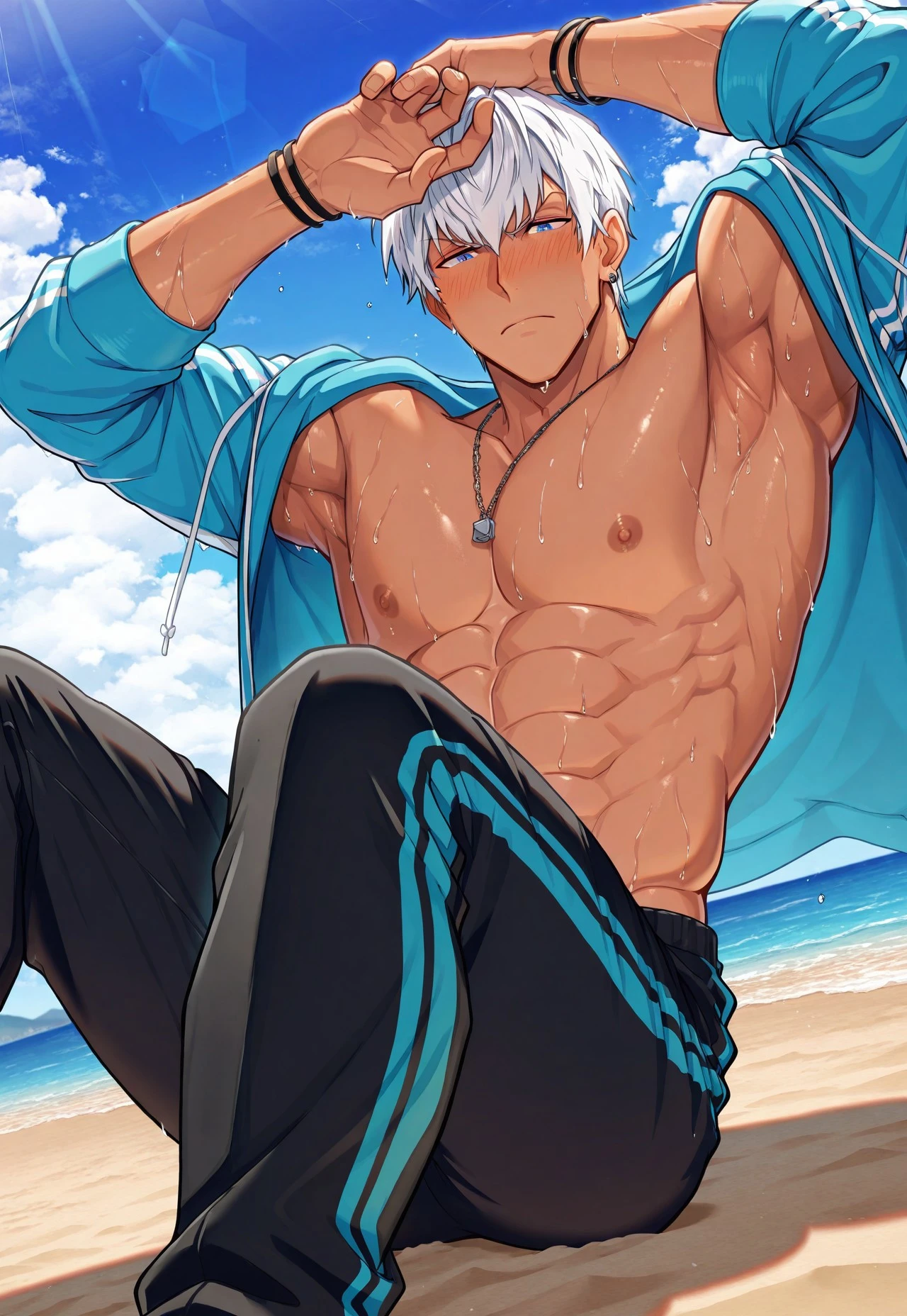 Summer outfit: 0sc4r_hs, dark-skinned male, white hair, blue eyes, necklace, bracelet, blue hoodie, open hoodie, pants, male swimwear