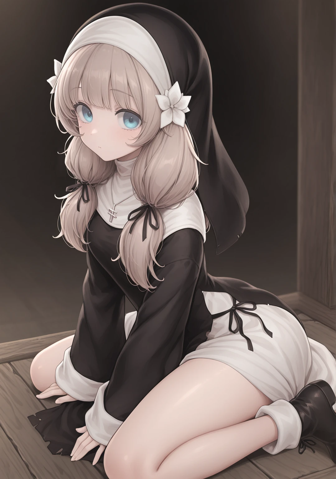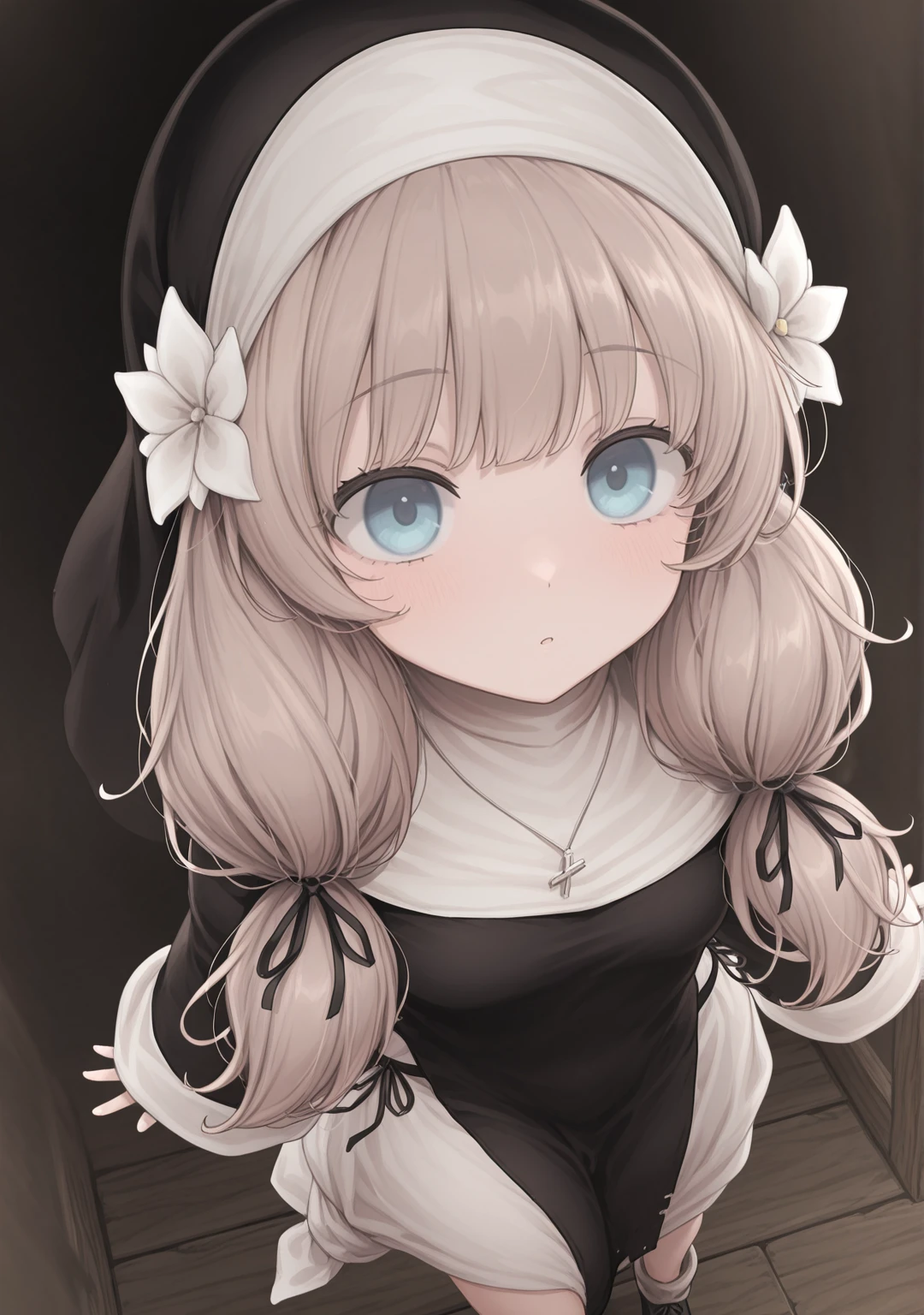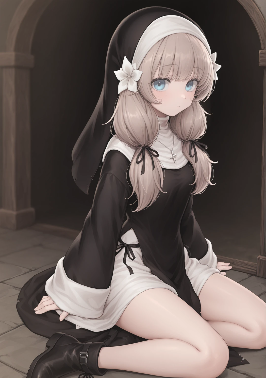 recommend:light brown hair,blue eyes,nun,traditional nun,habit,long hair,low twintails,small breasts,black dress,long sleeves,wide sleeves,sleeves past wrists,black ribbon,hair ribbon,hair flower,white flower,hair ornament,jewelry,necklace,cross necklace,ankle boots,black footwear,