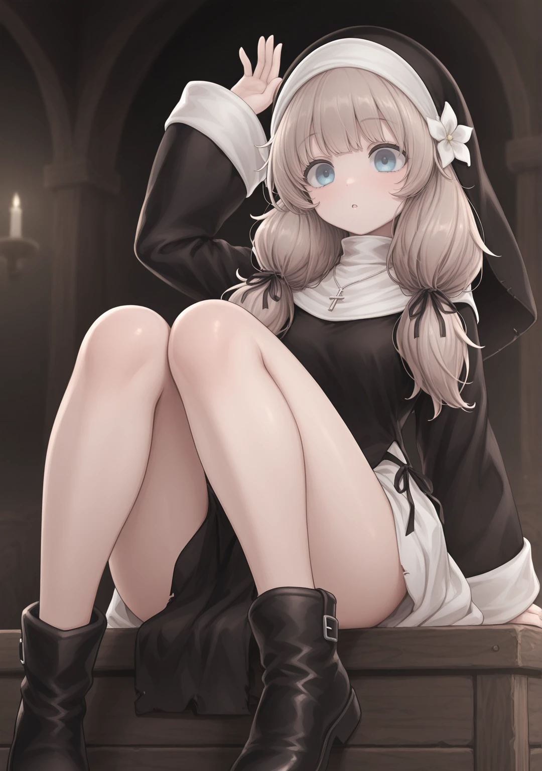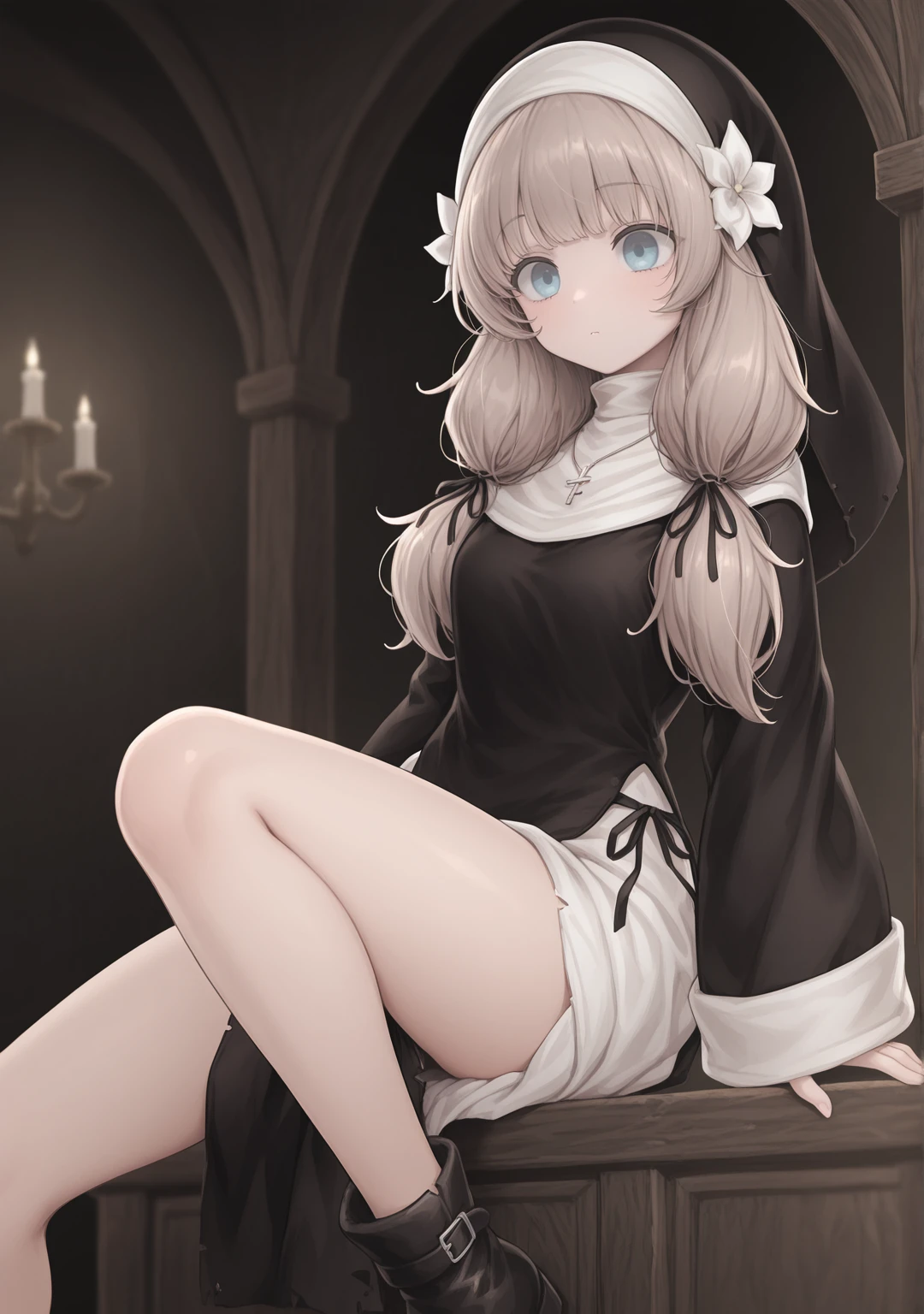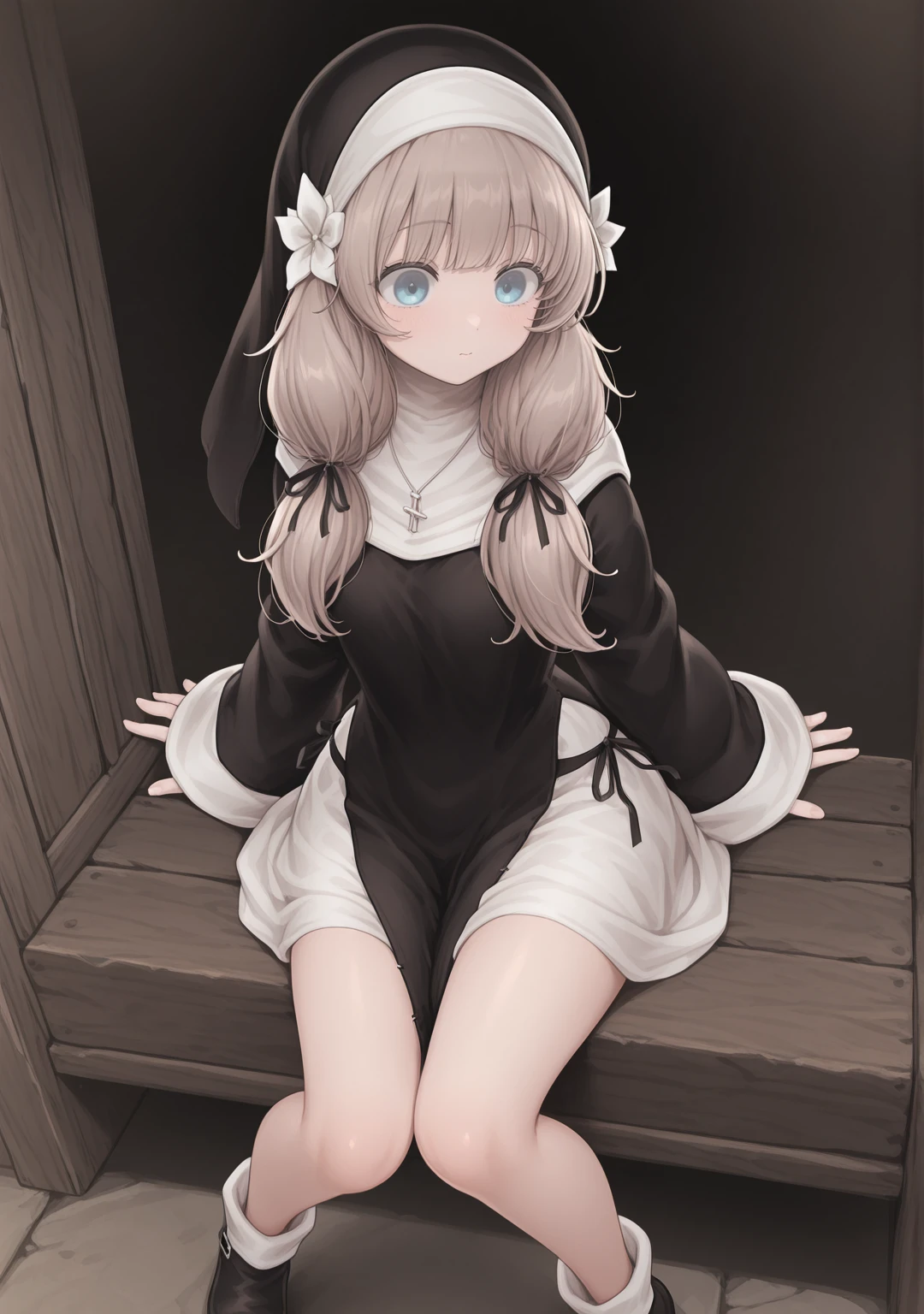 recommend:light brown hair,blue eyes,nun,traditional nun,habit,long hair,low twintails,small breasts,black dress,long sleeves,wide sleeves,sleeves past wrists,black ribbon,hair ribbon,hair flower,white flower,hair ornament,jewelry,necklace,cross necklace,ankle boots,black footwear,
