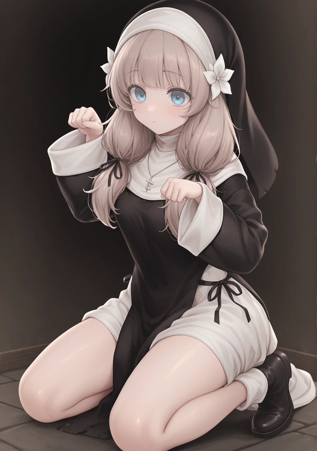 light brown hair,blue eyes,nun,traditional nun,habit,long hair,low twintails,small breasts,black dress,long sleeves,wide sleeves,sleeves past wrists,black ribbon,hair ribbon,hair flower,white flower,hair ornament,jewelry,necklace,cross necklace,ankle boots,black footwear,