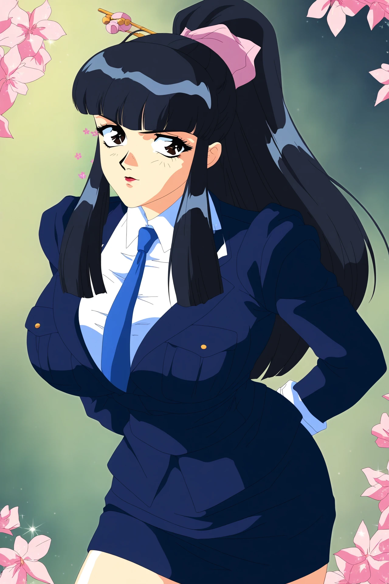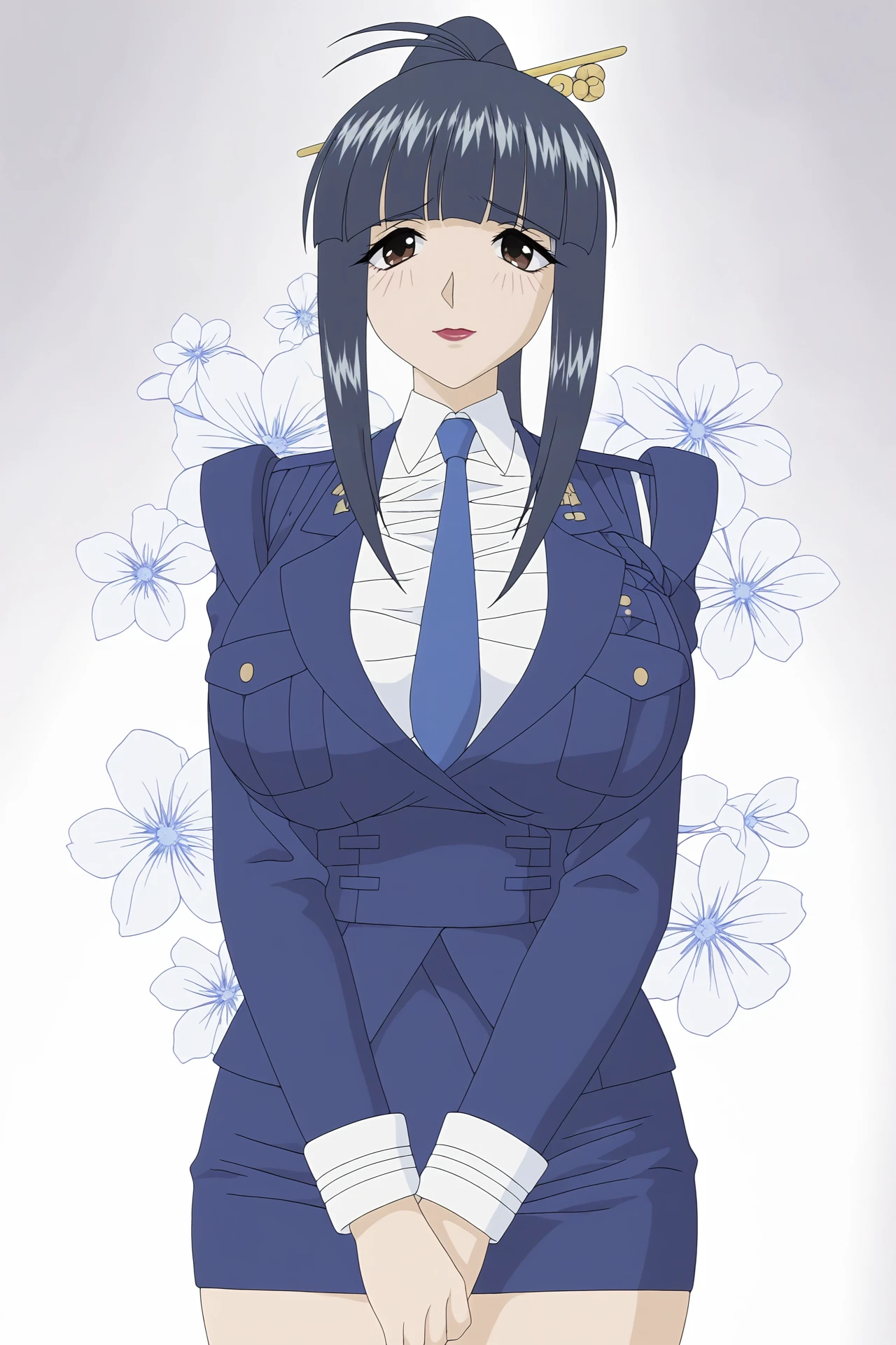 1girl,Ageha,solo,policewoman,OVA2+3,black hair,large breasts,long hair,brown eyes,blunt bangs,ponytail,sidelocks,lipstick,