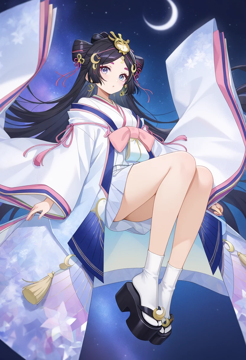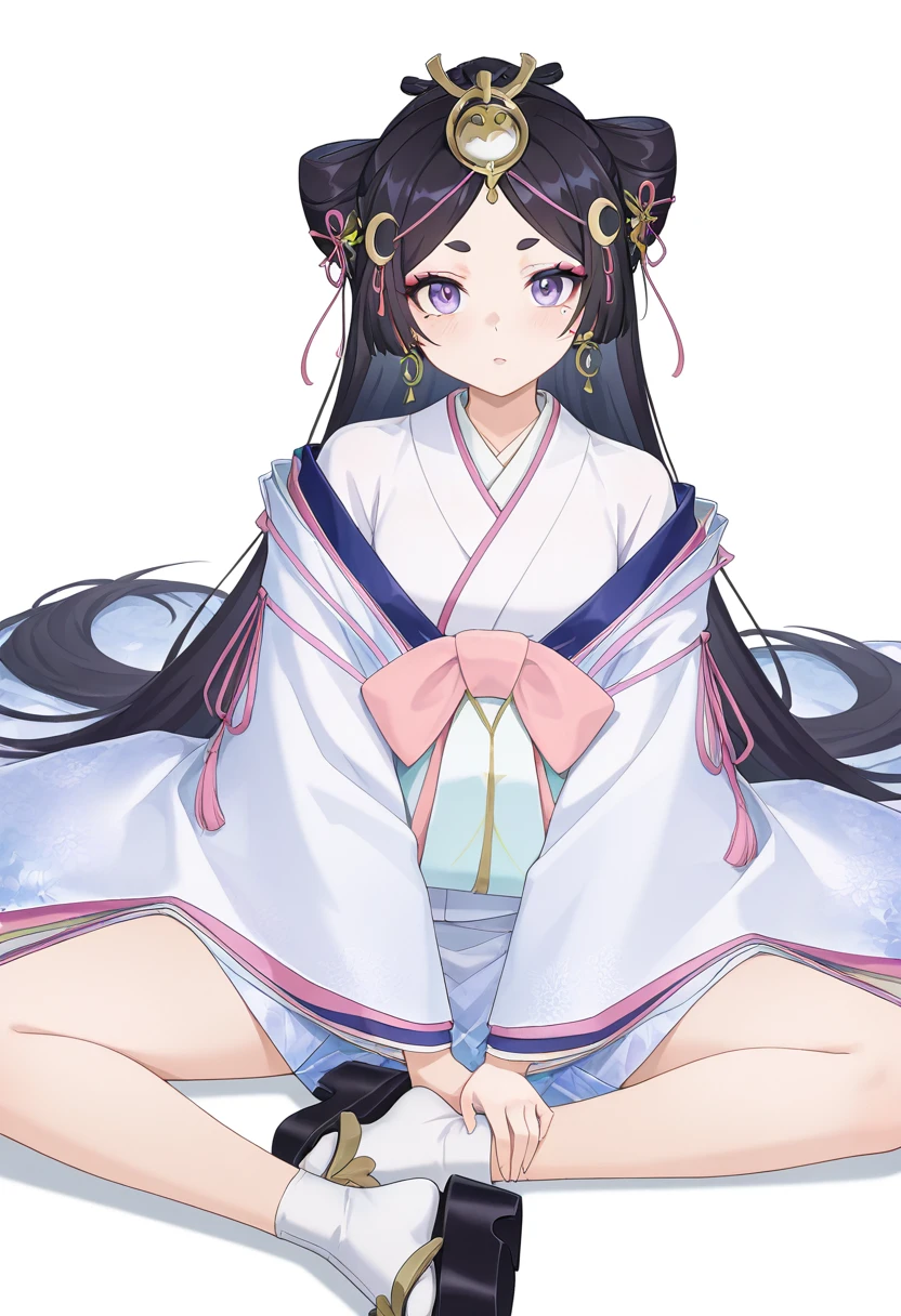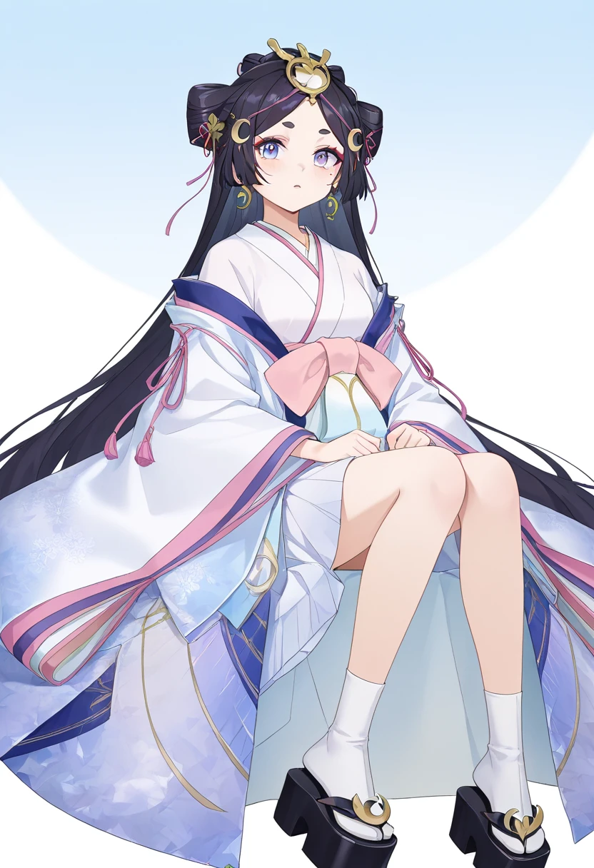 yinhuan,1girl,solo,blue eyes,purple eyes,eyeshadow,mole under eye,pink eyebrows,black hair,long hair,very long hair,parted bangs,hair ornament,headpiece,crescent hair ornament,white kimono,haori,off shoulder,long sleeves,wide sleeves,earrings,jewelry,pink bow,pink ribbon,tassel,tabi,white socks,platform sandals,okobo,geta,two side up,half updo,