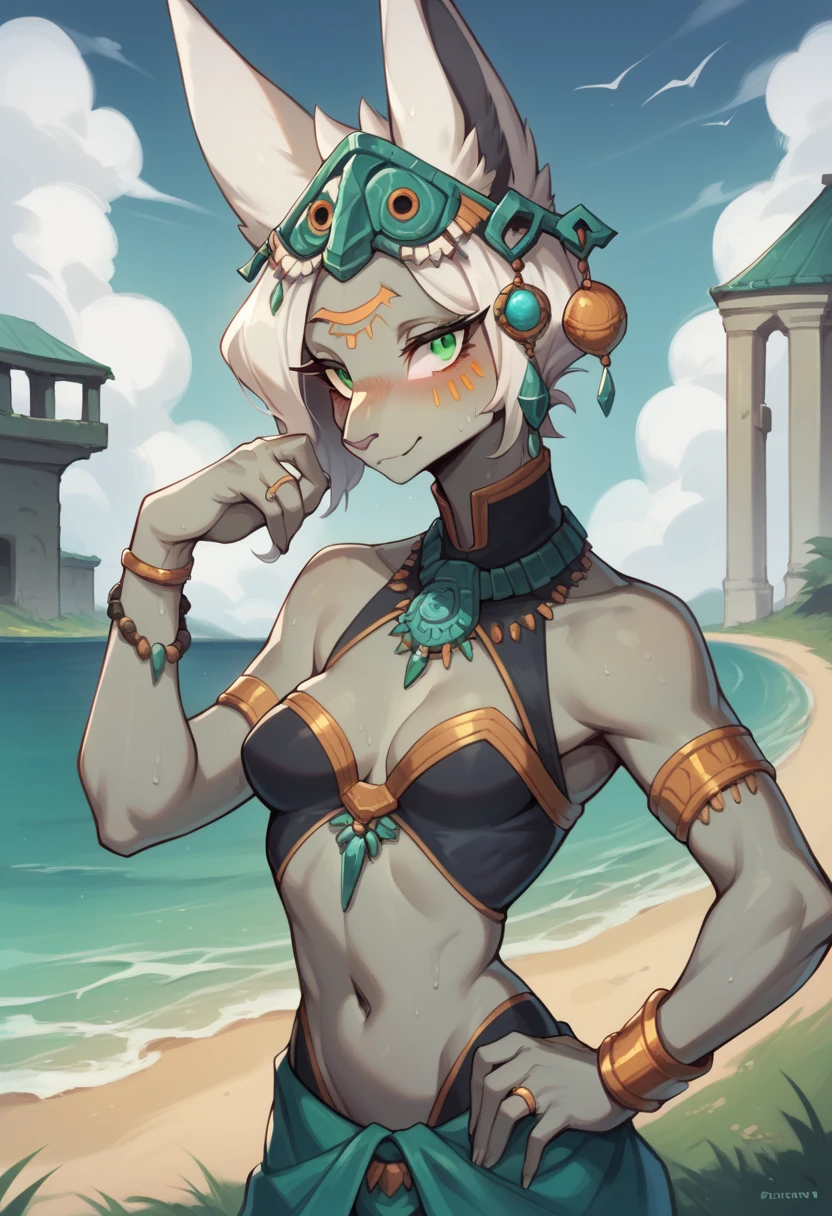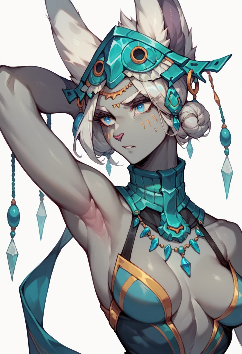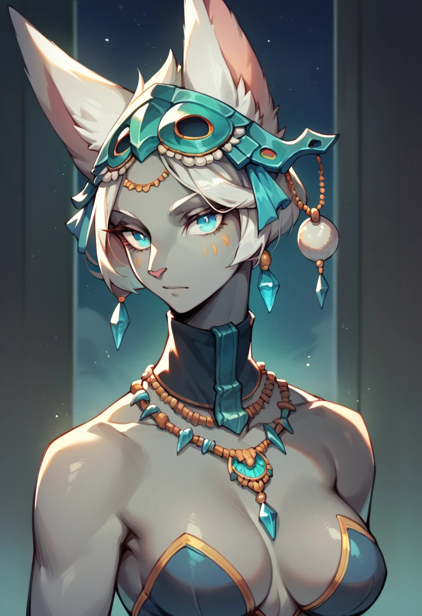 jewelry, animal ears, necklace, grey skin, short hair, white hair, earrings, blue eyes, furry, furry female, facial mark, ring, fingernails, earrings, bracelet, half-closed eyes, tall woman