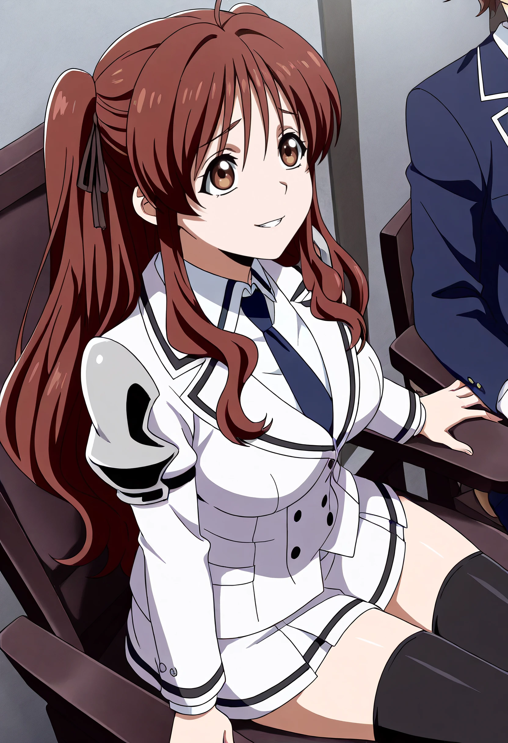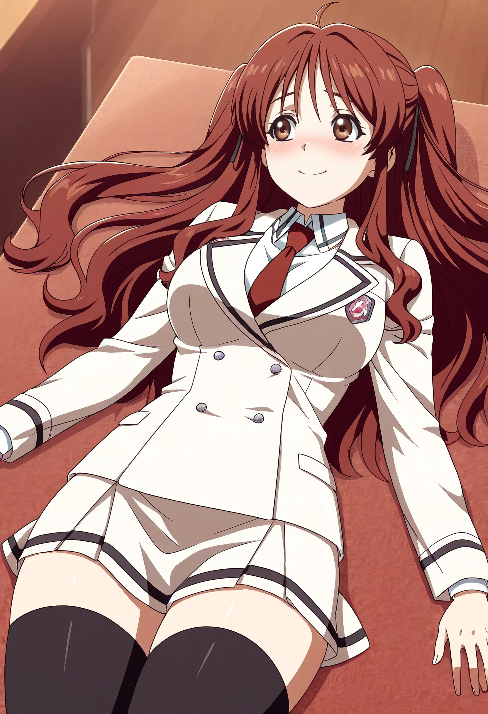 KobatoSchool, jacket, long sleeves, school uniform, necktie, collared shirt, shirt, white shirt, blazer, buttons, uniform, wing collar, double-breasted, thighhighs, ribbon,