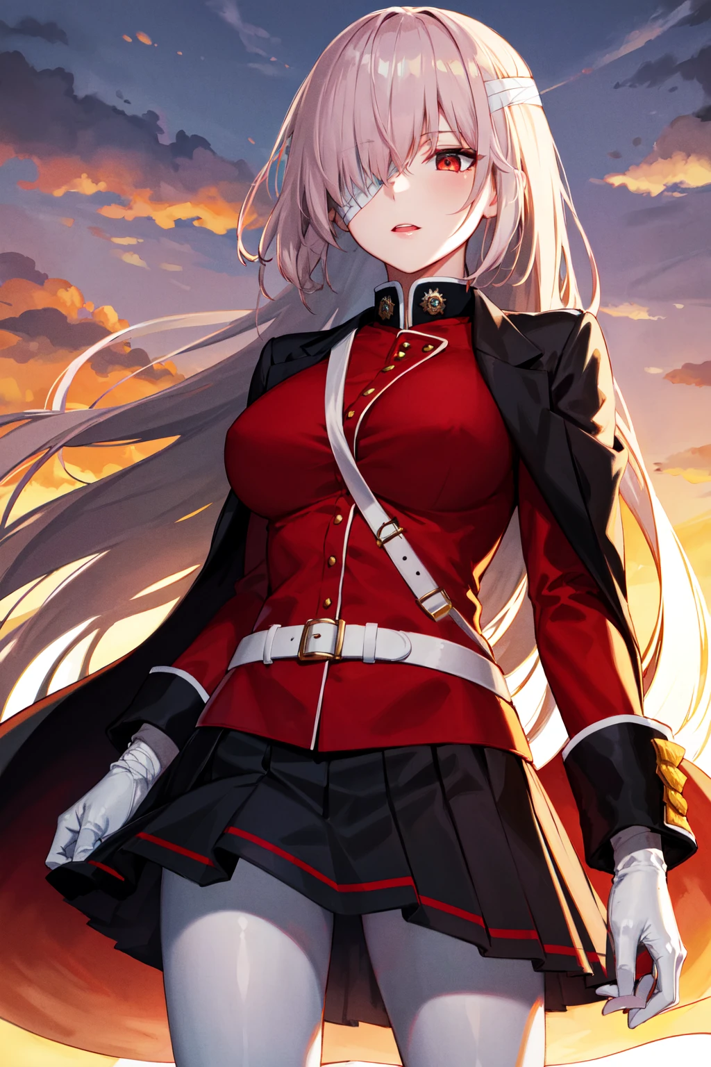 outfit2bbfng, long hair, large breasts, bandage over one eye, black coat, coat on shoulders, military uniform, red jacket, long sleeves, white gloves, belt, pleated skirt, black skirt, white pantyhose