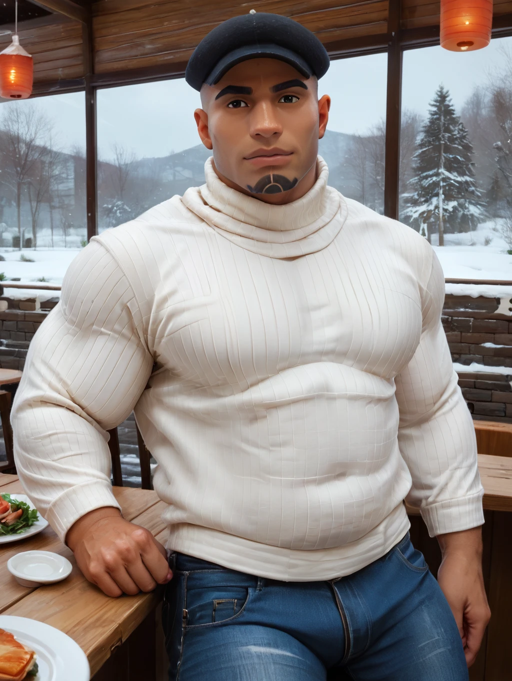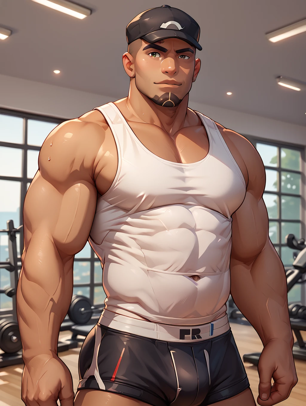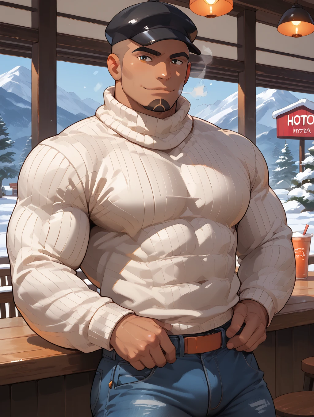 muscular, bara, (white t-shirt:1.3), jeans, black headwear, tan, looking at viewer